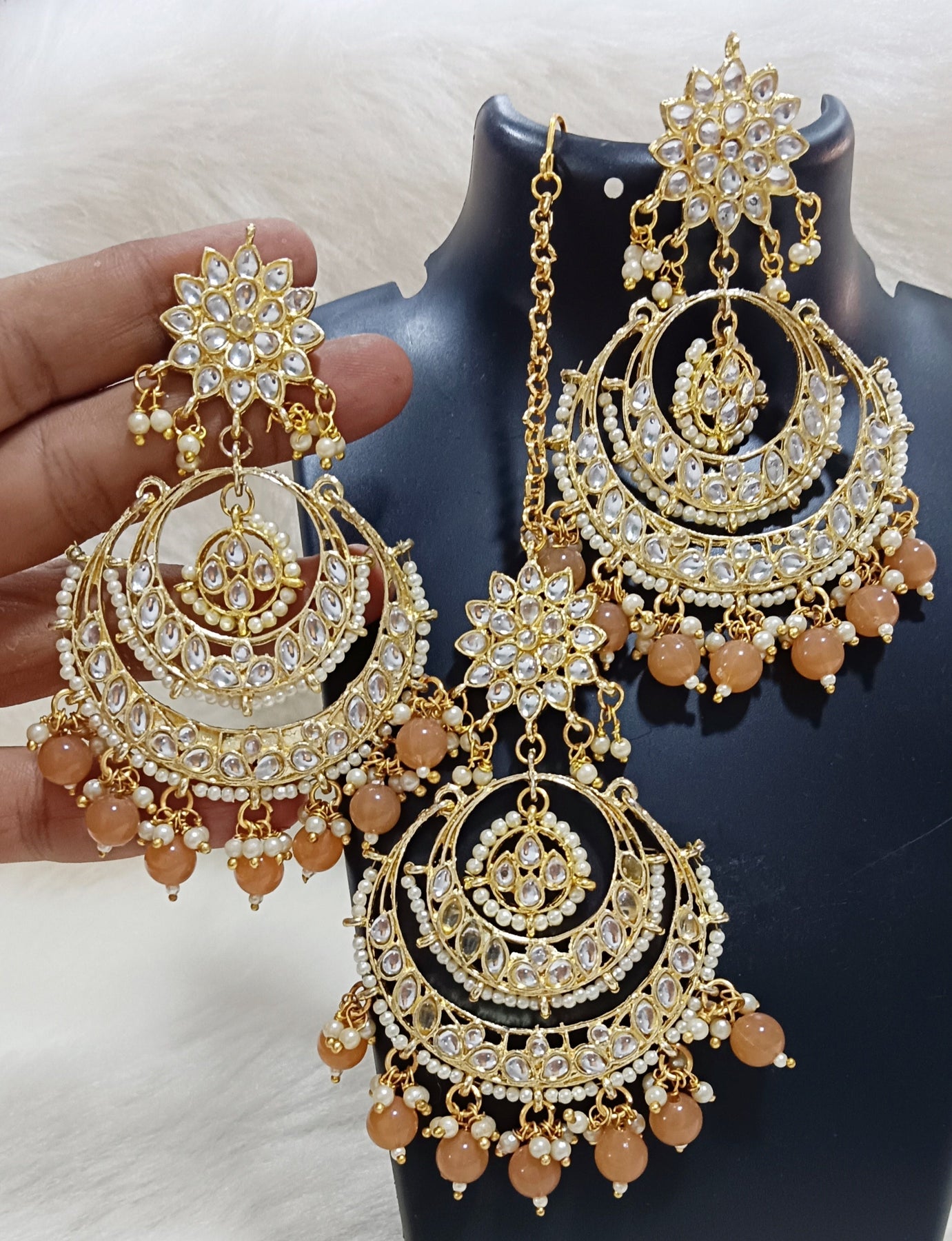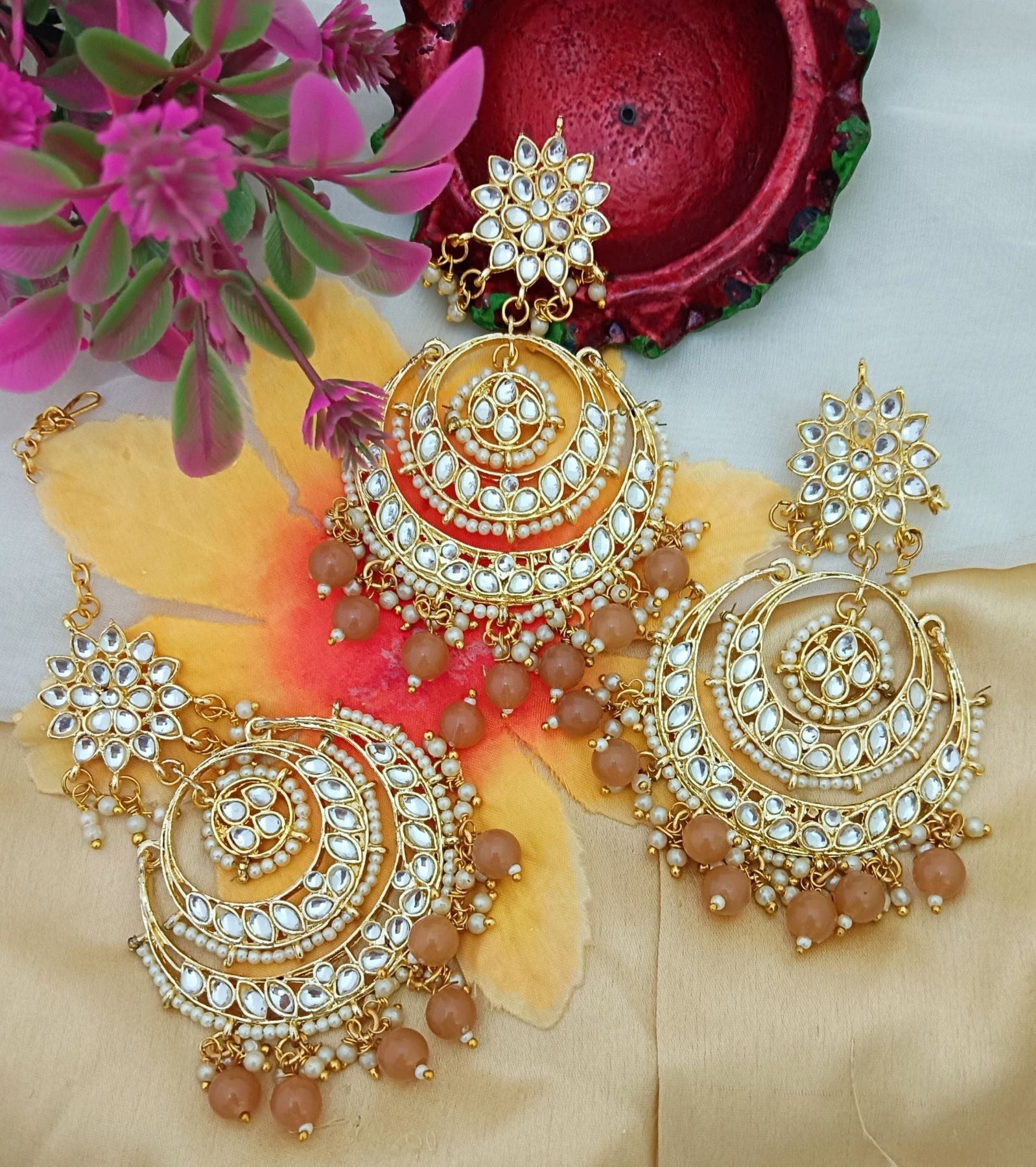 Peech Pearls Kundan Chandbali Earrings Tikka Set