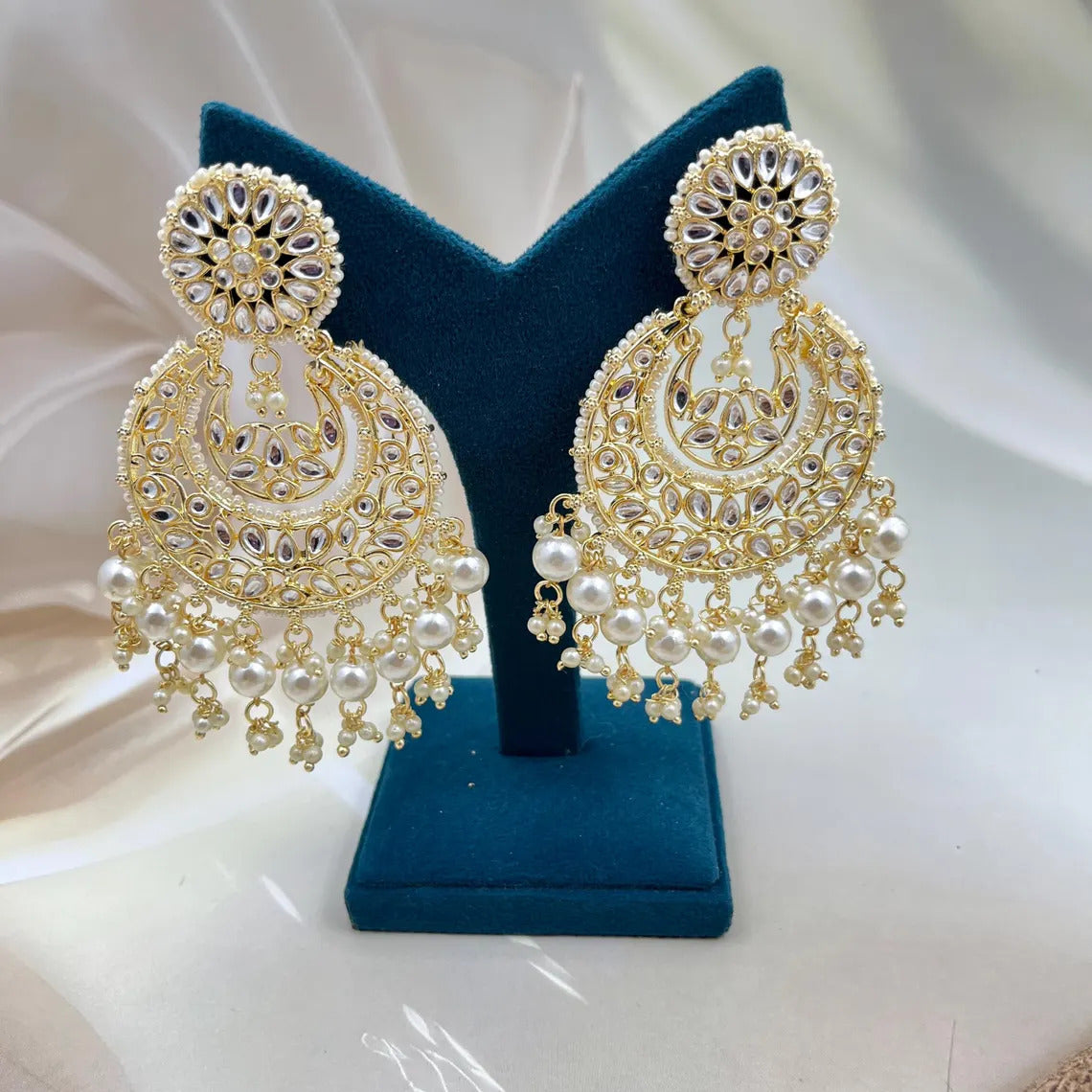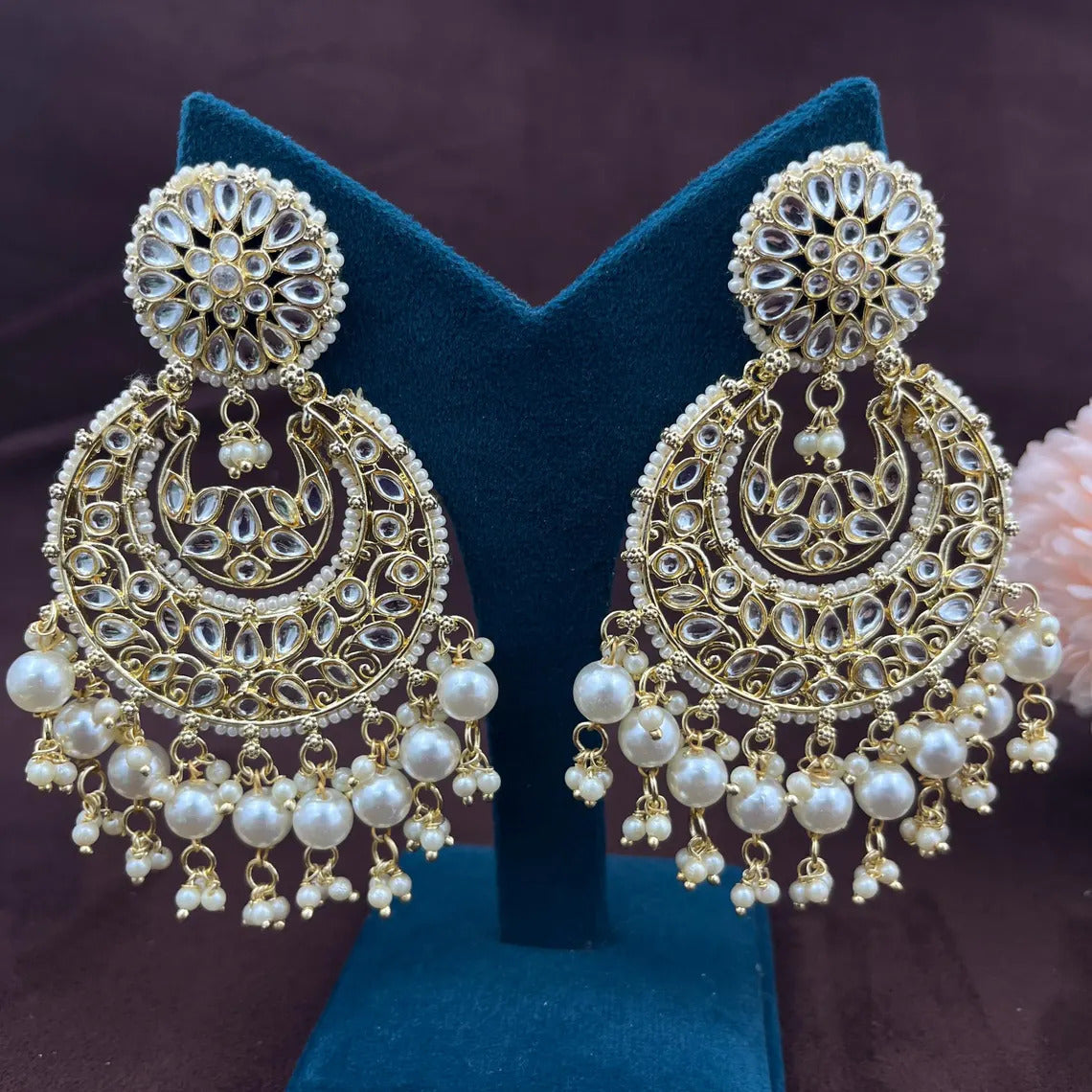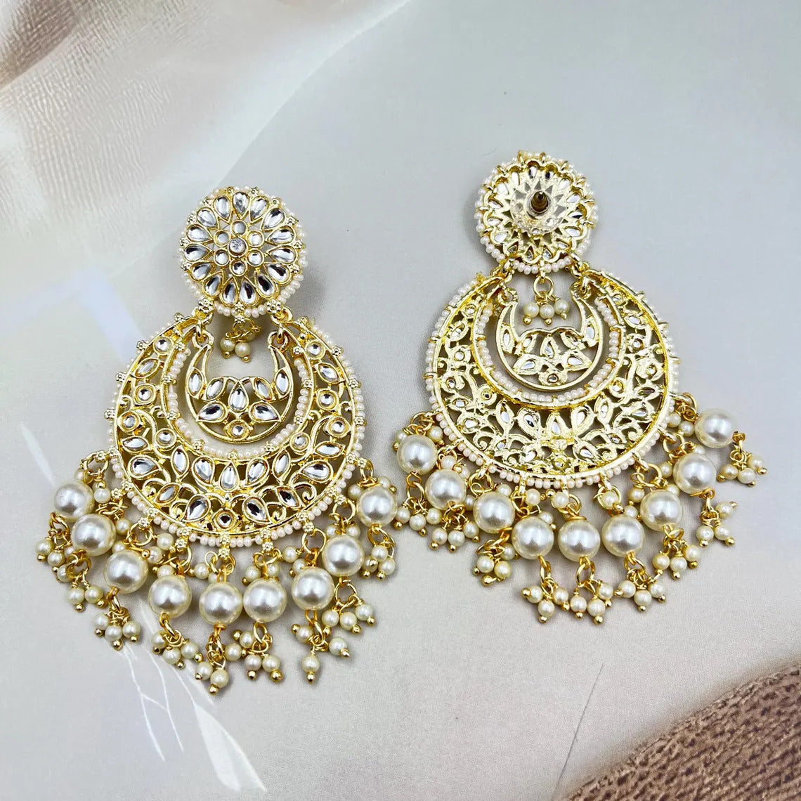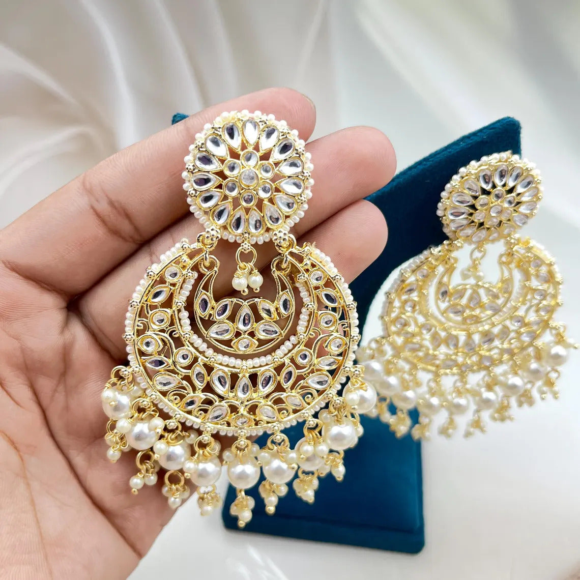 Gold-Plated Pearl Chandbali Earrings – Traditional Indian Ethnic Jewelry With Kundan Work