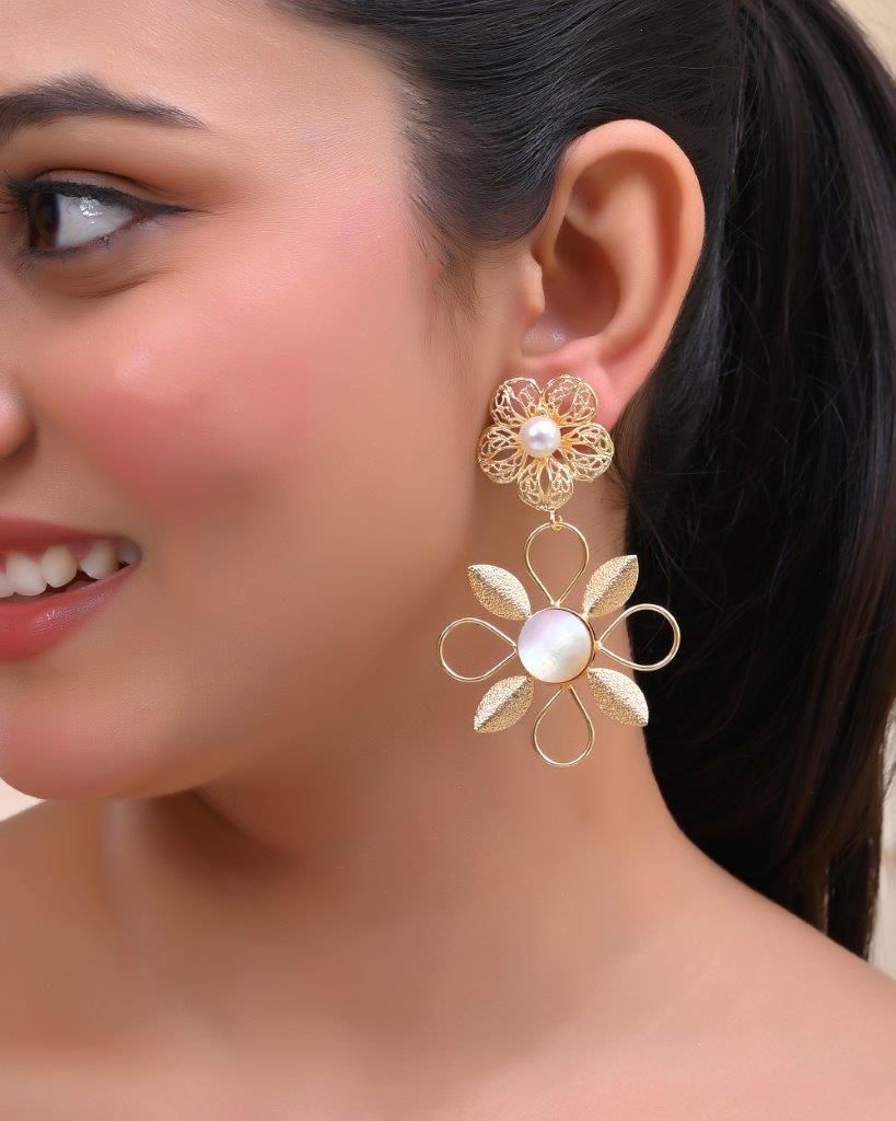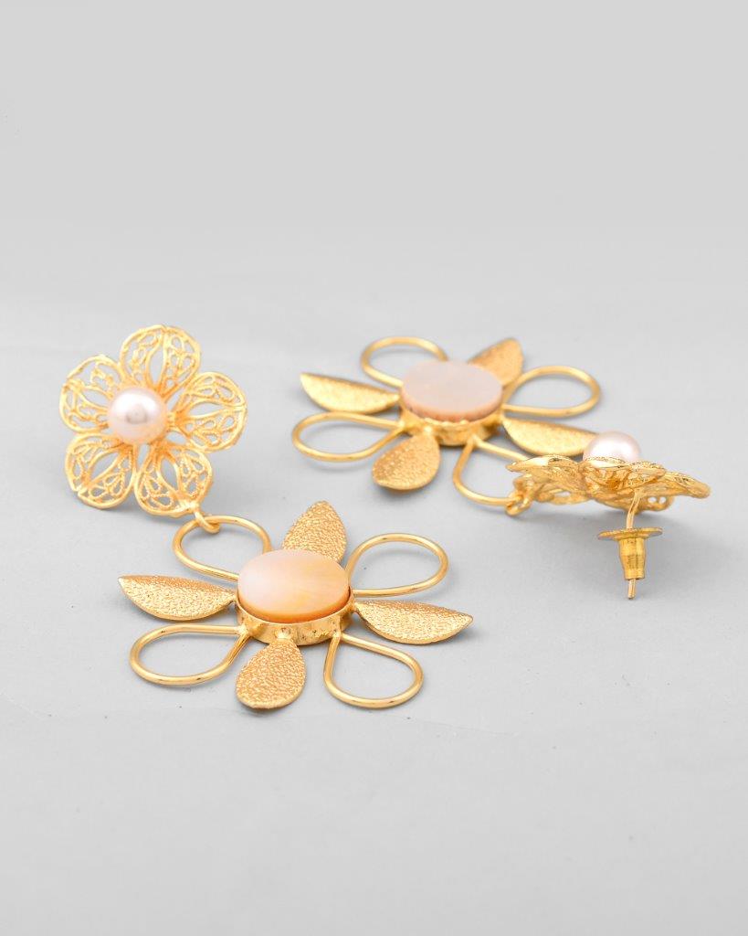 Elevate Your Jewelry Collection With Our Gold Plated Pearl Studded Flower Shaped Drop Earrings. These Exquisite Earrings Feature A Beautiful Flower Design, Adorned With Lustrous Pearls For A Touch Of Elegance. Perfect For Any Occasion, They Add A Sophisticated Flair To Both Casual And Formal Outfits. Lightweight And Stylish, These Earrings Are A Must-Have Accessory For Every Fashionista.