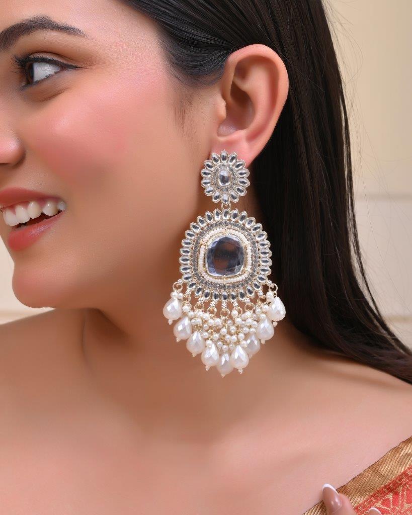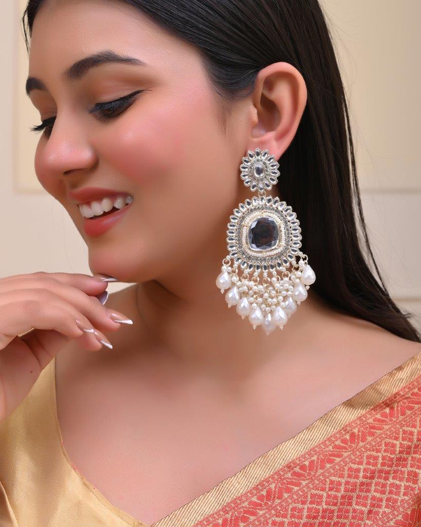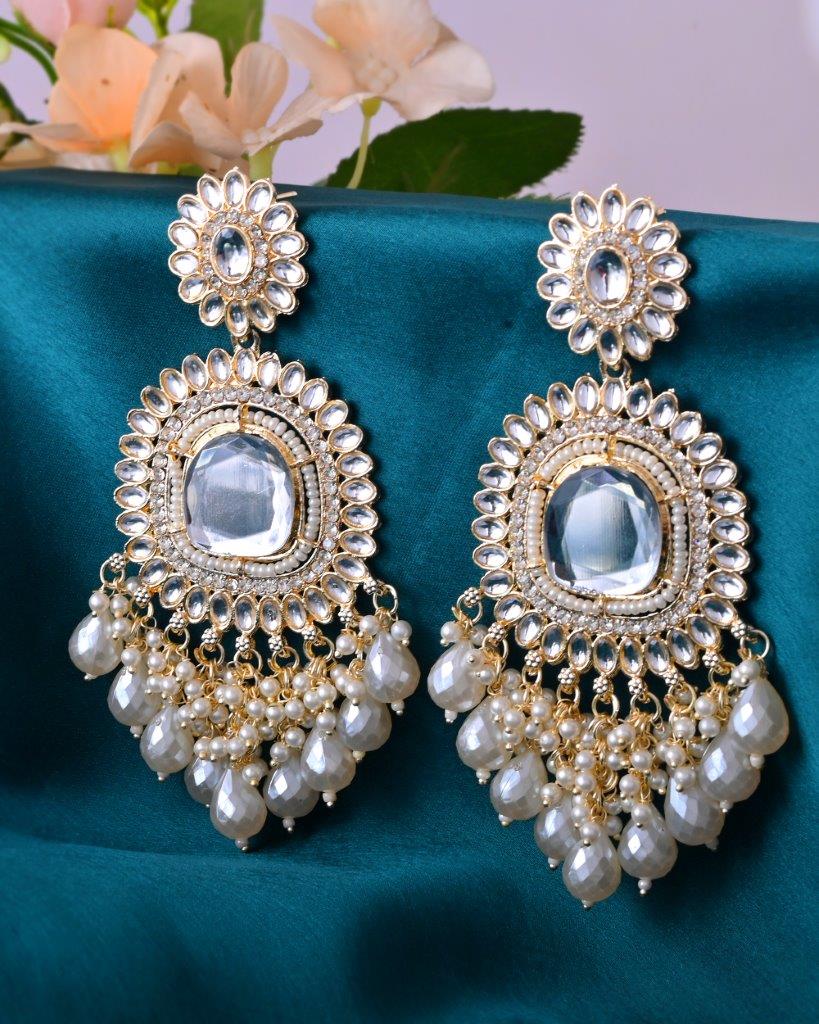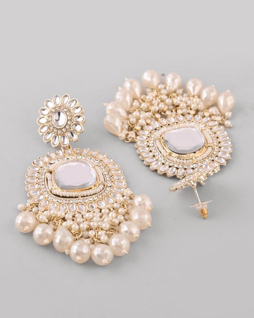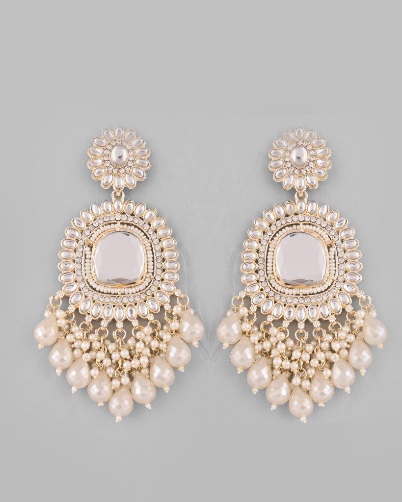 Illuminate Your Style With Our Gold Plated Kundan And Stone Studded Drop Earrings. These Stunning Earrings Feature Intricate Kundan Work, Beautifully Complemented By Sparkling Stones That Catch The Light With Every Movement. The Gold Plating Adds A Luxurious Touch, Making Them Perfect For Weddings, Parties, Or Special Occasions. Lightweight And Elegant, They Are A Must-Have For Every Jewelry Lover.