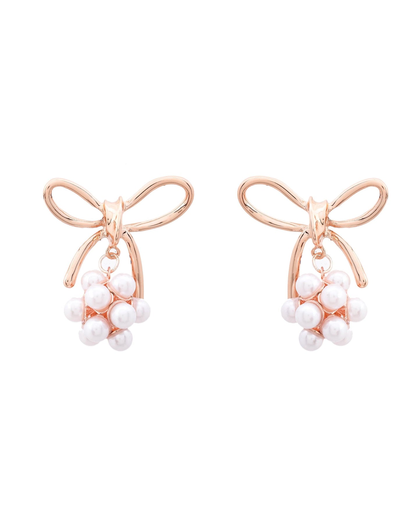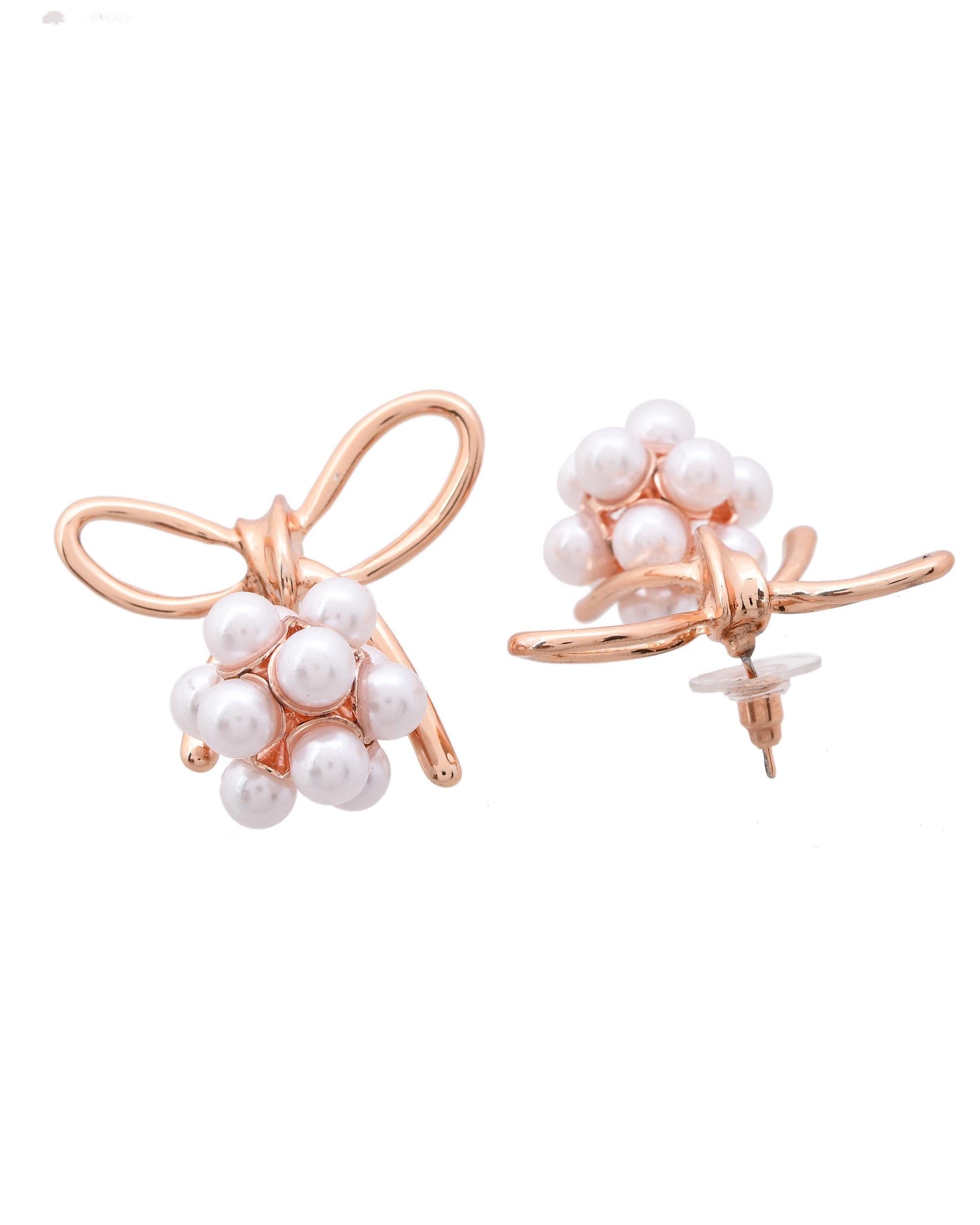 These Rose Gold-Plated Designer Earrings Feature Delicate Pearls Paired With A Charming Bow-Shaped Design, Creating A Perfect Blend Of Elegance And Femininity. The Soft, Luxurious Finish Of The Rose Gold Adds Warmth, While The Pearls Bring A Timeless Appeal. Ideal For Weddings, Parties, Or Special Occasions, These Earrings Effortlessly Elevate Your Look With A Graceful, Sophisticated Touch.