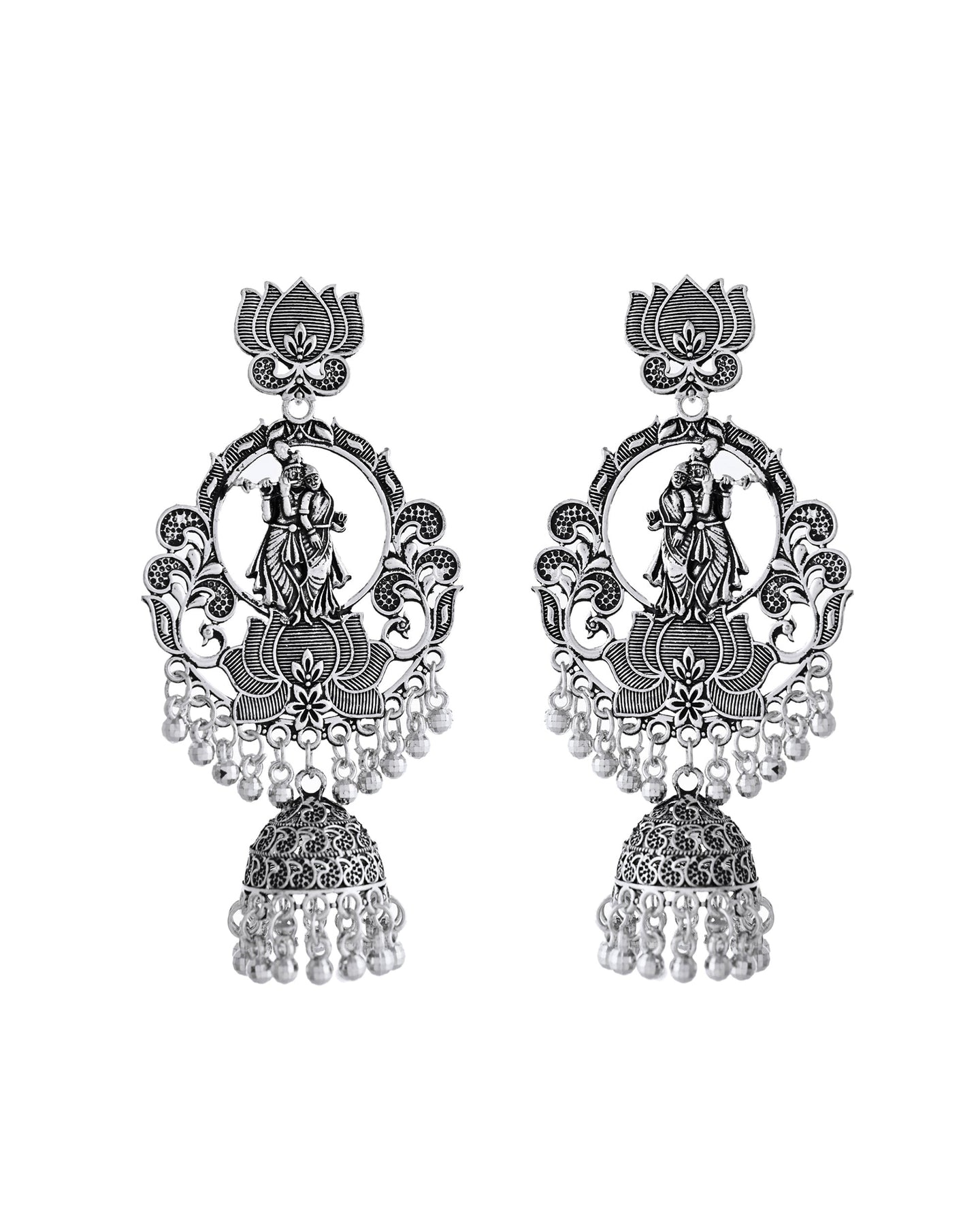 These Silver Plated Radha Krishna Shaped Oxidized Earrings Beautifully Capture Divine Artistry And Traditional Craftsmanship. Featuring Intricate Radha Krishna Motifs, The Oxidized Silver Finish Adds A Vintage Charm. Perfect For Spiritual Or Cultural Occasions, These Earrings Add A Unique, Meaningful Touch To Your Look, Making Them A Must-Have For Those Who Appreciate Sacred And Elegant Jewelry.