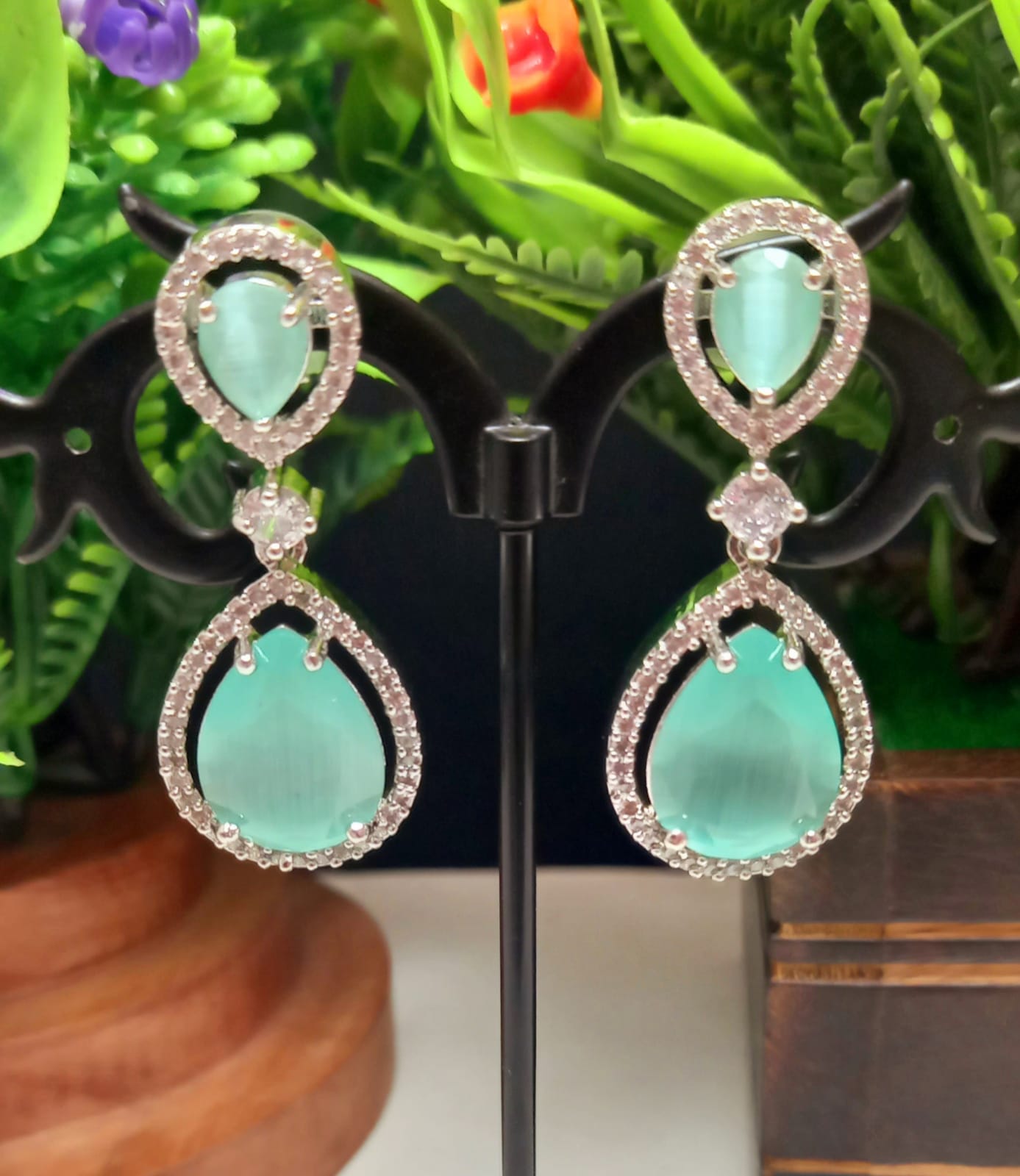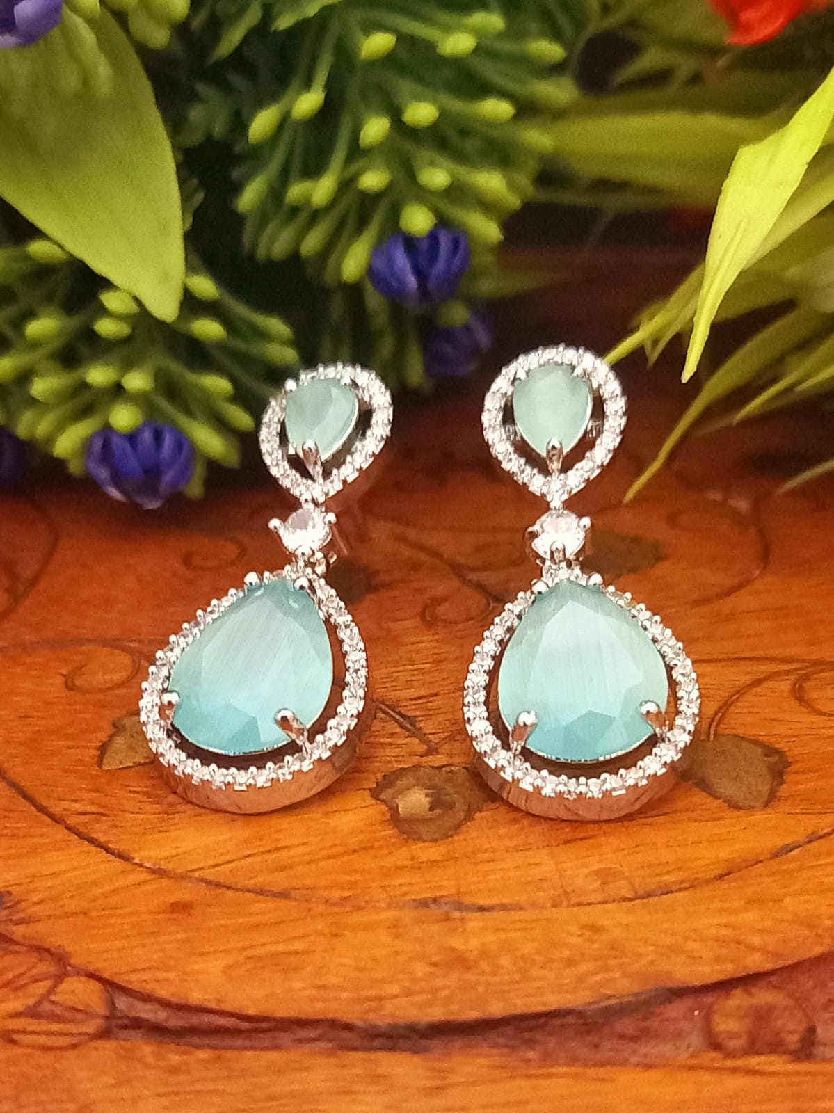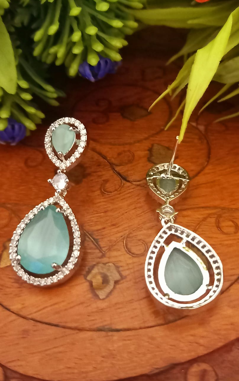 Green Colour Indian Jewellery American Diamond White Polish Earrings Danglers With Shiny Cut Stone