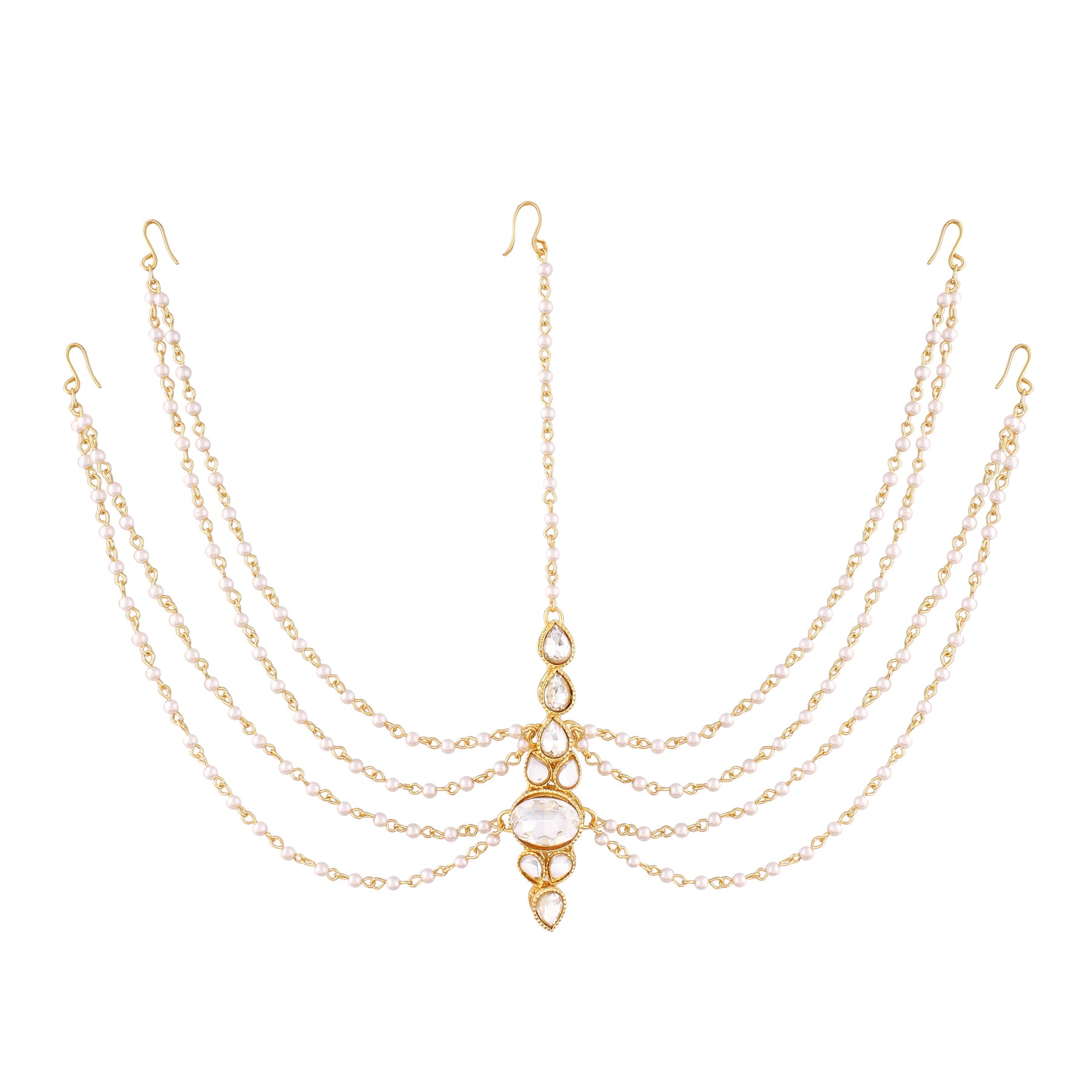 Elevate Your Bridal Ensemble With This Stunning Gold Plated Traditional Kundan & Pearl Matha Patti, Designed Specifically For Women. This Exquisite Headpiece Combines The Classic Beauty Of Kundan Stones And Pearls With Intricate Gold Plating, Creating A Regal And Timeless Accessory Perfect For Weddings And Festive Occasions. The Elegant Design Gracefully Frames The Face, Adding A Touch Of Sophistication And Tradition To Any Bridal Outfit, Ensuring You Stand Out With Elegance And Grace On Your Special Day.