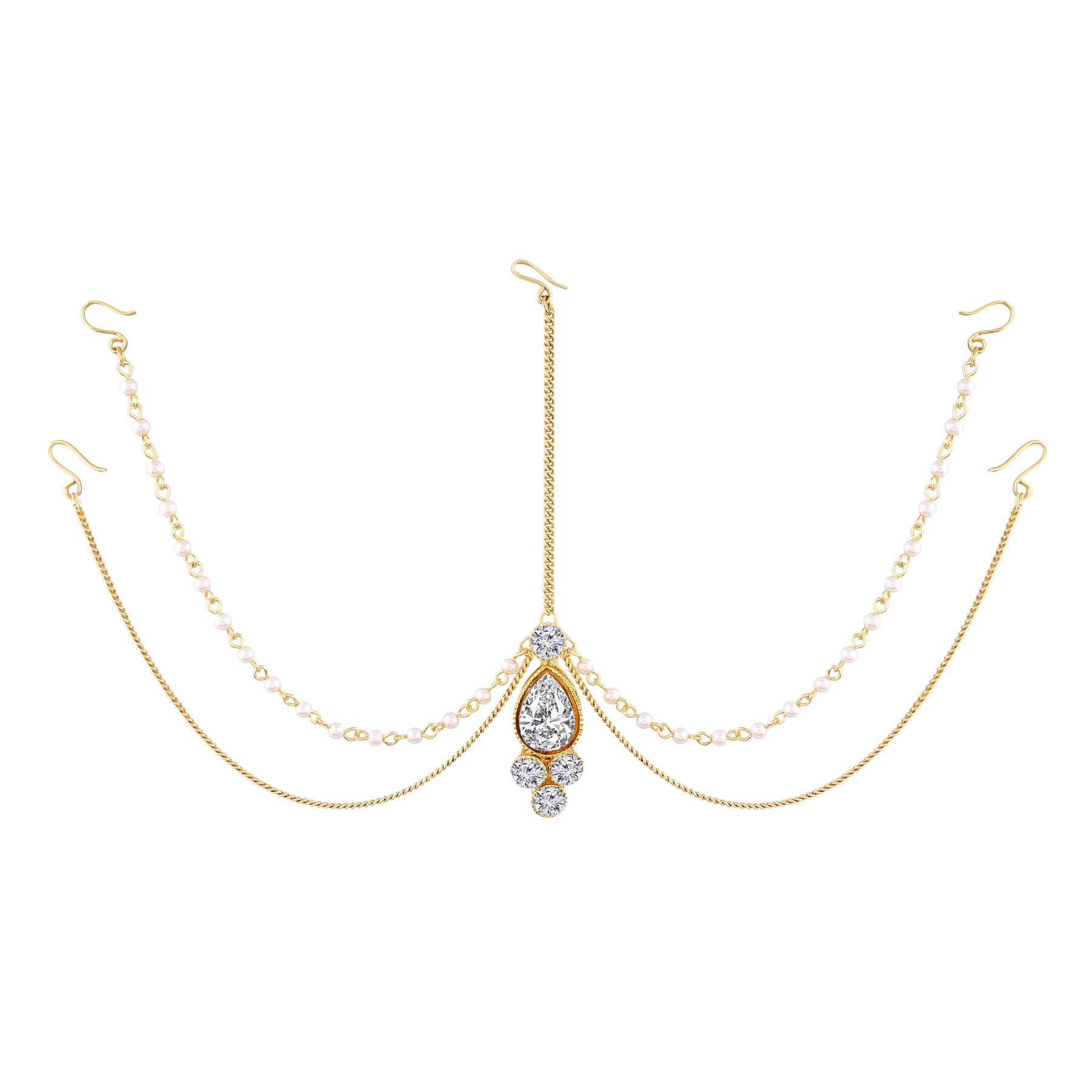 Gold Plated Bridal Chain Mathapatti - Never Allow Your Fashion Jewelry To Come In Contact With Harsh Chemicals, Oils, Nor Spray Perfumes Directly On Them. This Will Cause The Jewelry To Fade, Discolor, Or Even Ruin Them Completely. When You Want To Show Off Your Head The Accessory Is Beautiful Head Chain. Brings The Rhinestone Head Chain With The Two Layer Of Chain One Layer Is Of Tassel Chain And The Other Layer Is Decorated Stones. The Beautifully Made Head Chain Is Of Zinc Material. Care Instruction: Keep Away From Water, Spray And Perfumes For Better Look.