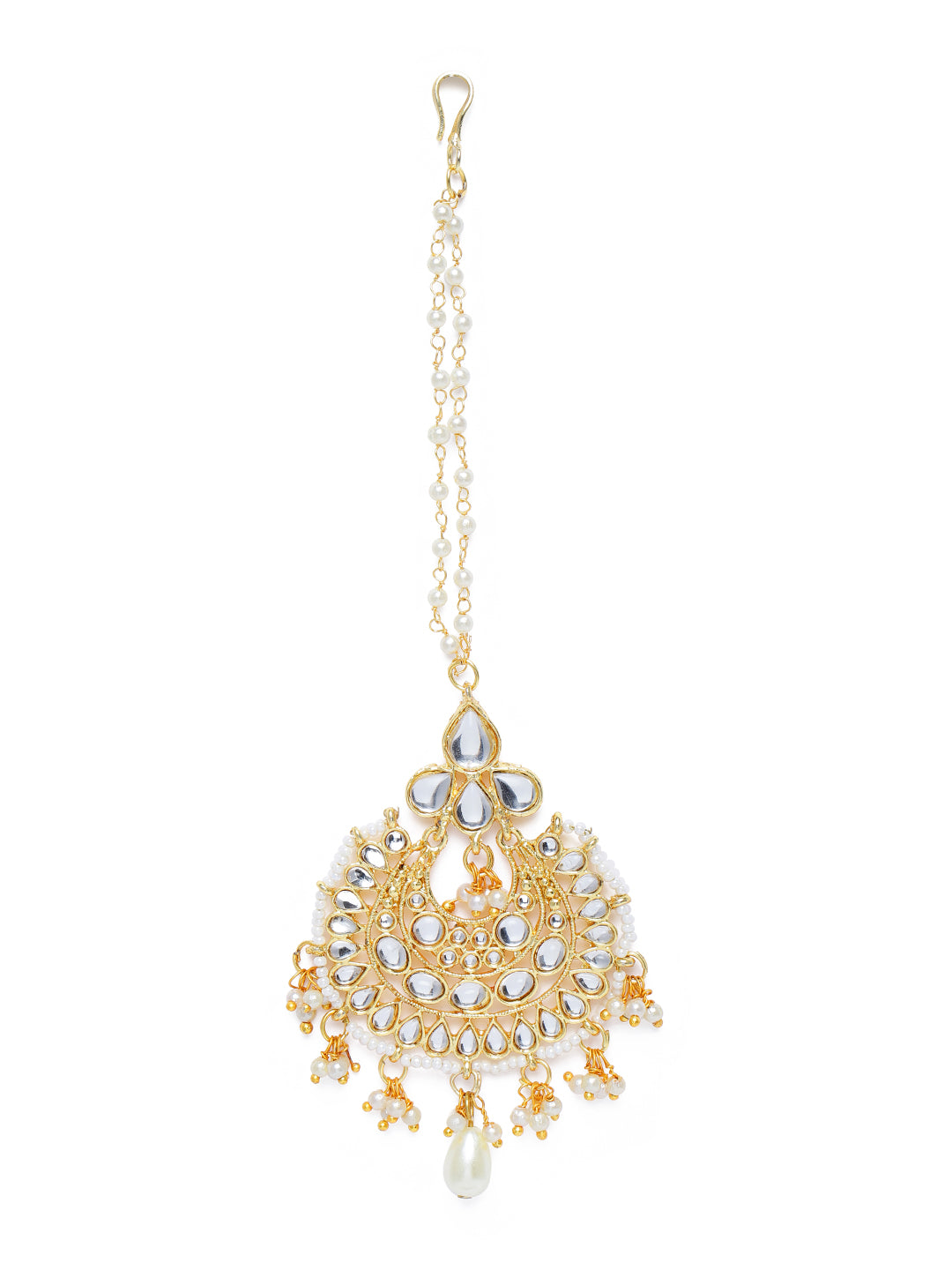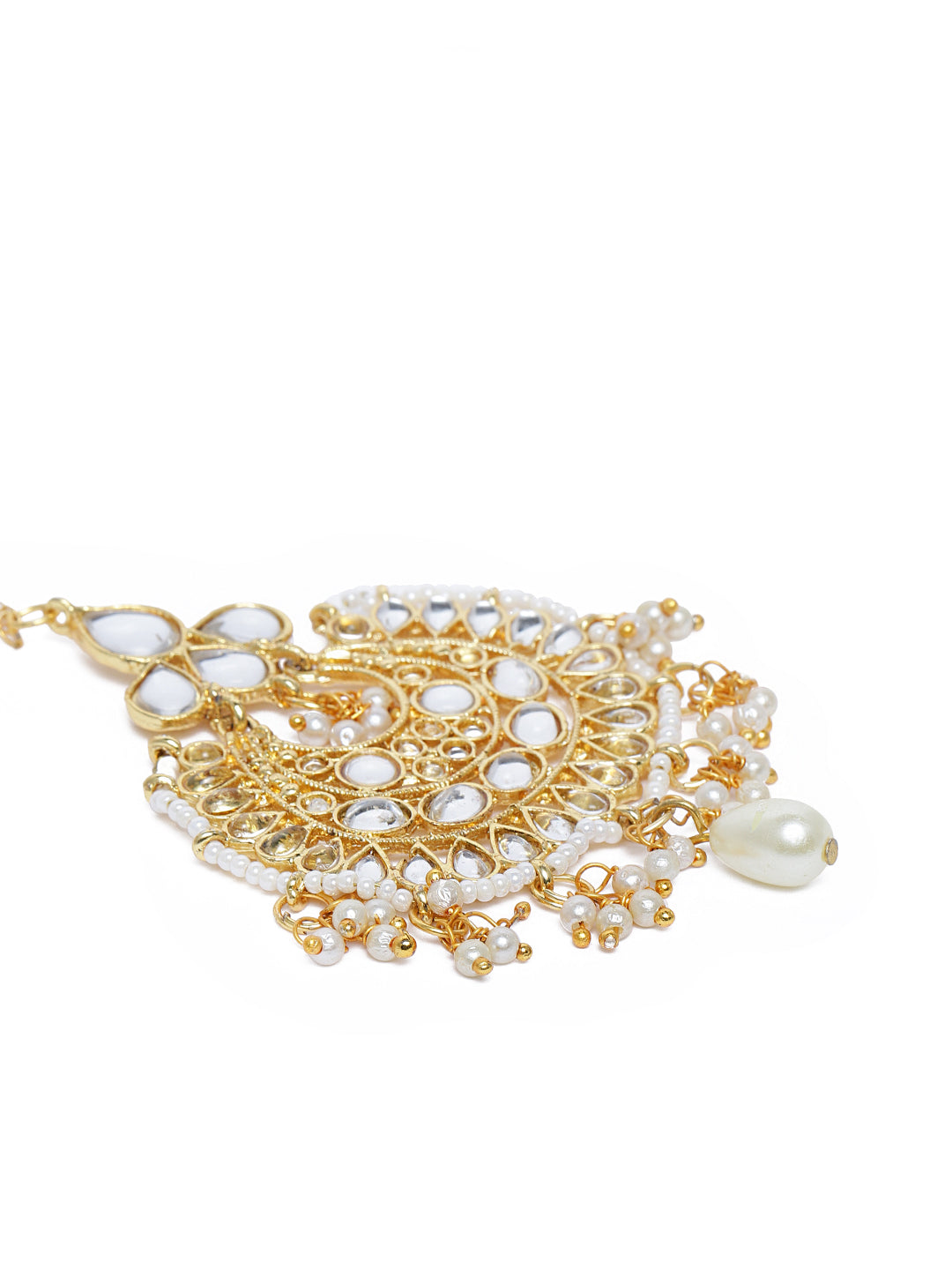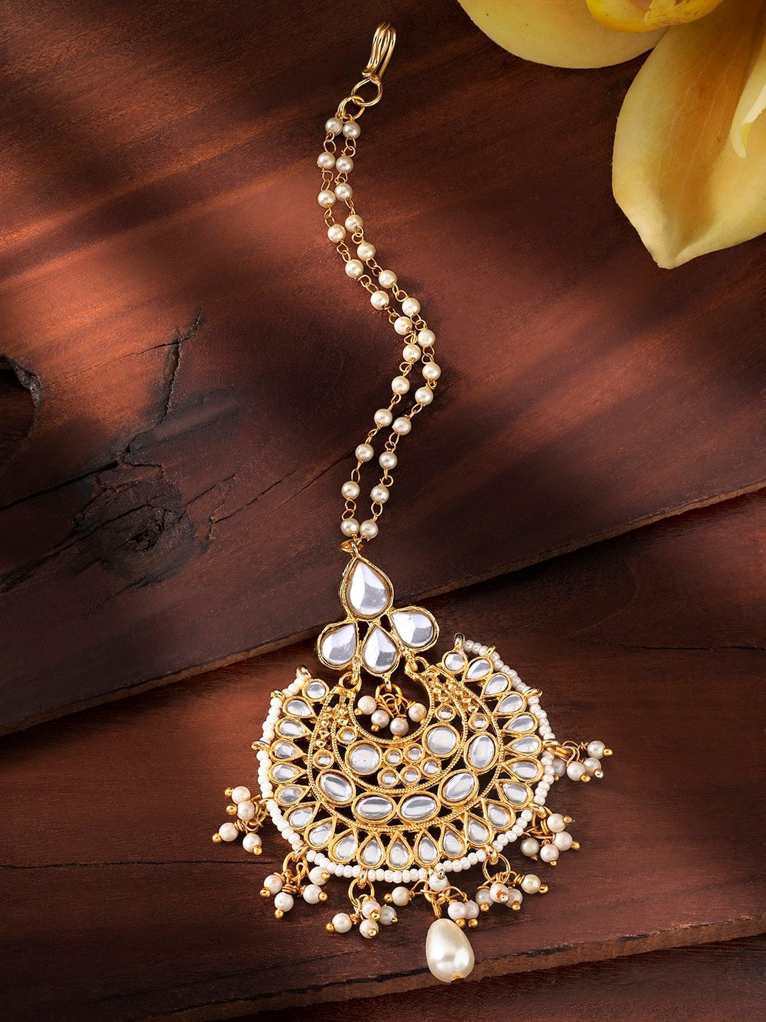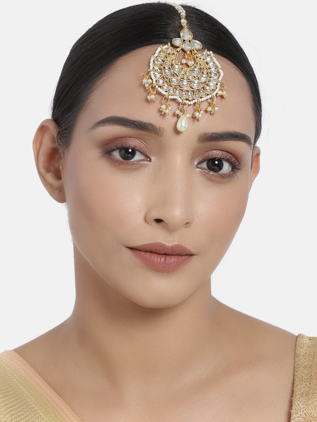This Maang Tikka Is Crafted In 18K Gold-Plating And Features Kundan Studded In It And Secured With A Hook Closure. Style This As Maang Tikka Or Passa With Your Ethnic Attires To Complete The Look. Perfect Accesory For Your Jewelry Box!