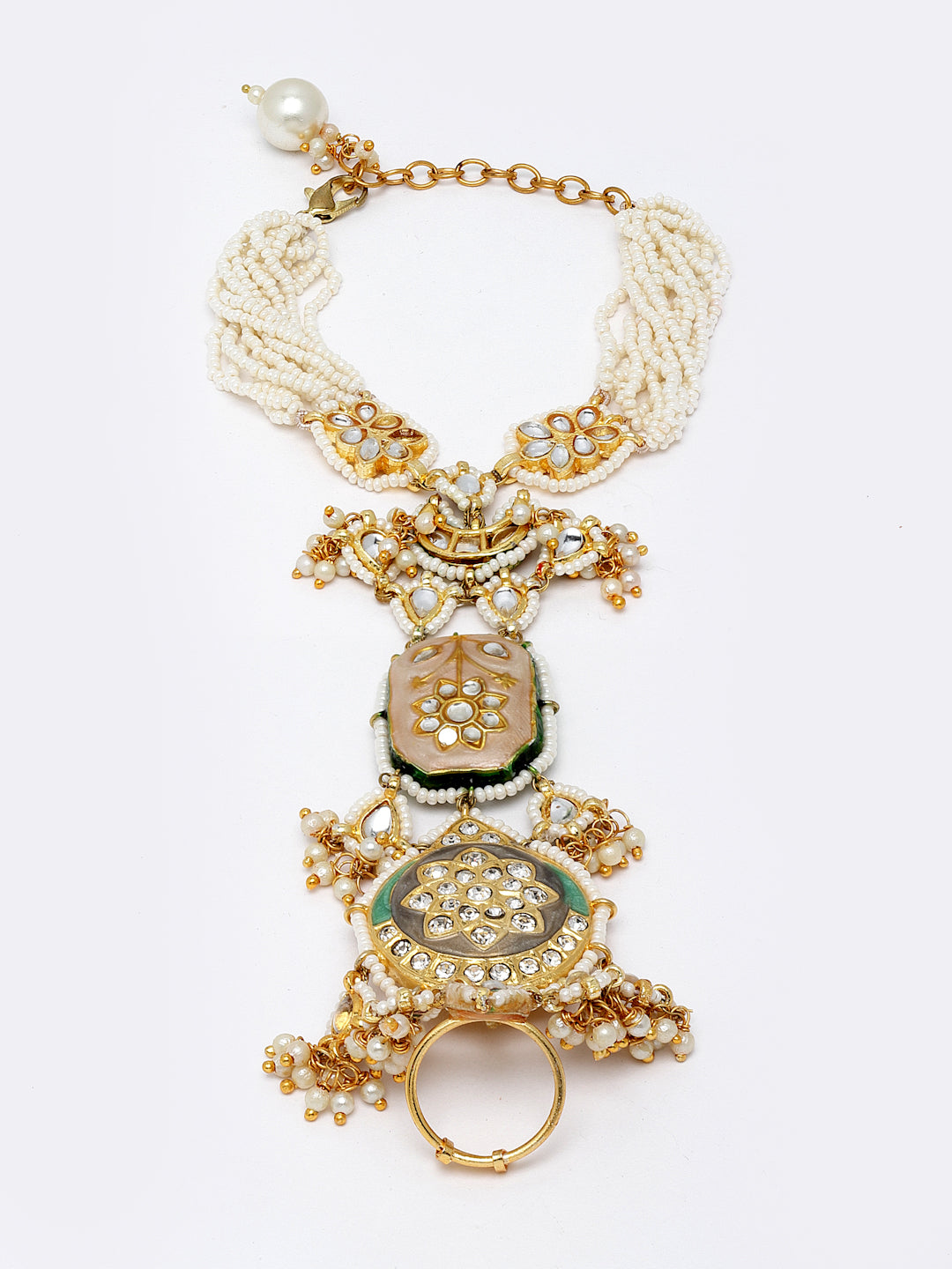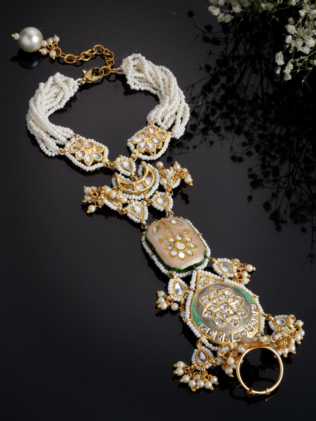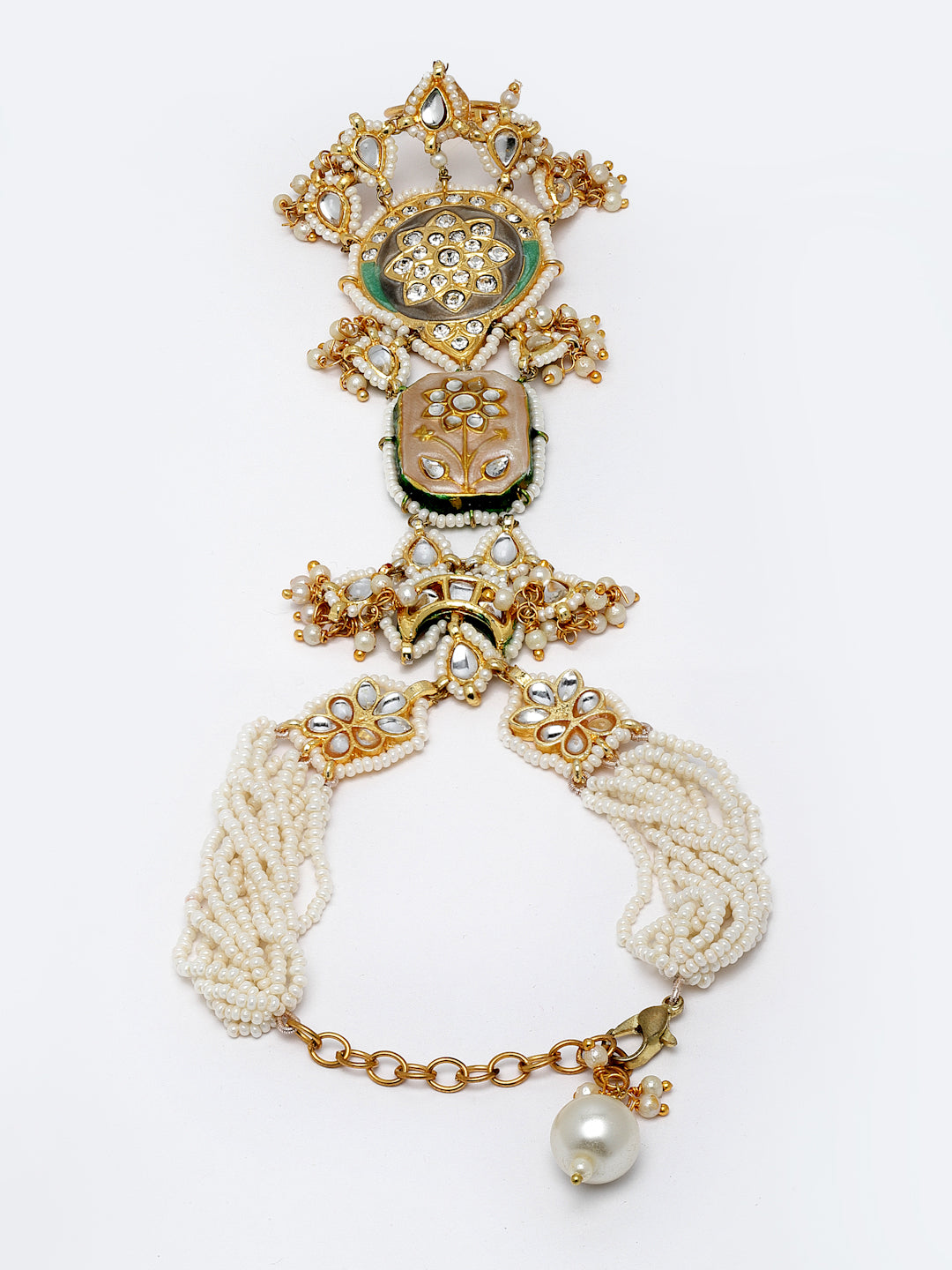 Meenakari And Kundan Amalgamated With Pearls Is What Makes This Hathful Super Classy. This Festive Season Flaunt This With Best Version Of Yourself.; Category Of Jewellery Is Hand Jewellery; Sub Category Is Hath Phool; Ideal For Women; Color Is Pink, Green, Grey, White, Gold; Gemstones Used - American Diamond, Pearls, Natural Stones; Plating Is Gold-Plated; Base Metal Is Alloy; Other Material Used - Adjustable Chain; Size Is Freesize; Adjustable - Yes; Weight Is 50 Gms; Mesaurements - Length Of Hathphool =13 Cm; Width Of Hathphool = 6 Cm; Diameter Of Hathphool =6.03 Cm; Circumference Of Hathphool = 18.95 Cm; Adjustable - Yes; Content 1 Hathphool And 1 Ring