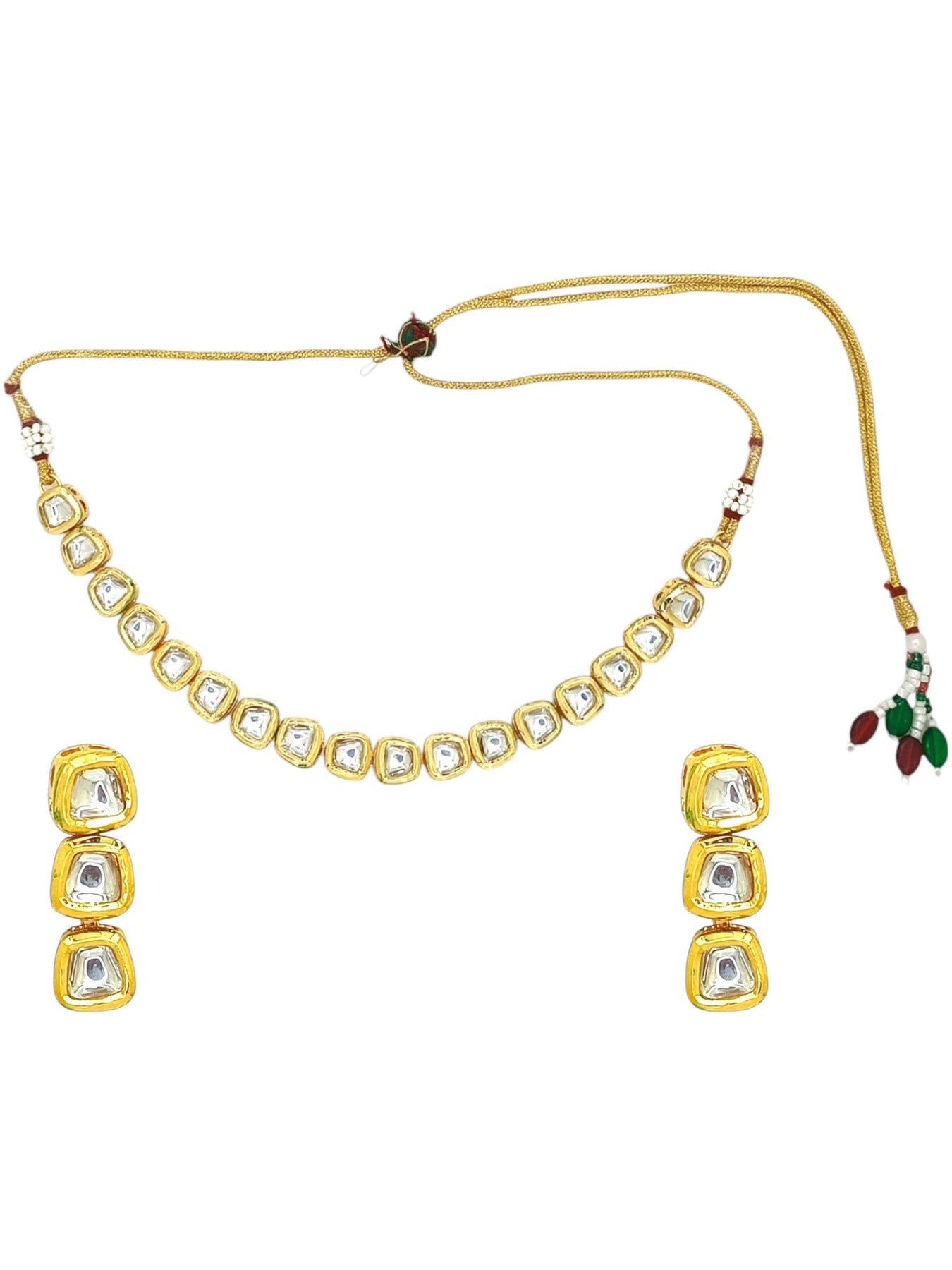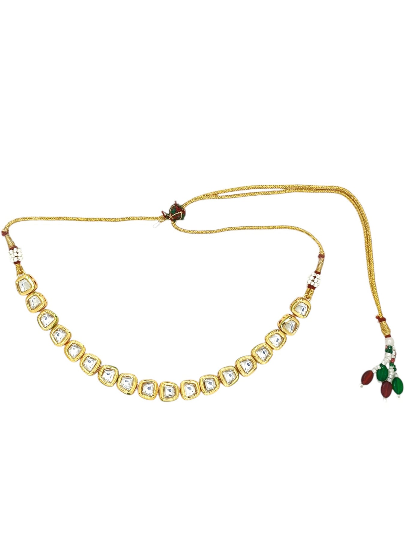 Gold Toned White Kundan Studded Elegant Necklace Set. Secured With Drawstring Closure. A Pair Of Matching Dangler Earrings, Each Secured With Post And Back Closure.