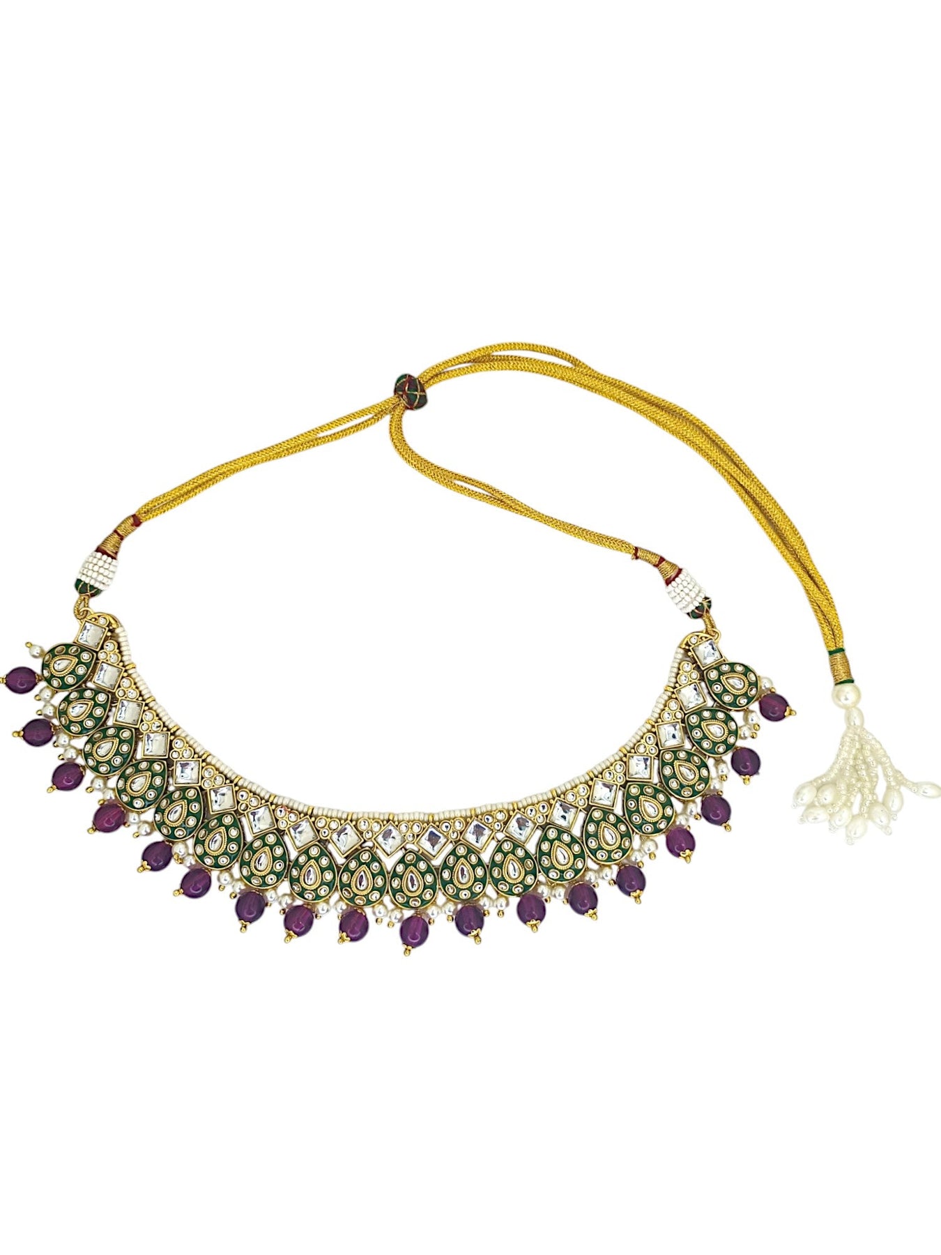 Gold Toned Meenakari Choker Set And Maangtikka, Studded With White Kundan, Wine Beads. Secured With Drawstring Closure. A Pair Of Matching Jhumka Earrings, Each Secured With Post And Back Closure. A Matching Maangtikka, Secured With S Hook Closure.