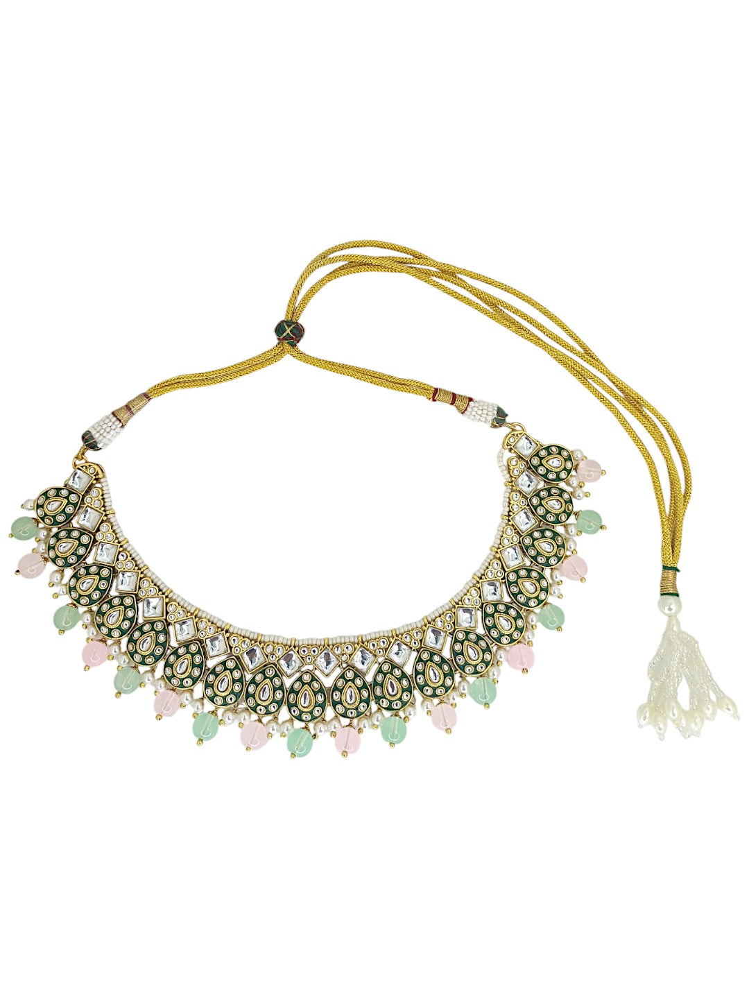 Gold Toned Meenakari Choker Set And Maangtikka, Studded With White Kundan, Multicolor Beads. Secured With Drawstring Closure. A Pair Of Matching Jhumka Earrings, Each Secured With Post And Back Closure. A Matching Maangtikka, Secured With S Hook Closure.