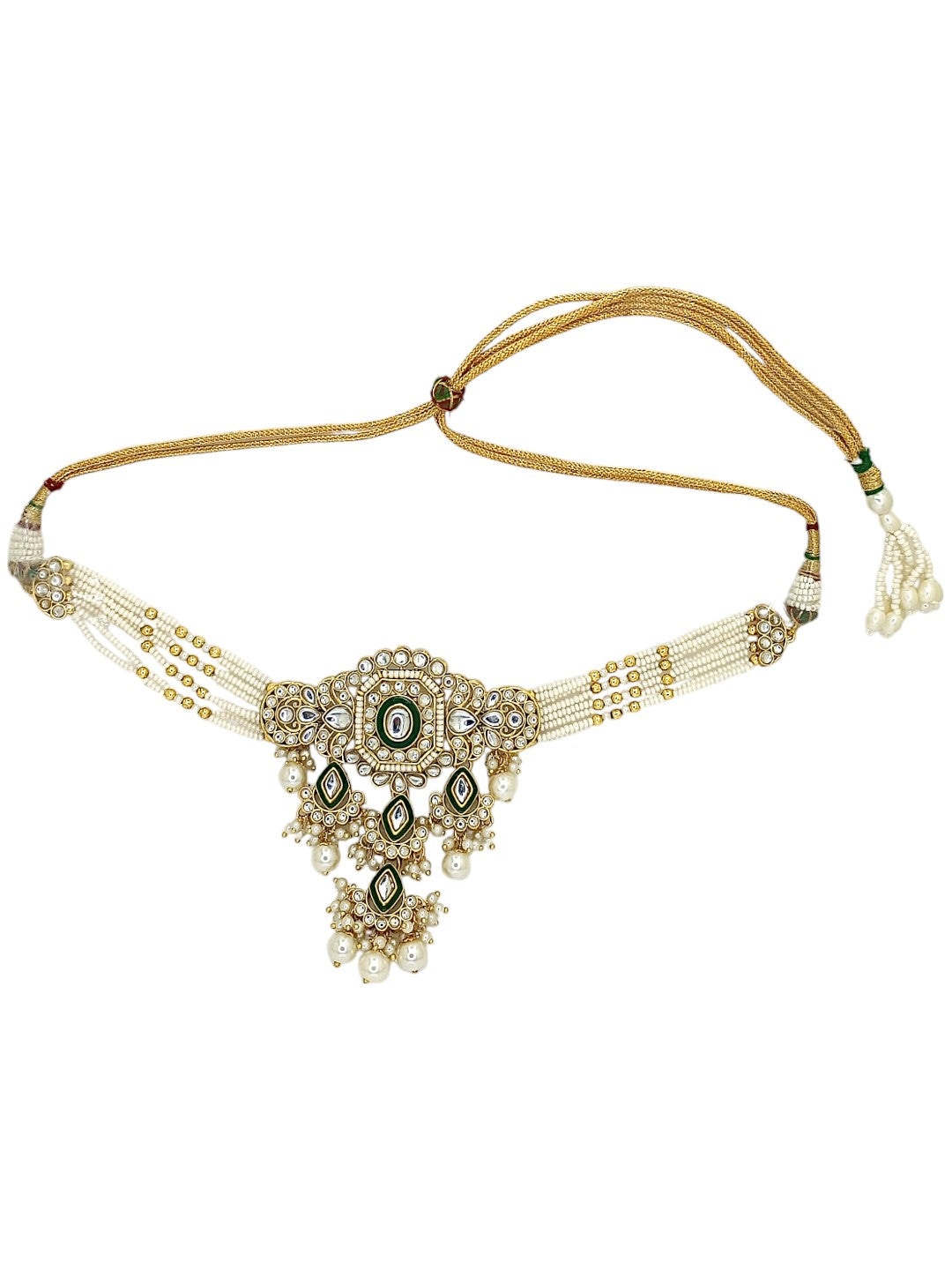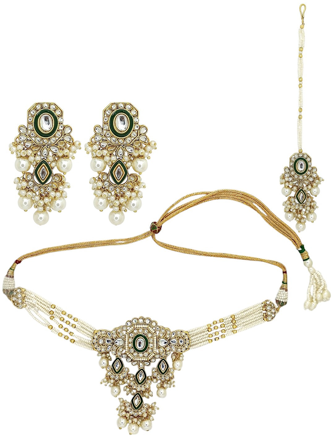 Gold Toned Green Meenakari Choker Set Studded With Kundan And Beads. Secured With Drawstring Closure. A Pair Of Matching Dangler Earrings, Each Secured With Post And Back Closure. A Matching Maangtikka, Secured With S Hook Closure.