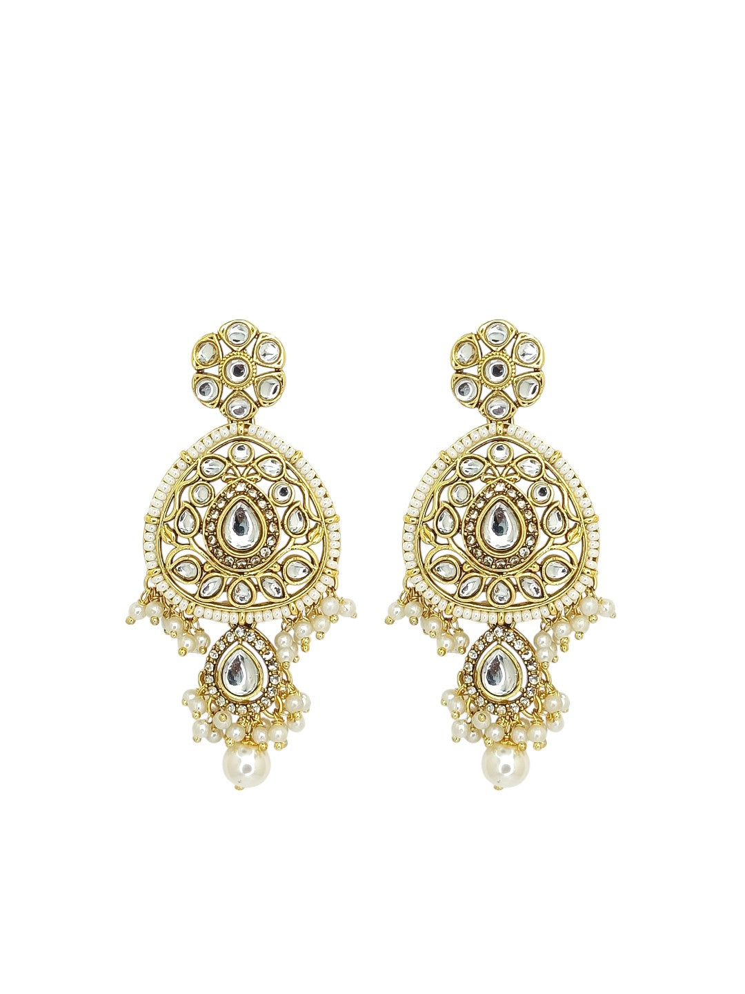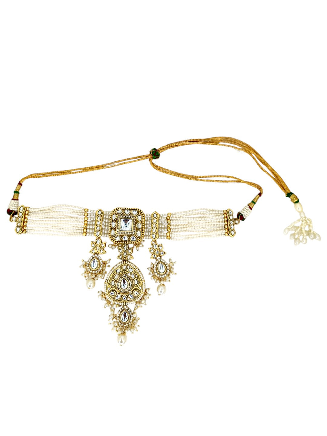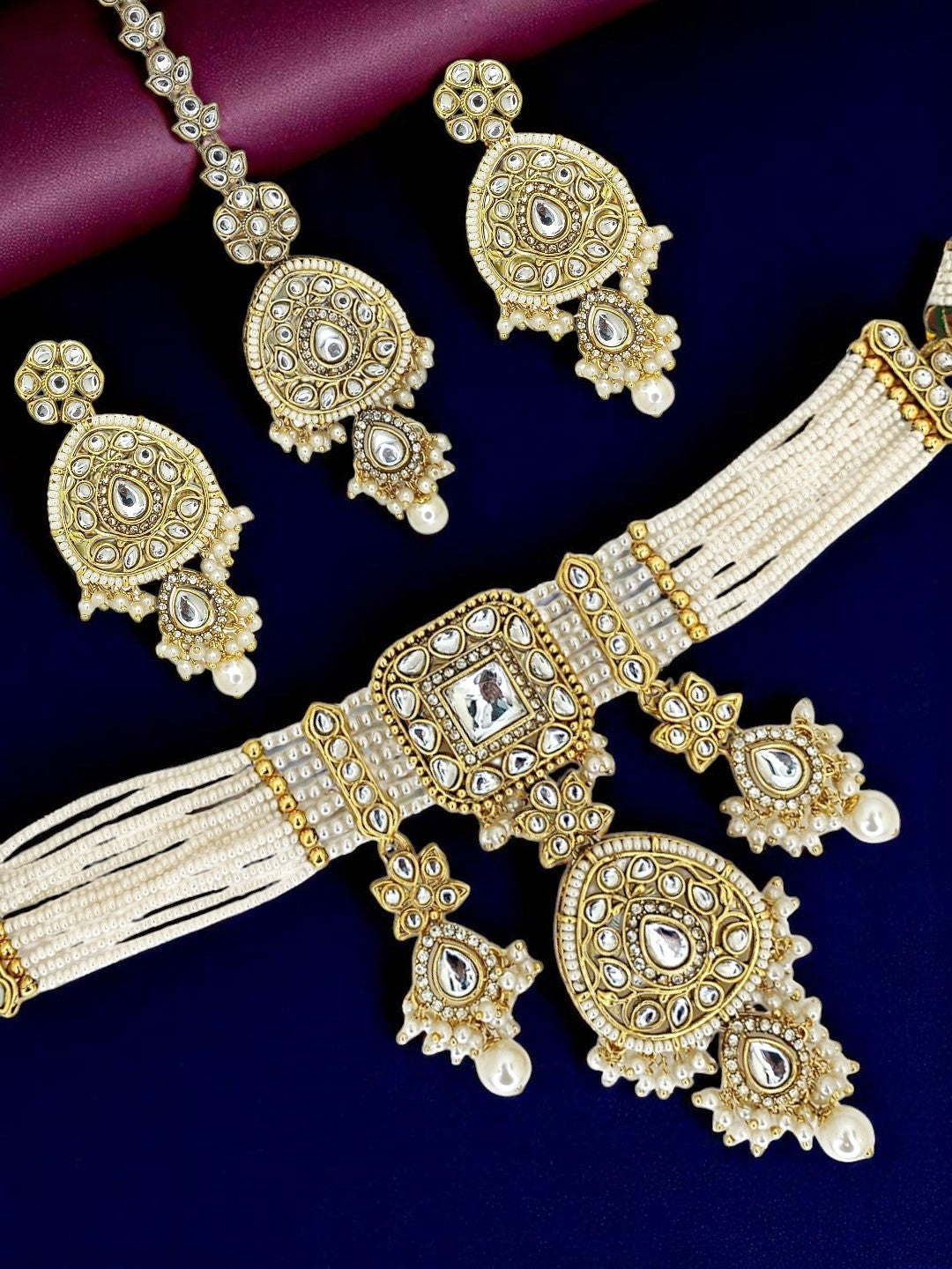 Gold Toned Floral Choker Set, Studded With White Kundan And Beads. Secured With Drawstring Closure. A Pair Of Matching Dangler Earrings, Each Secured With Post And Back Closure. A Matching Maangtikka, Secured With S Hook Closure.