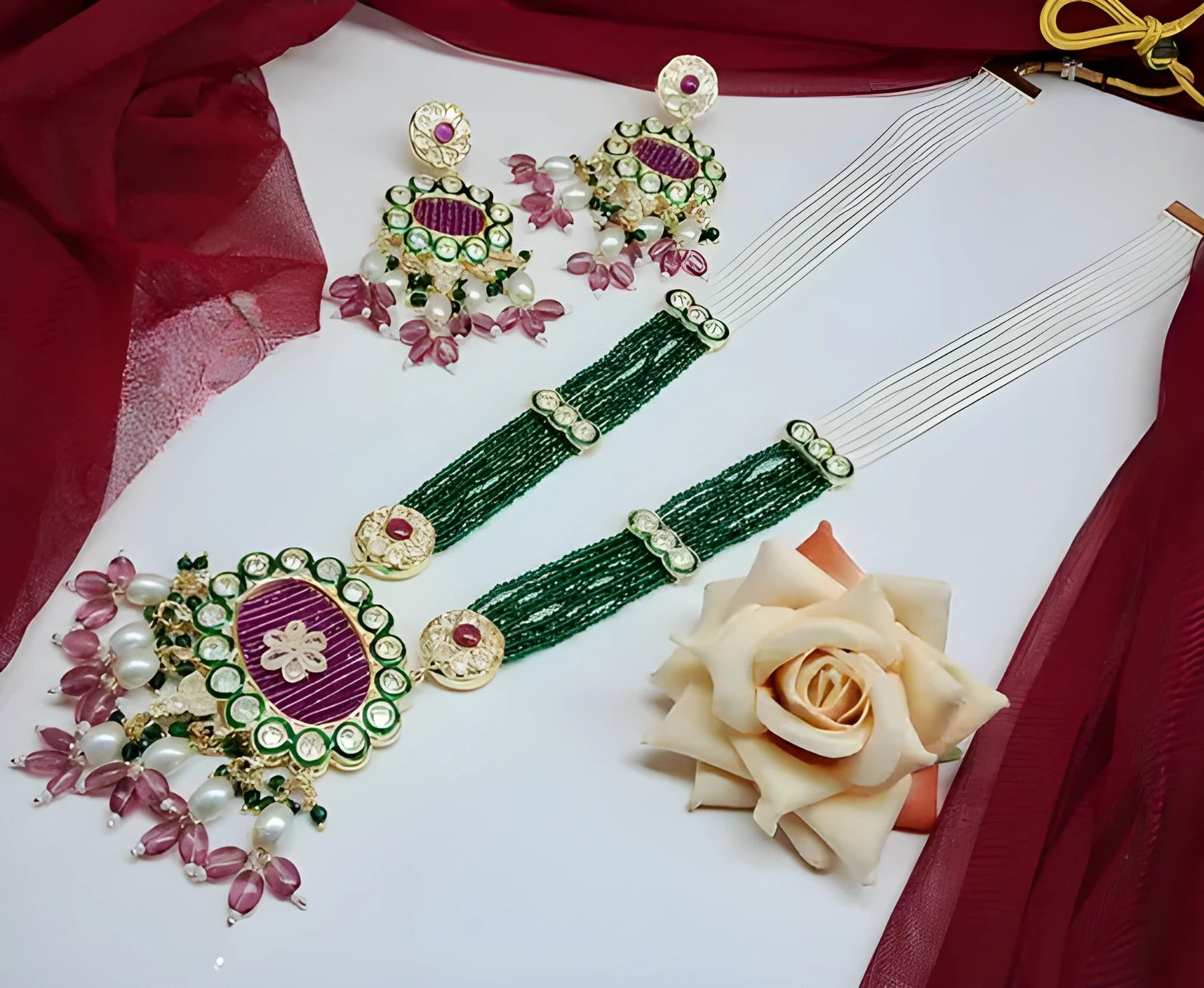 Emerald Green Kundan Crystal Maharni Har Long Set - Luxurious Traditional Indian Jewelry