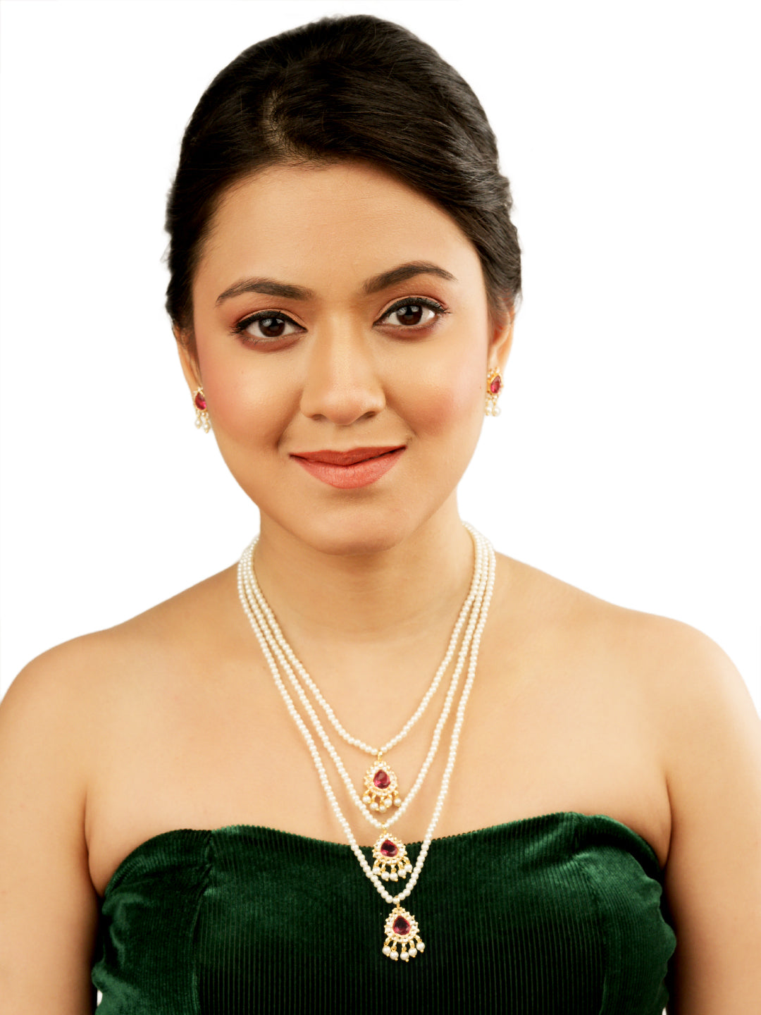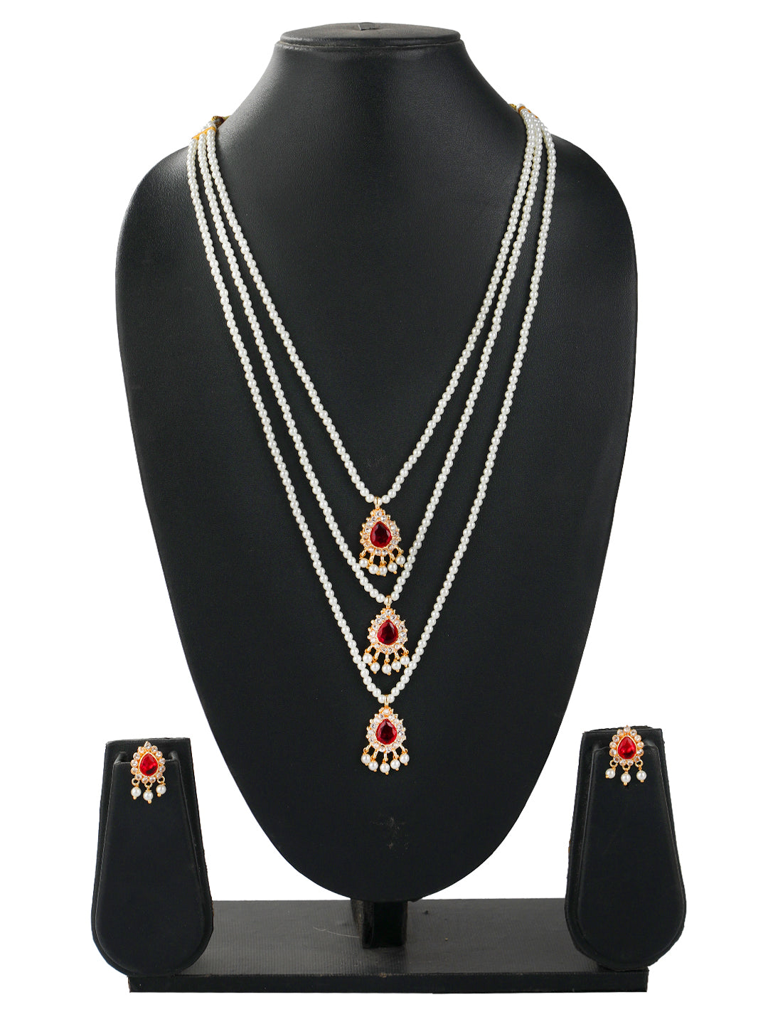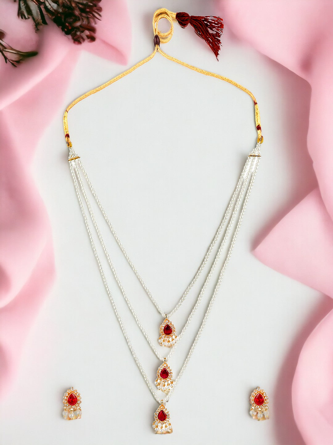 This Exquisite Gold-Plated Long Necklace Is The Epitome Of Elegance And Sophistication. With Three Layers Of Lustrous Beads Delicately Strung Together, It Exudes A Timeless Charm That Captivates Any Onlooker. At The Focal Point Of Each Layer Rests A Mesmerizing Pendant, Adorned With A Single Radiant Red Stone, Adding A Touch Of Allure And Refinement To The Piece.