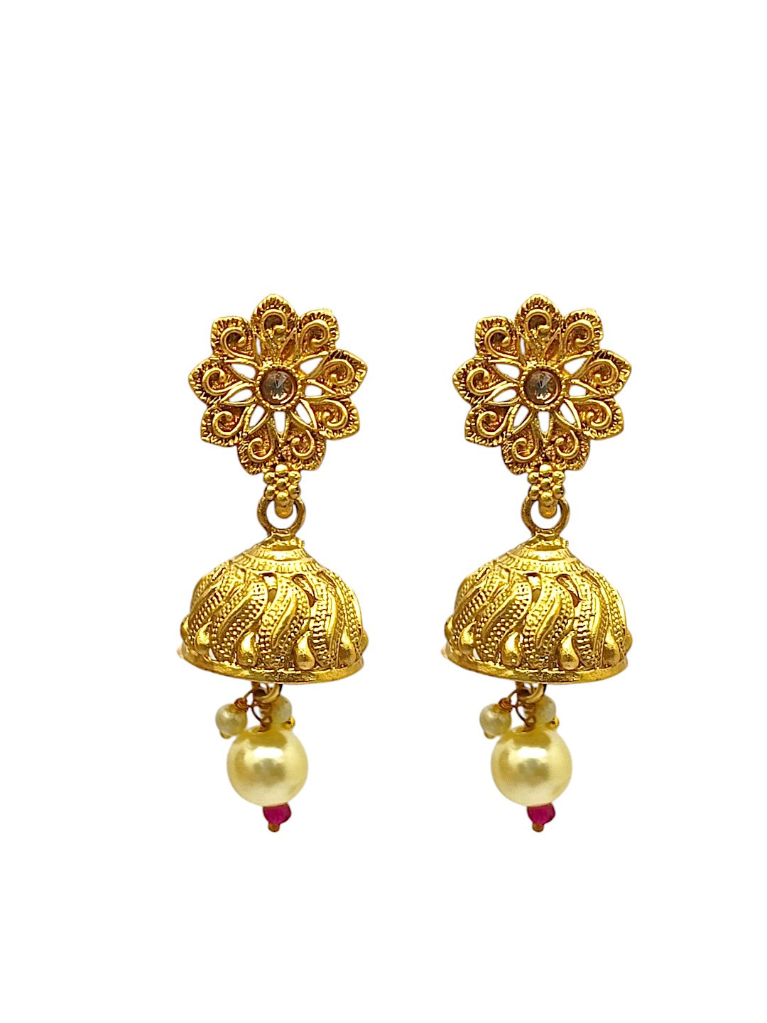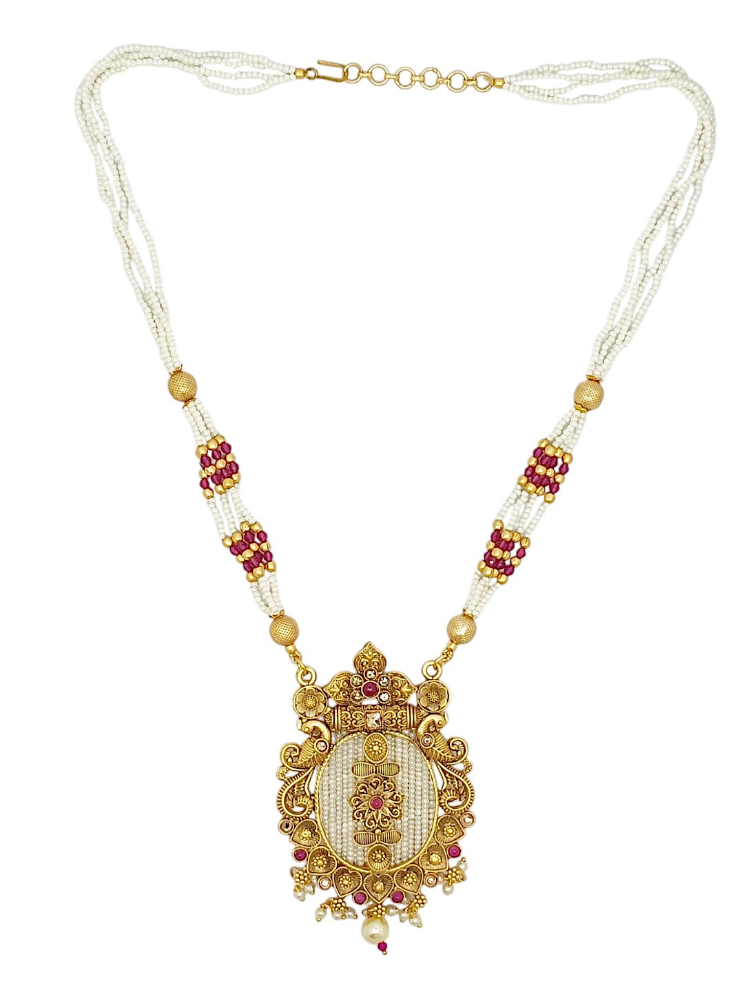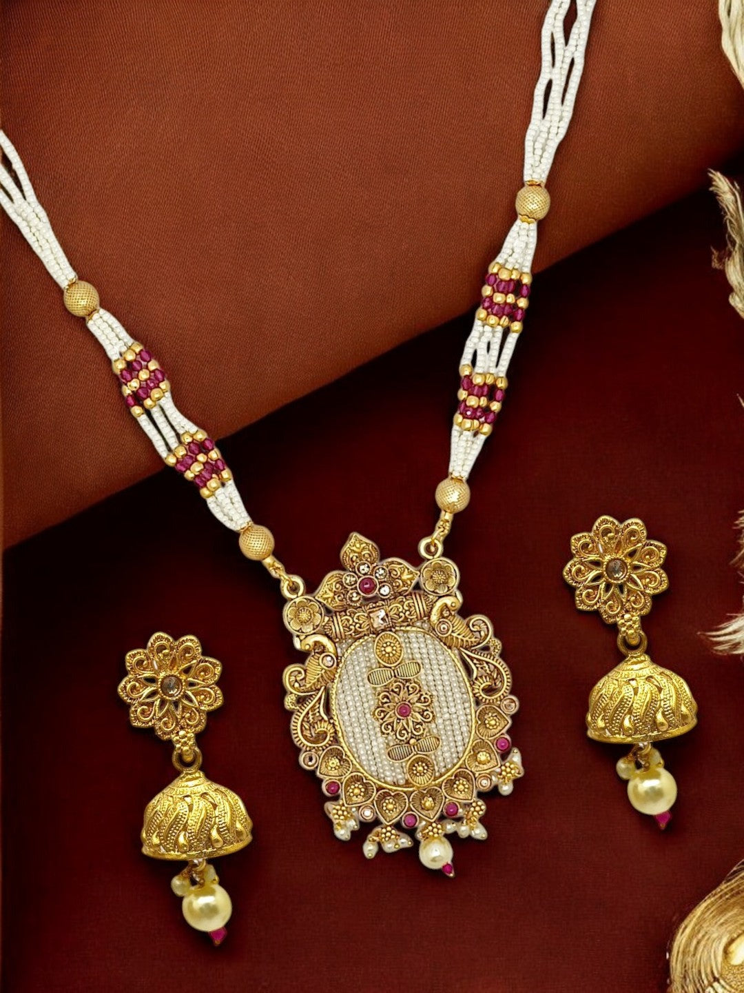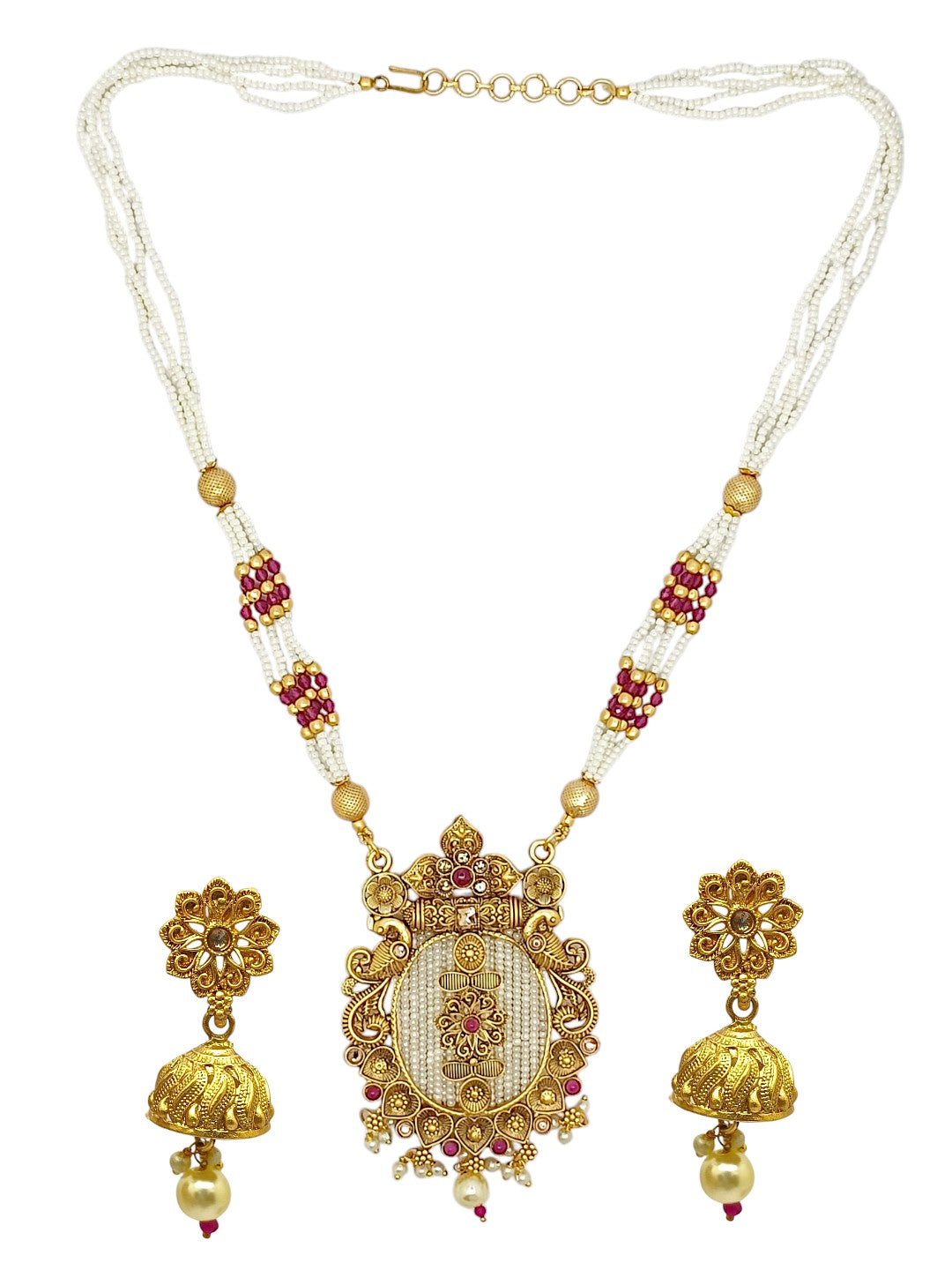 Gold-Toned Rajwadi Long Necklace, Studded With Red Stone & White Beads. Secured With Hook Closure. A Pair Of Matching Jhumka Earrings, Each Secured With Post And Closure.