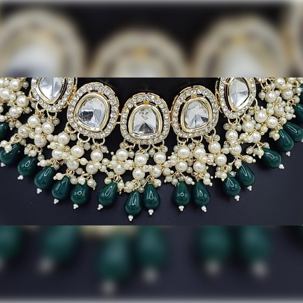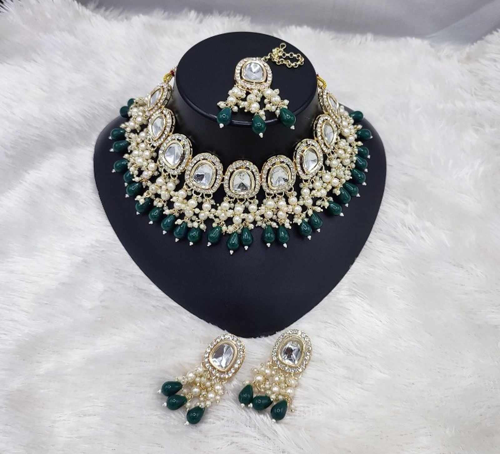 1. Necklace: A Luxurious Choker Featuring Seven Large Kundan-Set Crystal Stones, Each Surrounded By Intricate Gold-Tone Detailing. The Necklace Is Lavishly Adorned With Cascading Pearl Clusters And Deep Emerald Green Drop Beads, Creating A Harmonious Blend Of Elegance And Opulence.