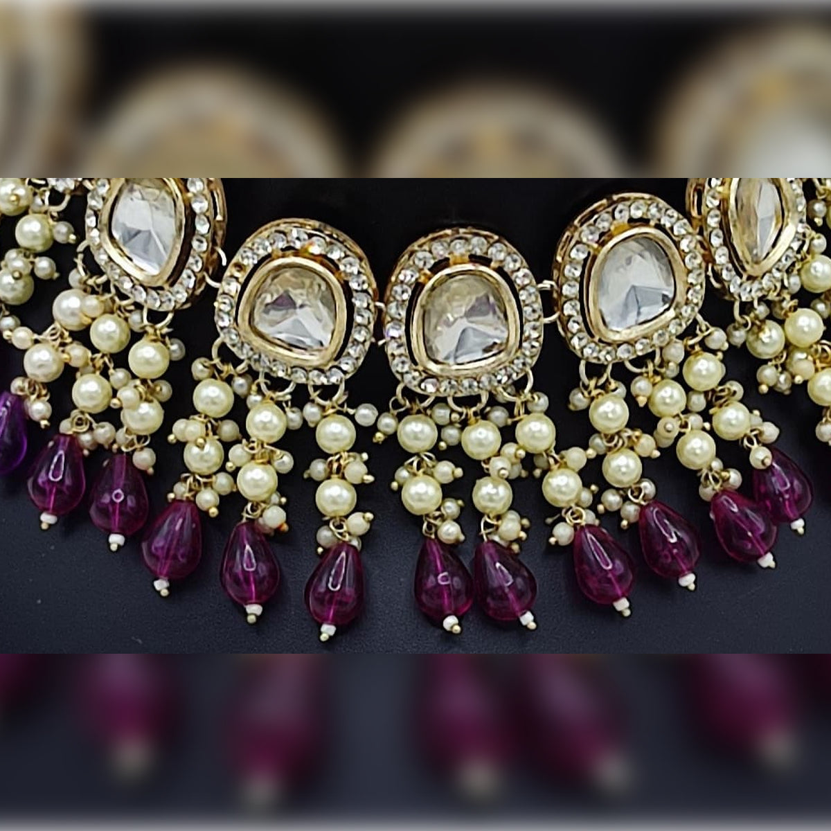 1. Necklace: A Luxurious Choker Featuring Seven Large Kundan-Set Crystal Stones, Each Surrounded By Intricate Gold-Tone Detailing. The Necklace Is Lavishly Adorned With Cascading Pearl Clusters And Deep Wine Drop Beads, Creating A Harmonious Blend Of Elegance And Opulence.