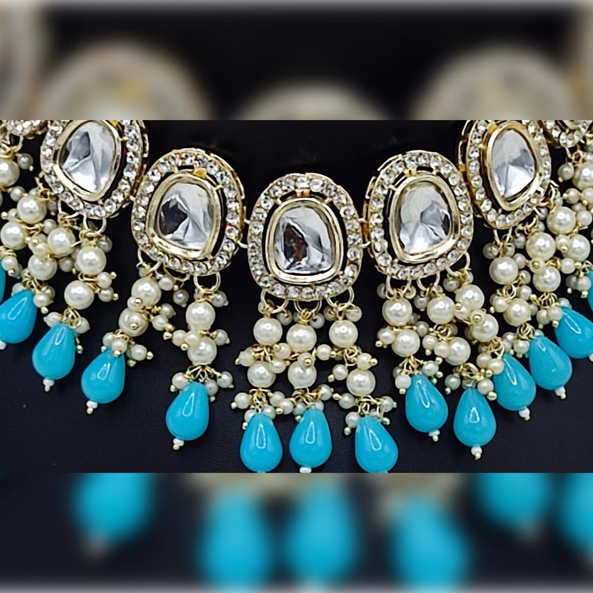 1. Necklace: A Luxurious Choker Featuring Seven Large Kundan-Set Crystal Stones, Each Surrounded By Intricate Gold-Tone Detailing. The Necklace Is Lavishly Adorned With Cascading Pearl Clusters And Deep Emerald Turquoise Drop Beads, Creating A Harmonious Blend Of Elegance And Opulence.