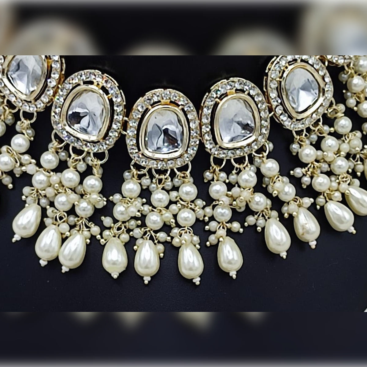 1. Necklace: A Luxurious Choker Featuring Seven Large Kundan-Set Crystal Stones, Each Surrounded By Intricate Gold-Tone Detailing. The Necklace Is Lavishly Adorned With Cascading Pearl Clusters And Deep White Drop Beads, Creating A Harmonious Blend Of Elegance And Opulence.