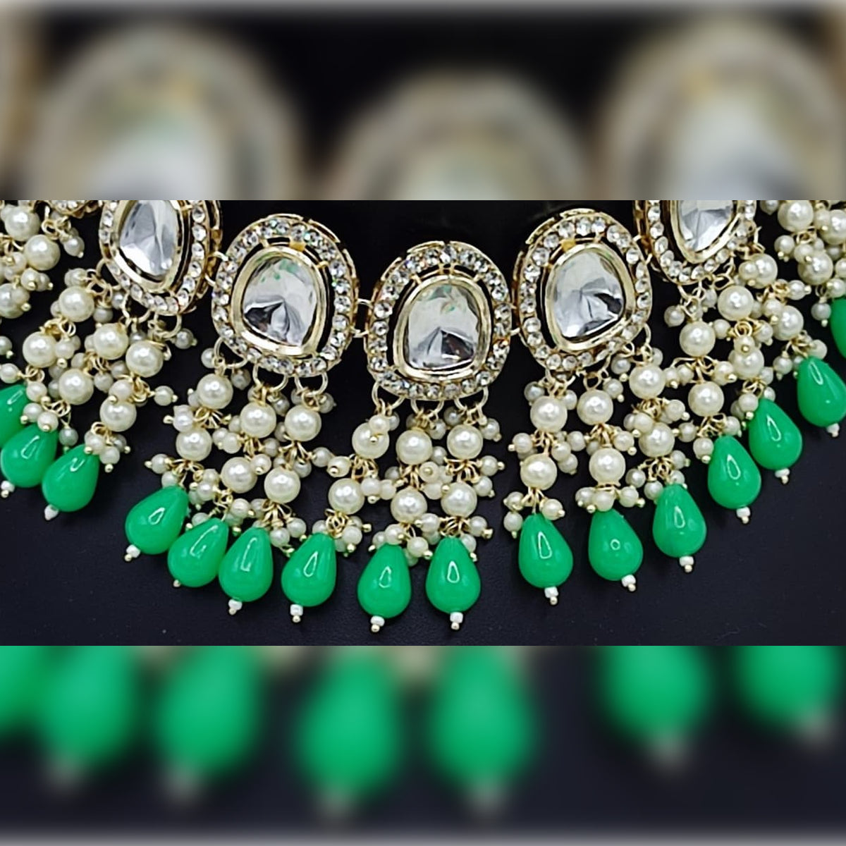 1. Necklace: A Luxurious Choker Featuring Seven Large Kundan-Set Crystal Stones, Each Surrounded By Intricate Gold-Tone Detailing. The Necklace Is Lavishly Adorned With Cascading Pearl Clusters And Deep Mint Drop Beads, Creating A Harmonious Blend Of Elegance And Opulence.