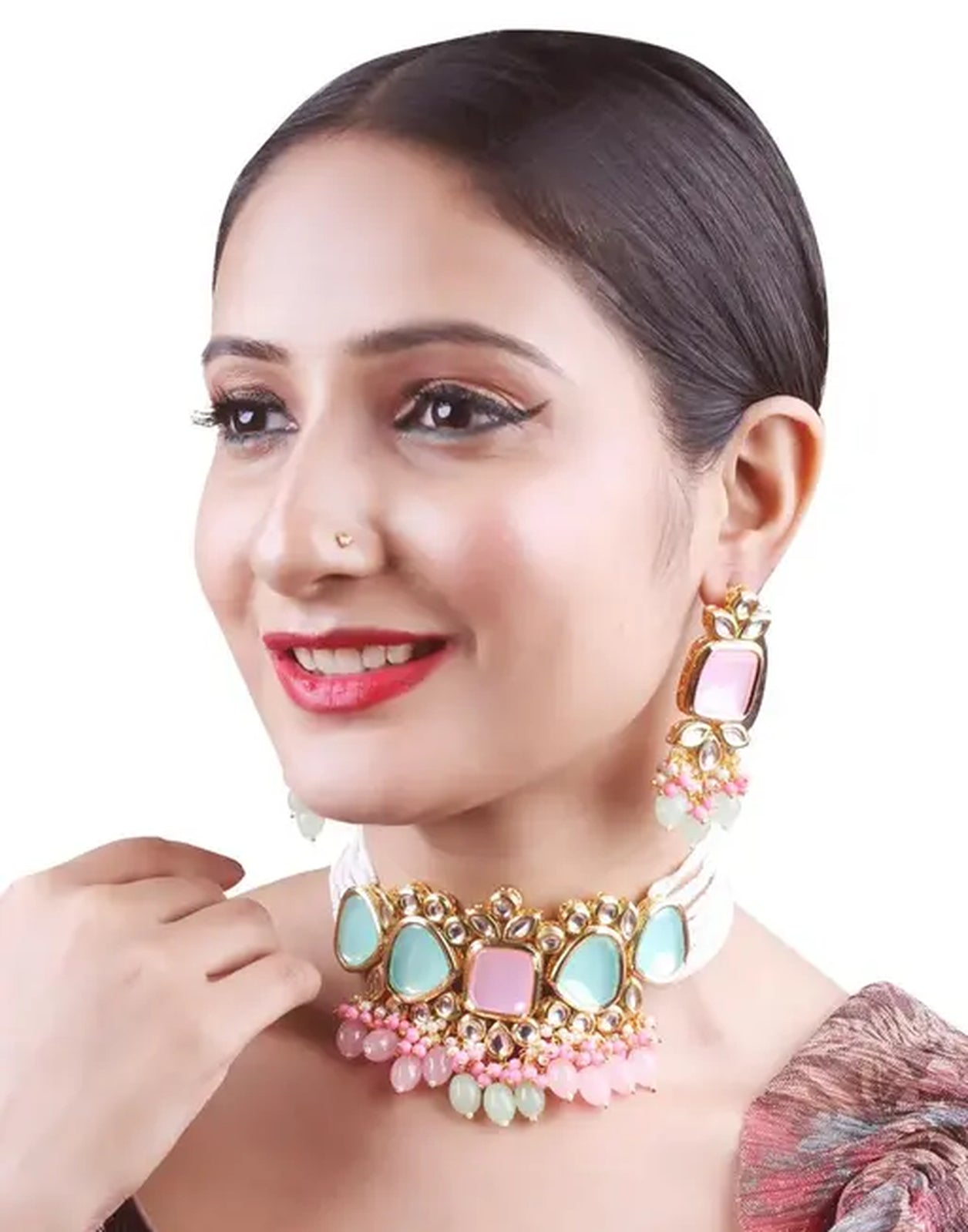 Elegant Multi Gold Indian Kundan Choker Necklace And Earring Set
