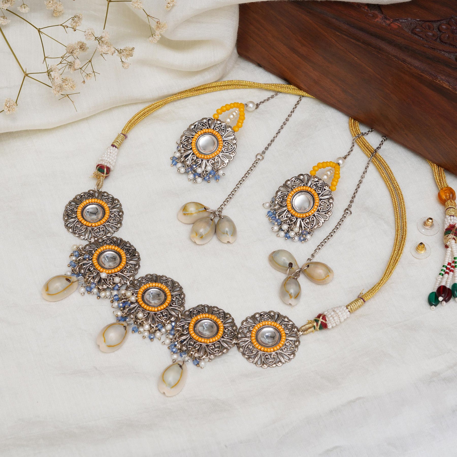 Women's Royal Mirrorwork Oxidized Necklace And Earrings Set With Shells