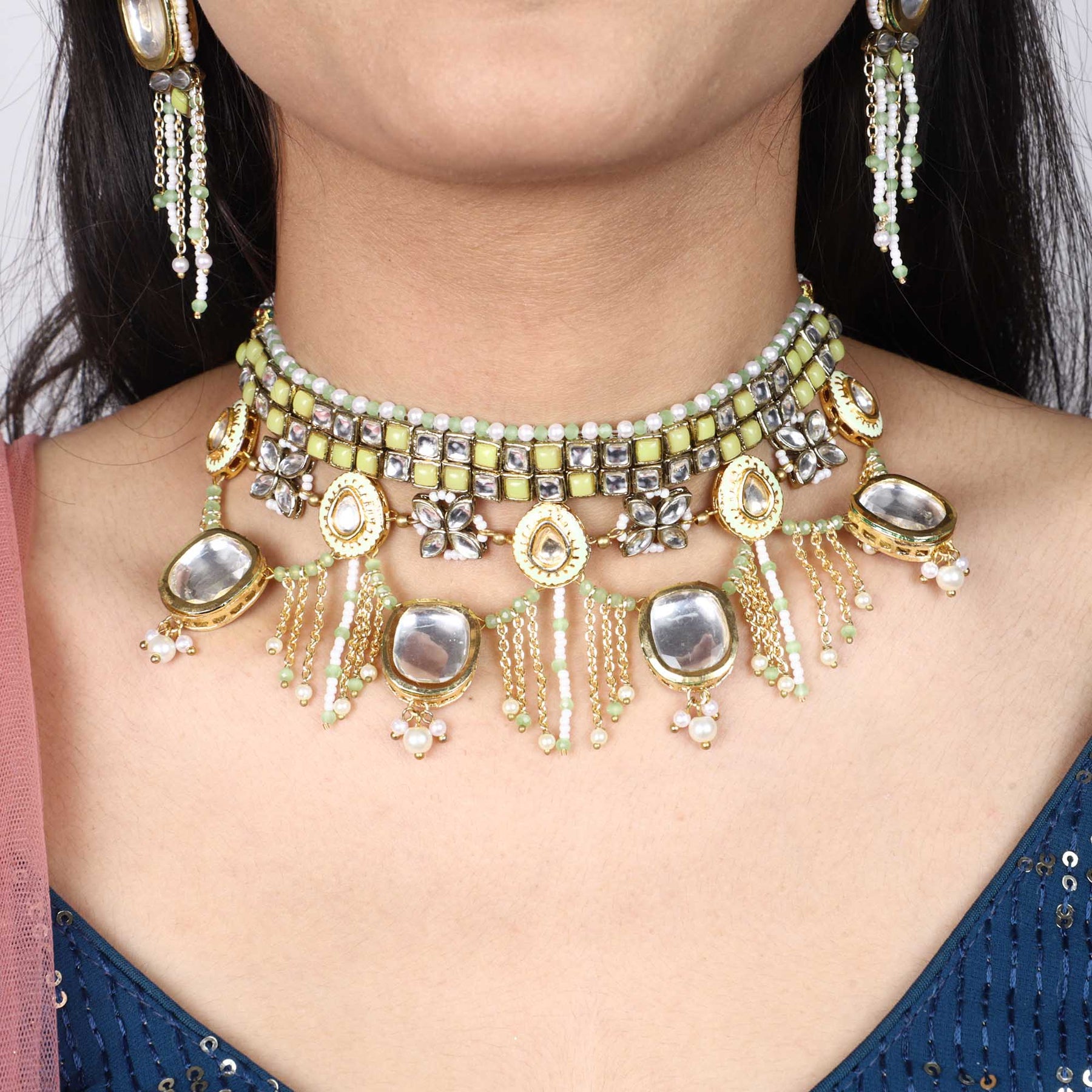 Elevate Your Wedding Outfit With Minty Winty Kundan Necklace Set, Featuring A Classic Design That Complements Indian Attire And Skin Tones. The Combination Of Mint Green Enamel And Kundan Creates A Timeless And Elegant Look That'S Perfect For The Wedding Season. This Necklace Set Is A Must-Have Addition To Every Woman'S Jewelry Collection And Will Bring A Touch Of Glamour To Any Occasion. Pair It With Your Wedding Dress And Be The Center Of Attention At Your Reception Or Wedding. Don'T Miss The Chance To Add This Exquisite Piece To Your Collection.