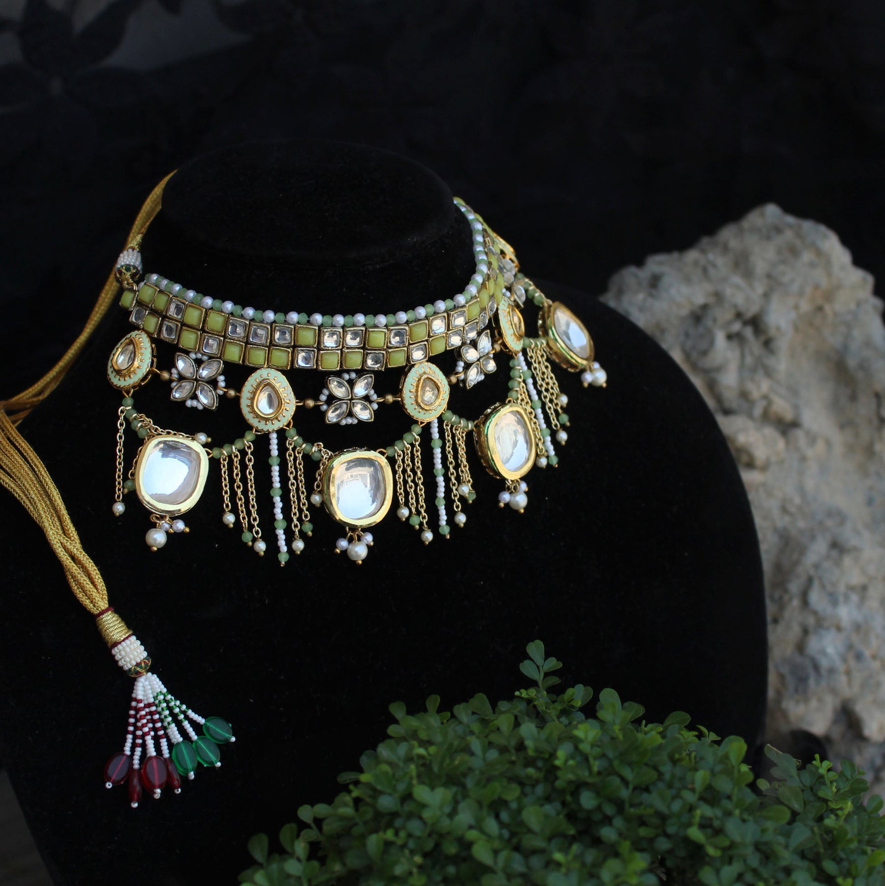 Stones :White Glass Kundan, Green/White Glass Beads & Green Enamal