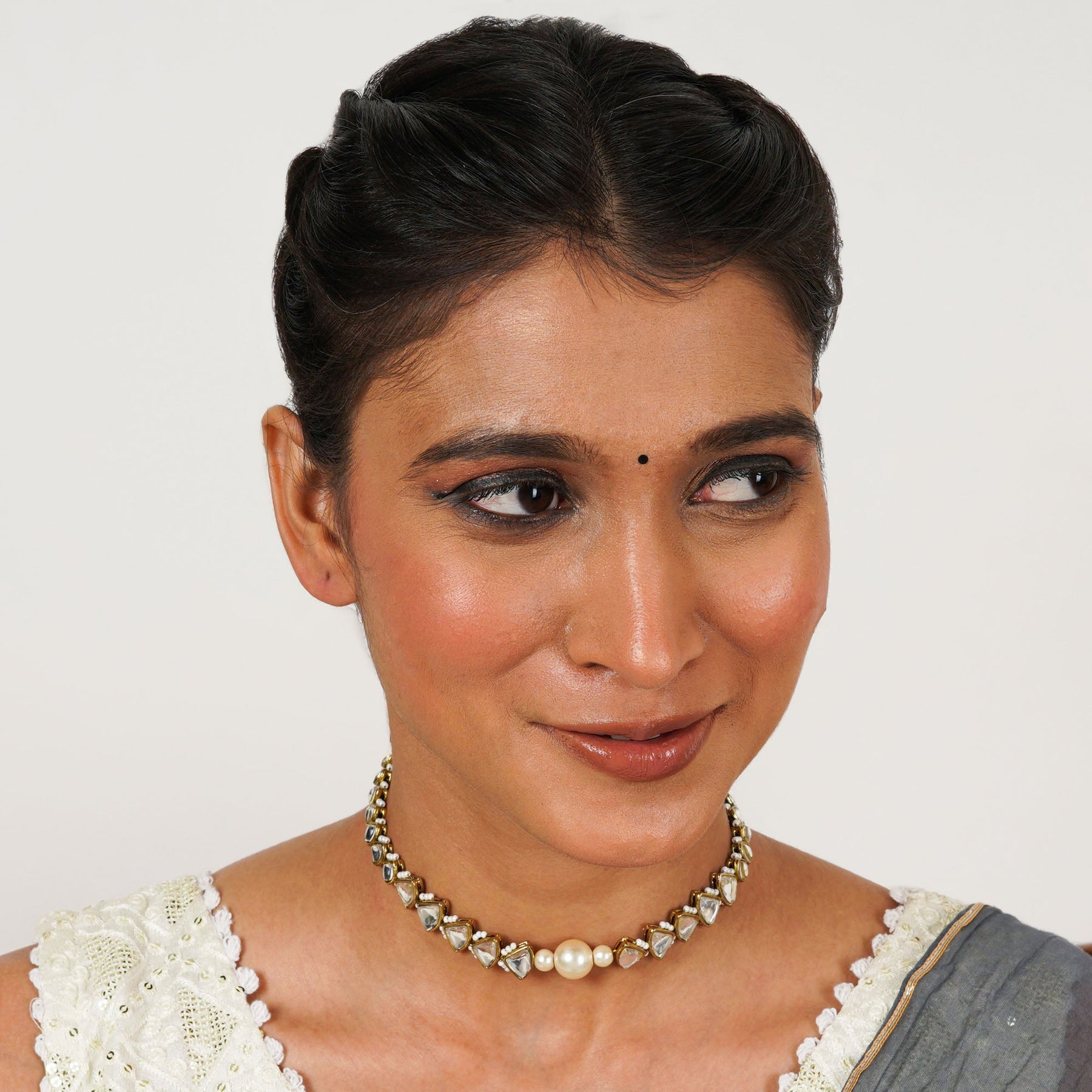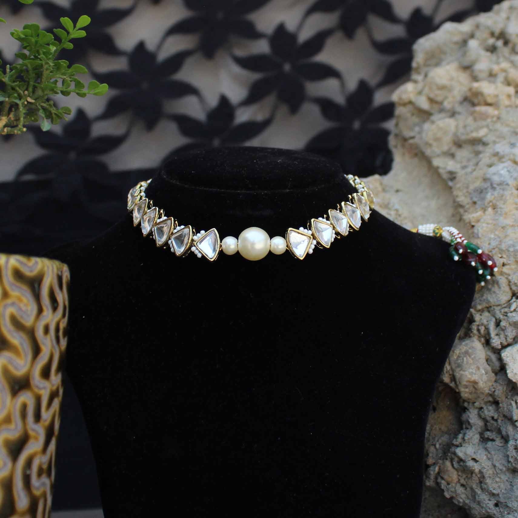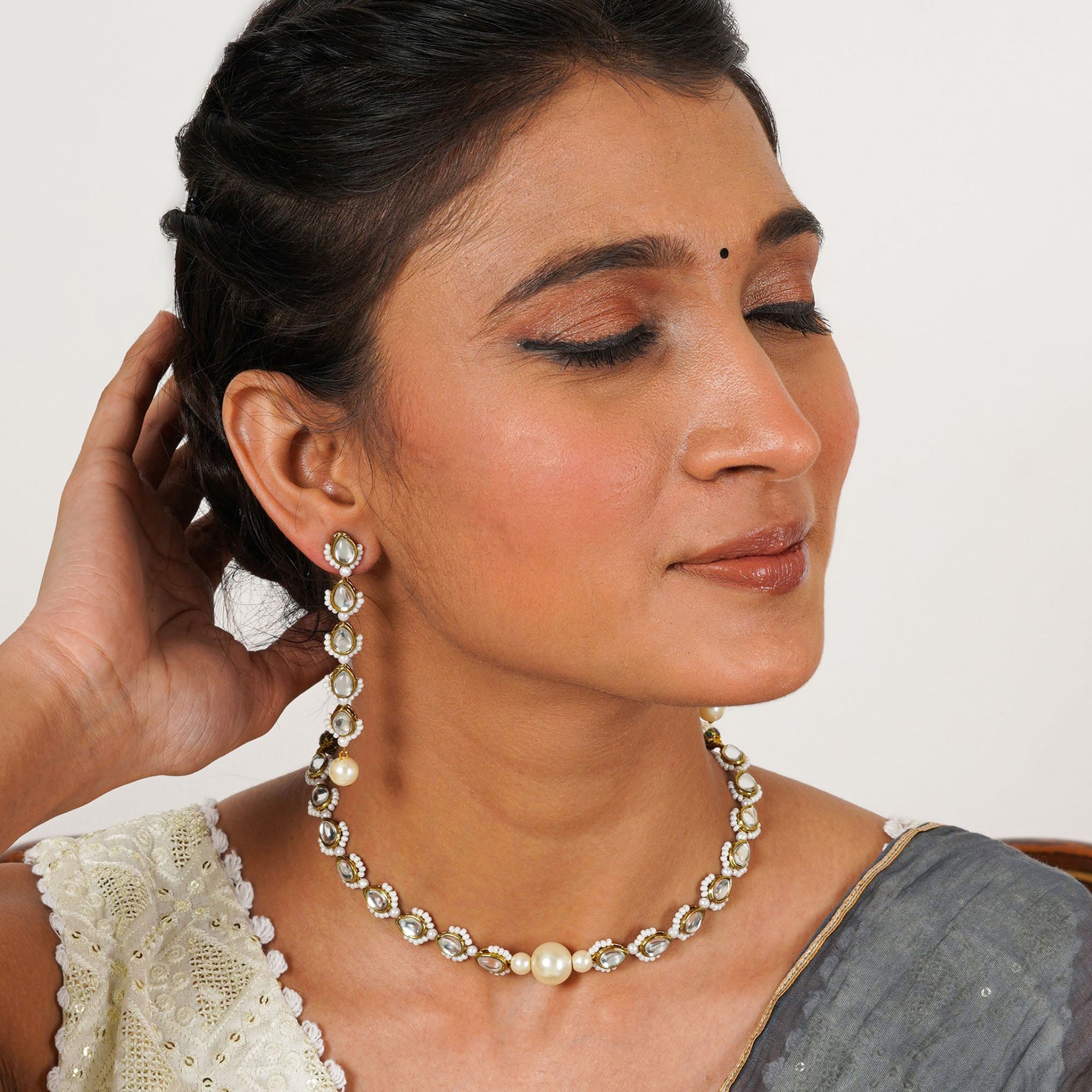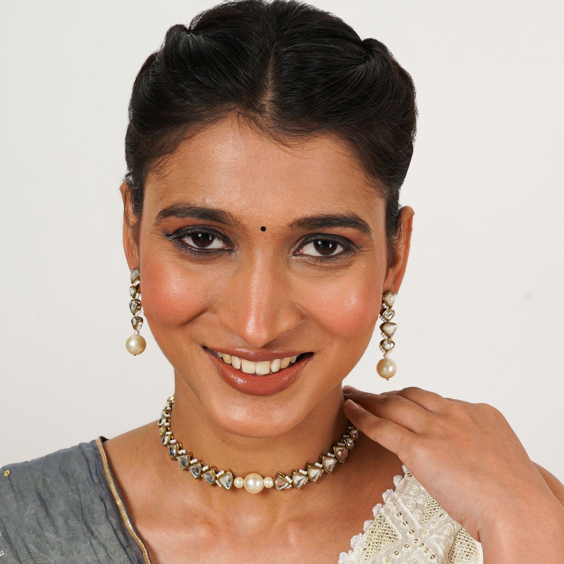 Make A Statement With This Elegant Triangle Single String Necklace That Adds A Touch Of Class To Your Outfit. This Necklace Is Perfect For Creating A Subtle Yet Sophisticated Look. The Necklace Is Adorned With Beautiful Stones That Add A Touch Of Glamour And Elegance. Pair It With The Long Earrings Included In This Set For A Complete Look That Will Complement Your Ethnic Wear Perfectly. This Necklace Set Is A Must-Have For Any Fashion-Conscious Woman Looking For A Stylish And Timeless Accessory To Add To Her Collection.