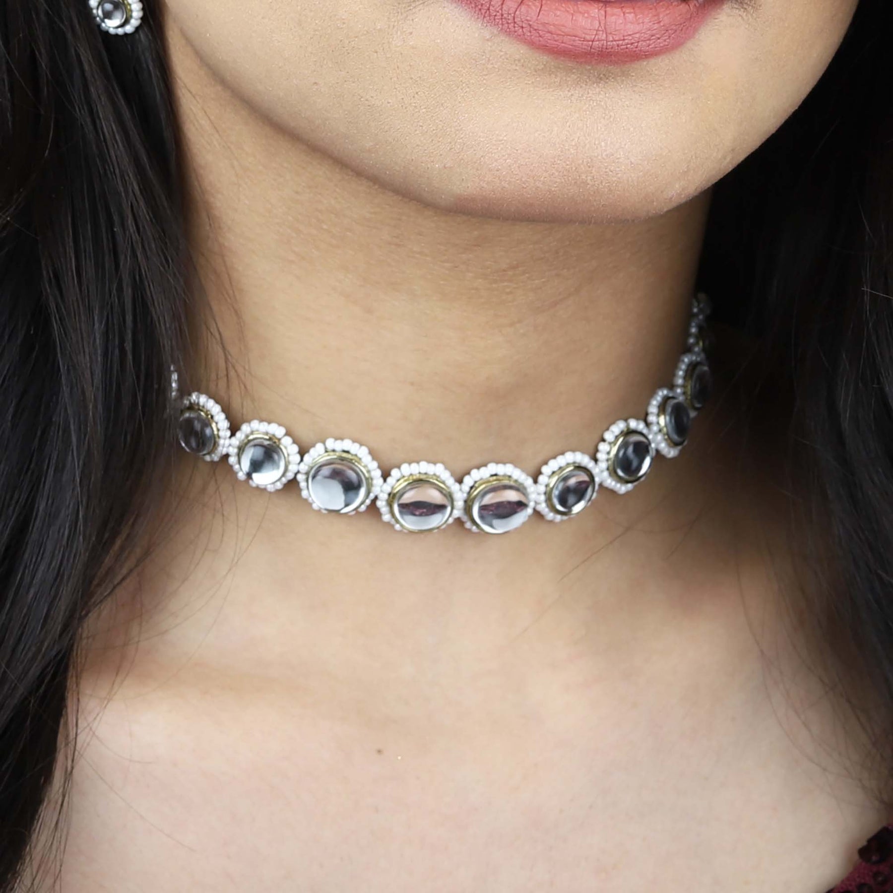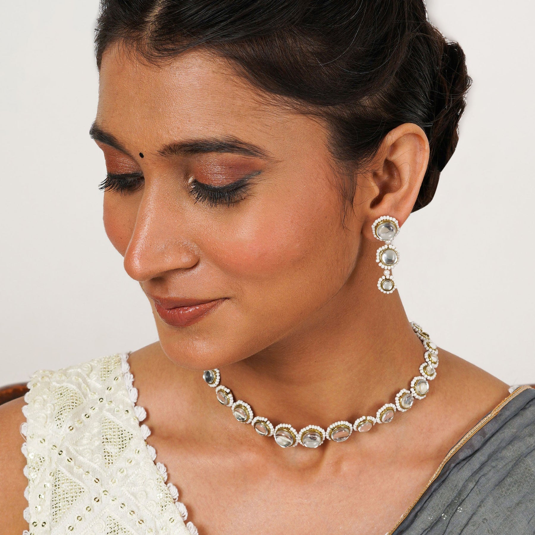 Add A Touch Of Sophistication To Your Outfit With This Exquisite Round Kundan Single Line Necklace Set. The Exclusive Traditional Design Is Beautifully Crafted With Modern Elements To Match The Taste Of The Modern Woman. The Sparkling Set Is Embellished With Delicate Kundan Stones Arranged In A Beautiful Pattern, Exuding A Sense Of Sophistication And Elegance. The Delicate Hanging Adds To The Charm Of This Jewelry Set, Making It A Delight To See Choker Necklaces Fitting Perfectly Over The Neck, Giving A Chic And Bold Appearance. This Set Comes With Matching Earrings To Complete Your Outfit, Making It The Perfect Choice For Any Occasion, From Traditional Events To Modern Parties. Make A Statement With This Stunning Necklace Set And Feel Confident And Beautiful.