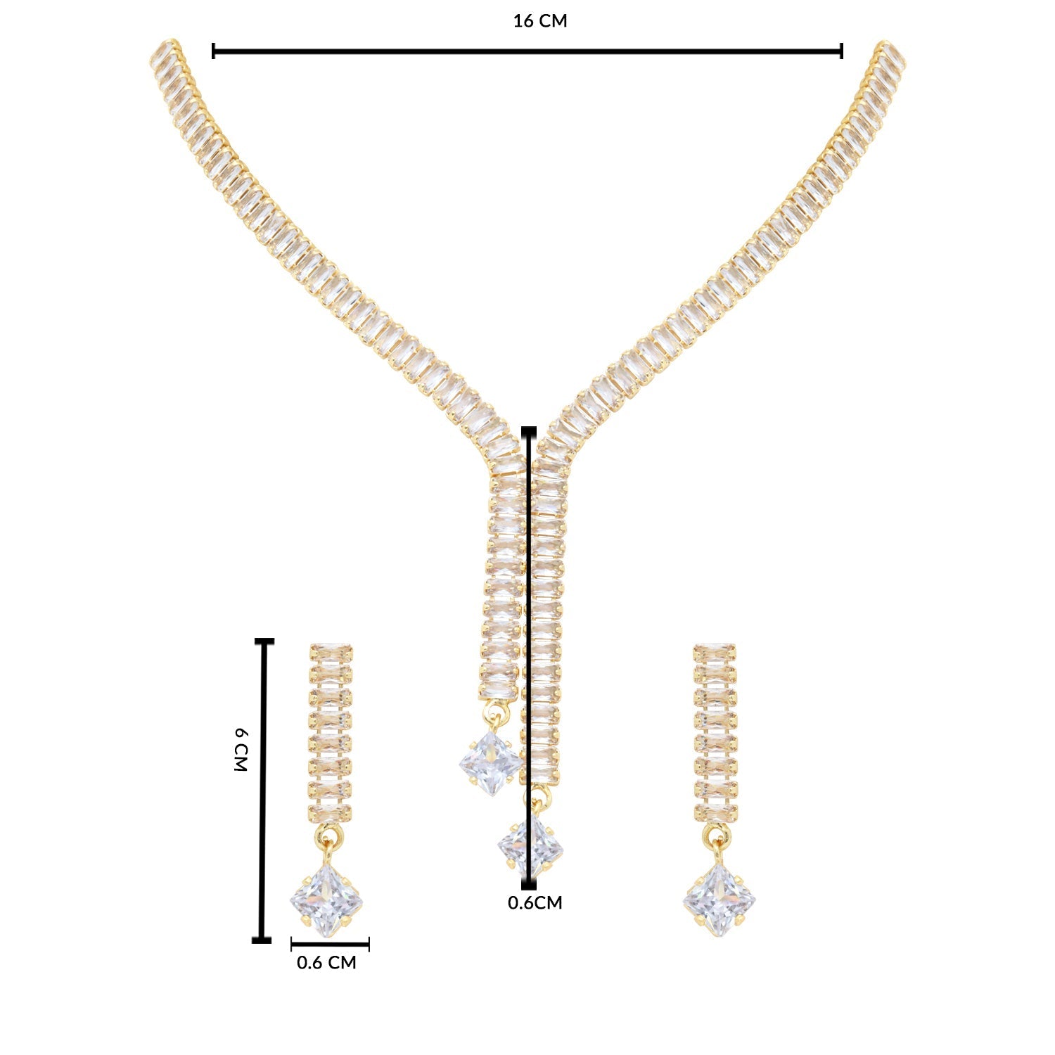 The Intricate Design Of The Necklace Is Accentuated By Crystal-Studded Embellishments, Adding A Layer Of Sophistication And Grace. The Set Includes Matching Drop Earrings, Perfectly Coordinated With The Necklace, Featuring A Silver Finish, Cubic Zirconia, And Crystal Detailing For A Cohesive And Glamorous Look. Ideal For Special Occasions, Weddings, Or Festive Events, This Jewellery Set Offers A Perfect Blend Of Modern Style And Classic Beauty, Making It An Essential Addition To Any Jewellery Collection. The Secure Clasp And Comfortable Earrings Ensure Ease Of Wear, Allowing You To Enjoy The Spotlight Effortlessly.