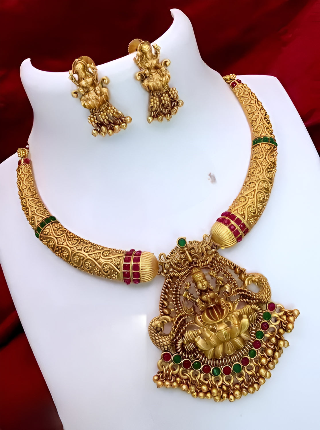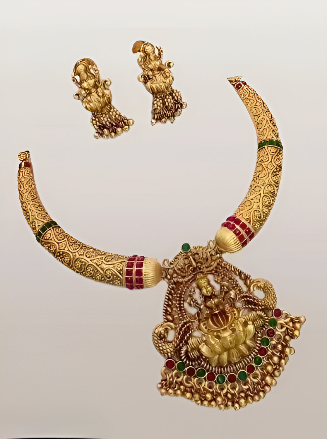 Exquisite Antique Gold Lakshmi Temple Jewelry Set - South Indian Bridal Necklace And Earrings