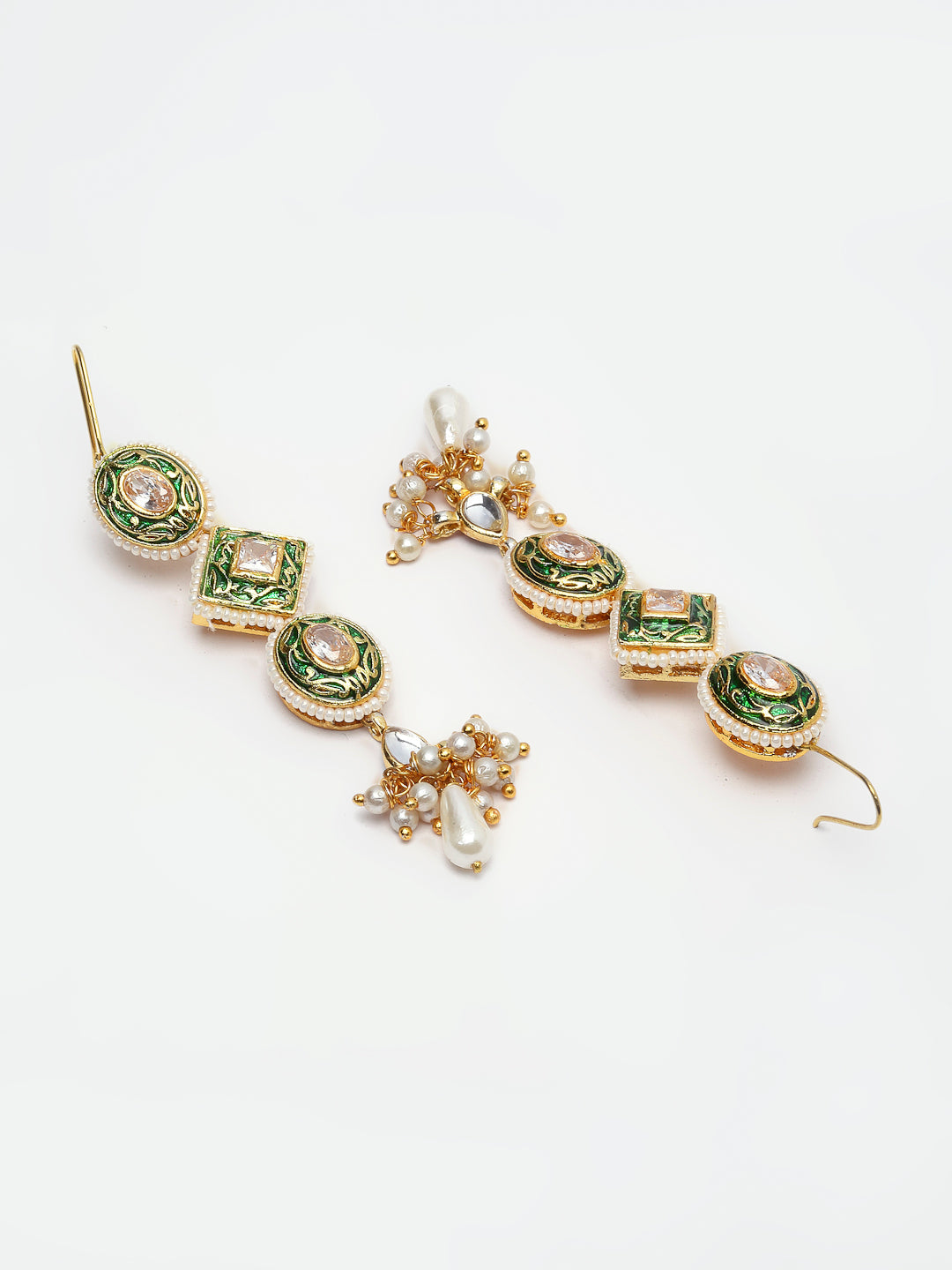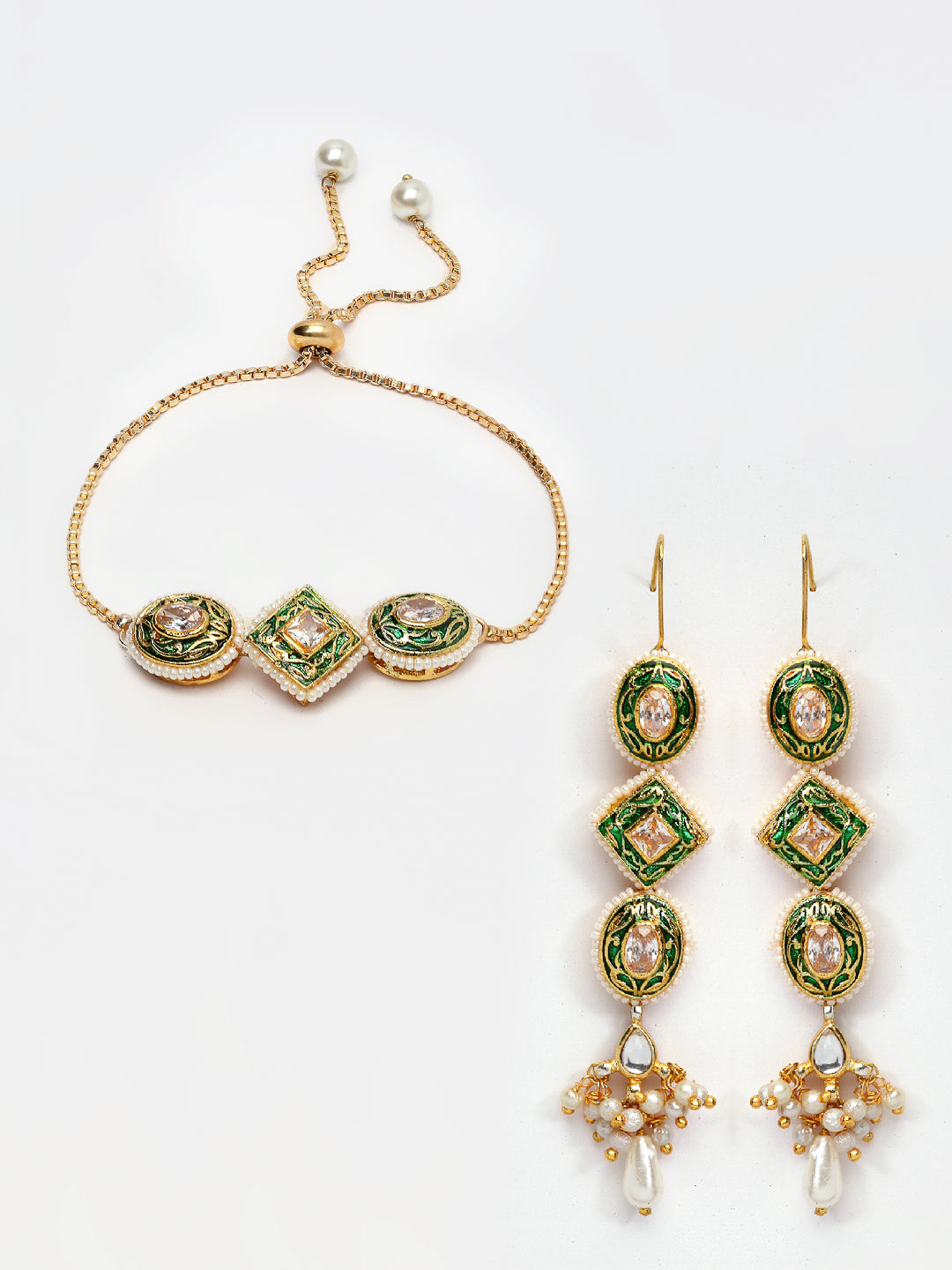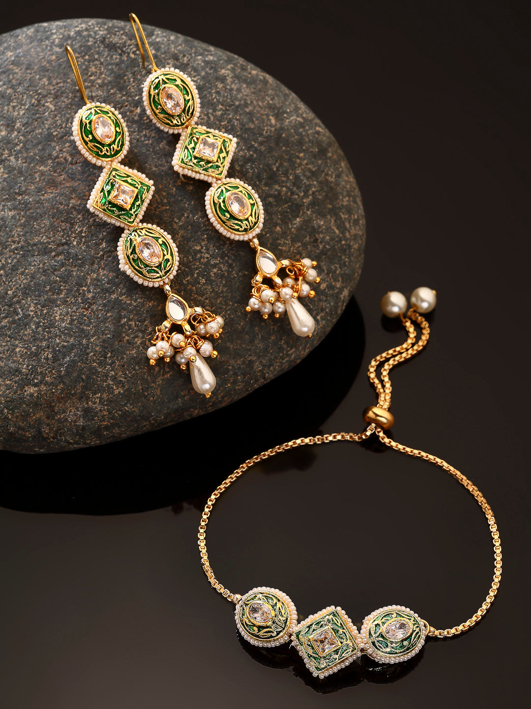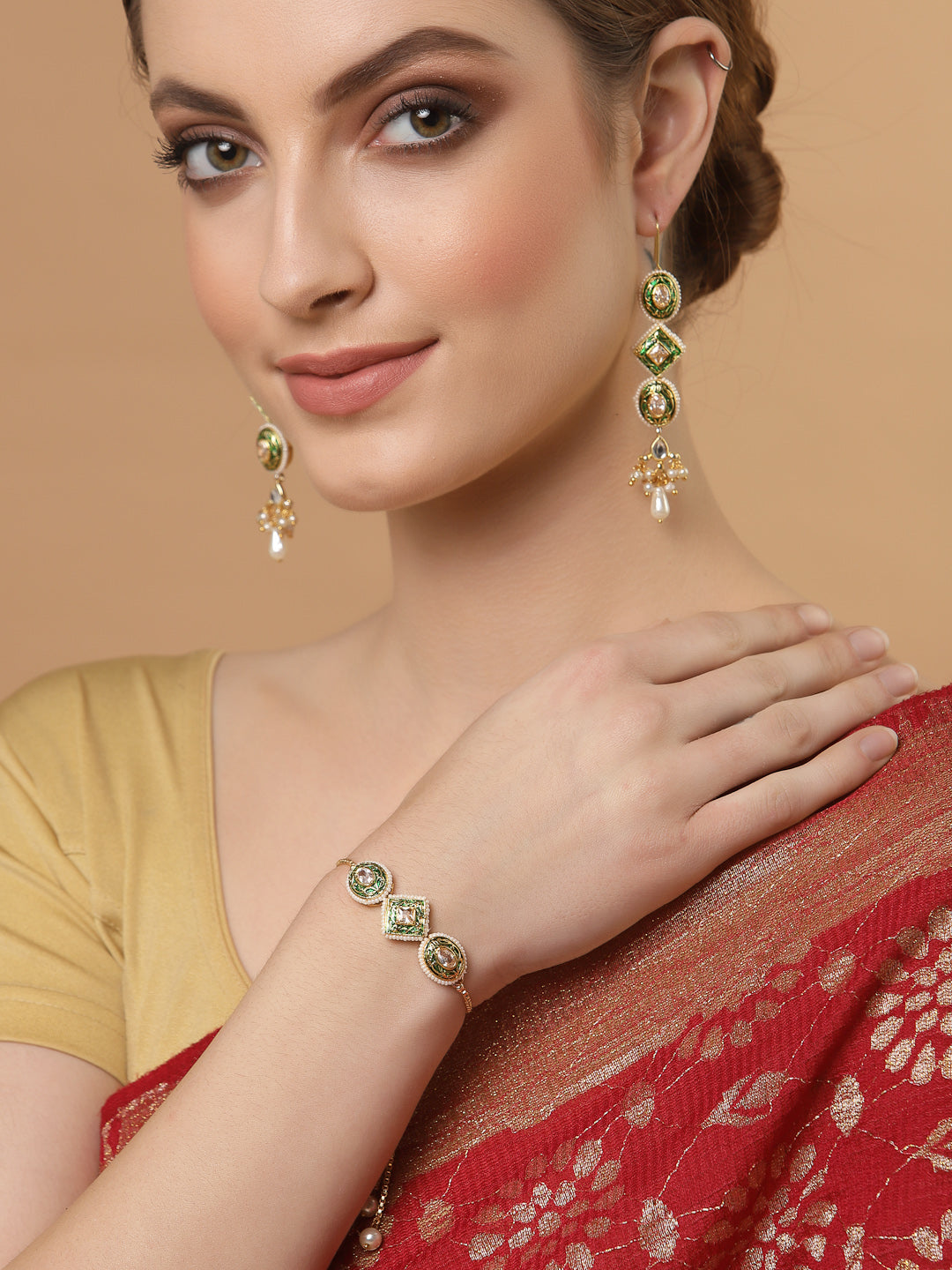 This Bracelet And Earring Combo To Give You All Style Need In One Go. A Watch A Dress And A Right Pc Of Jewellery Is All You Need To Shine Any Brunch Or Evening Walk With Friends, Let The Magic Of Universe Work In Your Favour With Our Handmade Jewellery.; Category Of Jewellery Is Jewellery Set; Sub Category Is Bracelet And Earring; Ideal For Women; Color Is Green, White, Gold; Gemstones Used - Kundan, Pearls, Natural Stones, American Diamond; Plating Is Gold-Plated; Base Metal Is Alloy; Other Material Used - Closure Stopper; Size Is Freesize; Adjustable - Yes; Weight Is 27 Gms; Mesaurements - Length Of Earring= 10 Cm; Width Of Earring =2.4 Cm; = Cm; Width Of Bracelet = 2.5 Cm; Diameter Of Bracelet =6.03 Cm; Circumference Of Bracelet = 18.95 Cm; Adjustable - Yes; Content 1 Bracelet And 1 Pair Earring