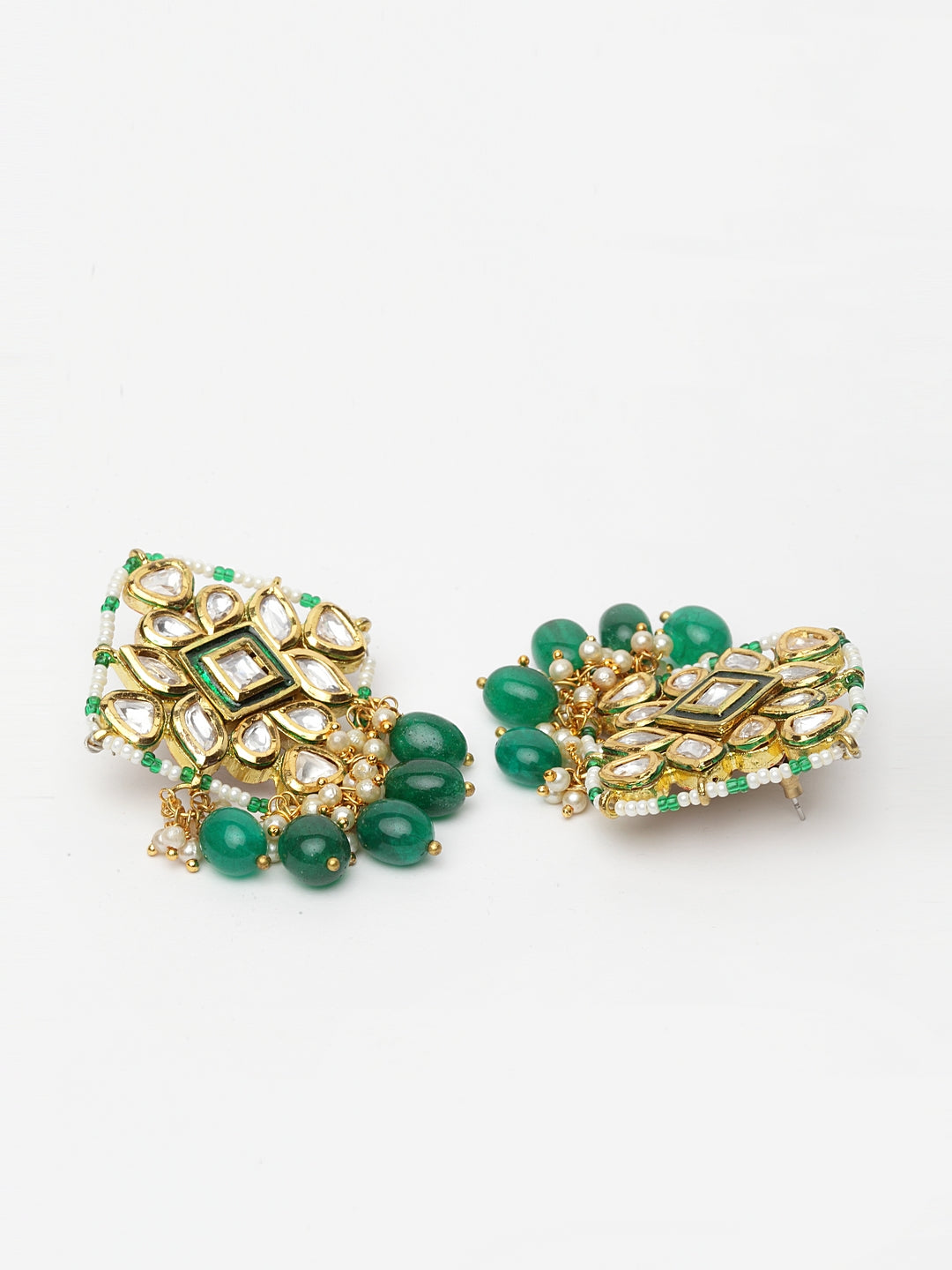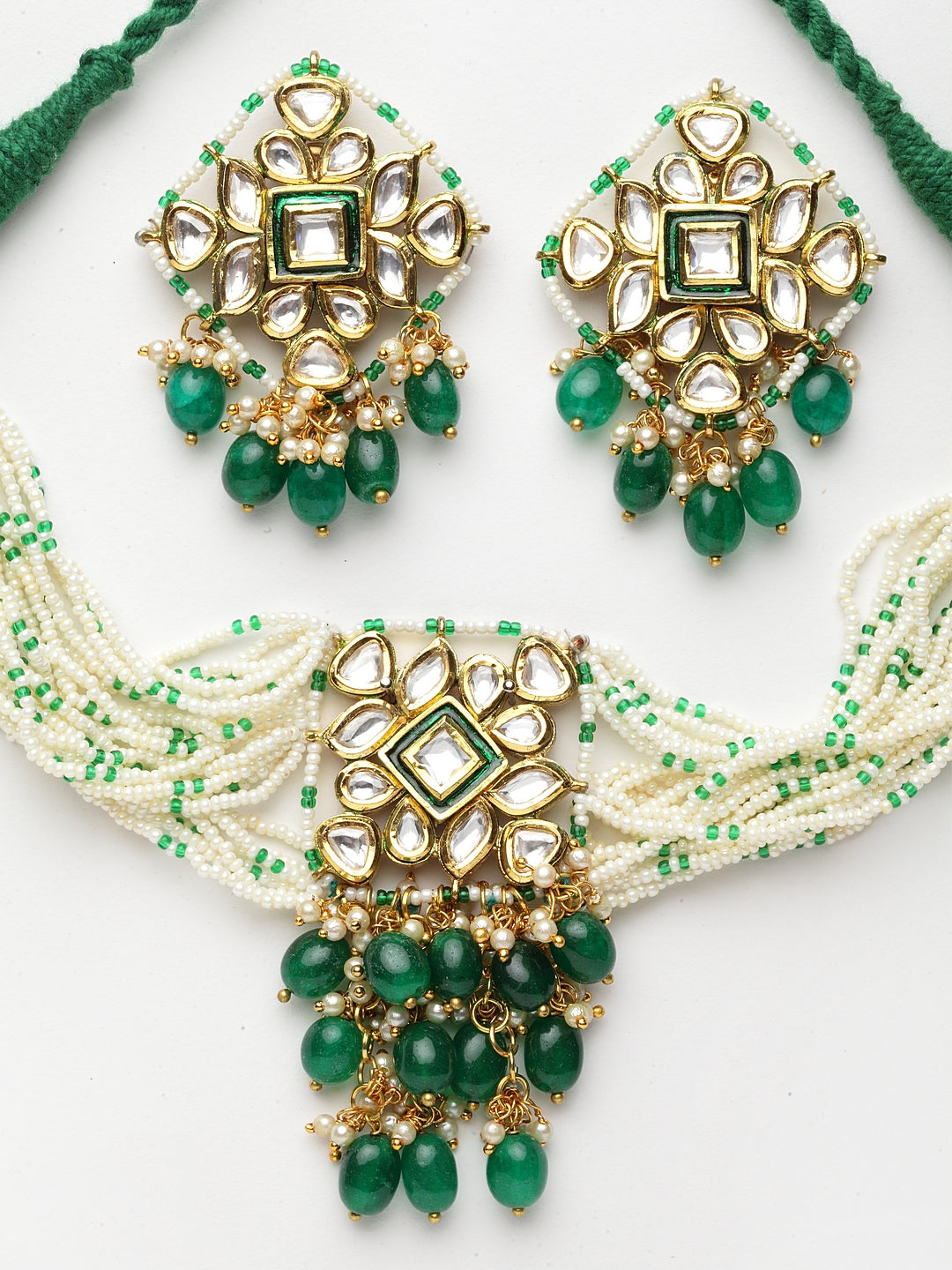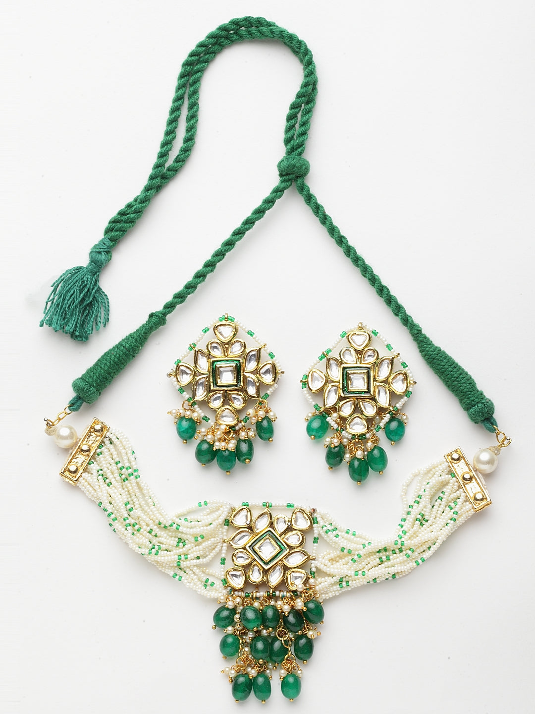 Green & Chokar Necklace And Earring With Kundan &; Category Of Jewellery Is Jewellery Set; Sub Category Is Chokar With Earrings; Ideal For Women; Base Color Is Green; Gemstones Used - Kundan; Plating Is Gold-Plated; Base Metal Is Alloy; Other Material Used - ; Size Is Freesize; Adjustable - Yes; Weight Is 123 Gms; Mesaurements - Length Of Earring= 6 Cm; Width Of Earring =4 Cm; Length Of Necklace =57 Cm; Width Of Necklace = 4 Cm; Content