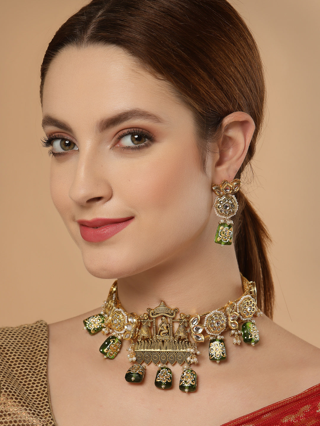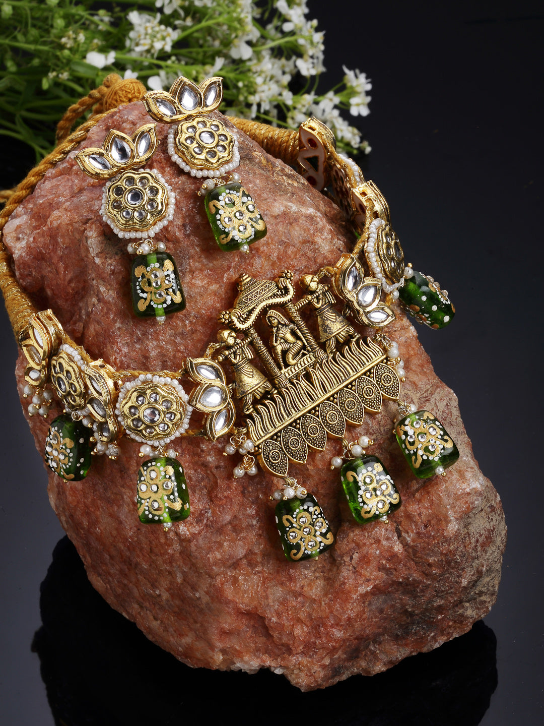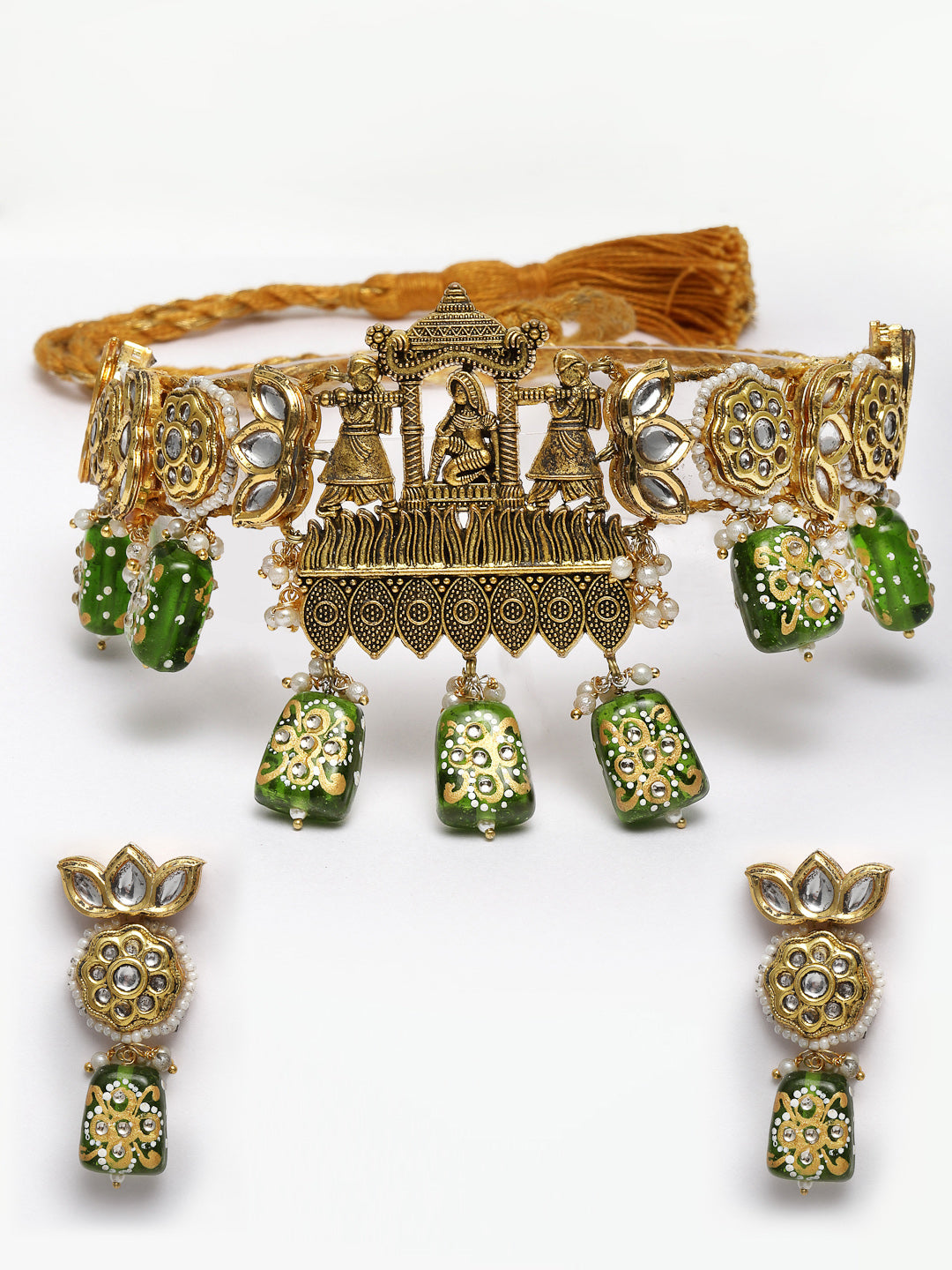Antique Polished Doli Neck Pc Poped Up With Colors Ad Handmade Dori Of Mustard Color Uplift This Pc Next Level... Kundan Doli And Stones With Kundan Work All 3 Different Elements In One.; Category Of Jewellery Is Jewellery Set; Sub Category Is Necklace With Earring; Ideal For Women; Color Is Green, Gold, White; Gemstones Used - Kundan, Pearls, Natural Stones, Faux Emerald; Plating Is Gold-Plated; Base Metal Is Alloy; Other Material Used - Adjustable Dori; Size Is Freesize; Adjustable - Yes; Weight Is 123 Gms; Mesaurements - Length Of Earring= 4.6 Cm; Width Of Earring =3.1 Cm; Length Of Necklace =45.7 Cm; Width Of Necklace = 6.6 Cm; Adjustable - Yes; Content 1 Necklace