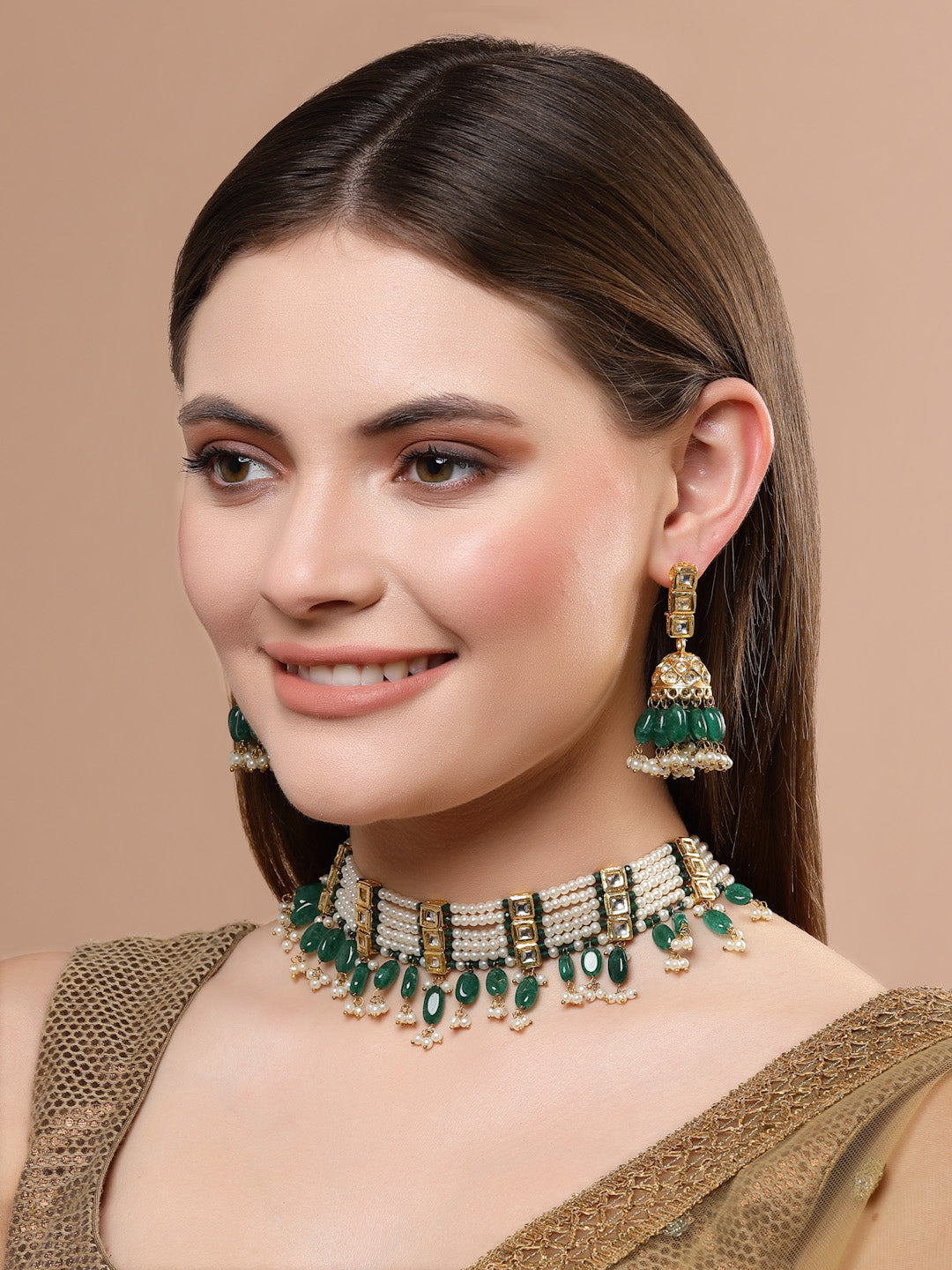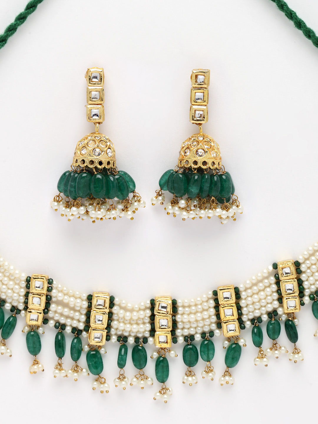 Kundan Lines With Precious Stone Green And Pearl In Handmade Dori Is What Makes This Pc Unique Chokar Of All Times.; Category Of Jewellery Is Jewellery Set; Sub Category Is Necklace With Earring; Ideal For Women; Color Is Green, Gold, White, Cream; Gemstones Used - Kundan, American Diamonds, Pearls, Natural Stones, Faux Emerald; Plating Is Gold-Plated; Base Metal Is Alloy; Other Material Used - Adjustable Dori; Size Is Freesize; Adjustable - Yes; Weight Is 107 Gms; Mesaurements - Length Of Earring= 5.2 Cm; Width Of Earring =2.1 Cm; Length Of Necklace =32 Cm; Width Of Necklace = 3 Cm; Adjustable - Yes; Content 1 Necklace And 1 Pair Earring
