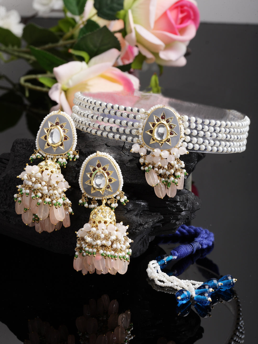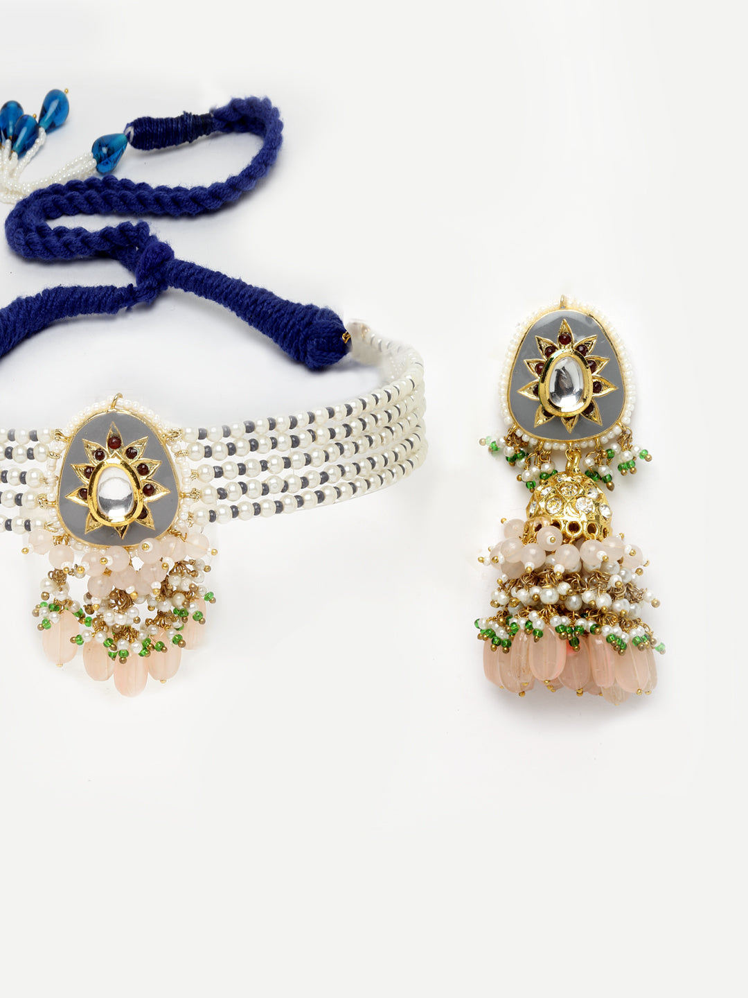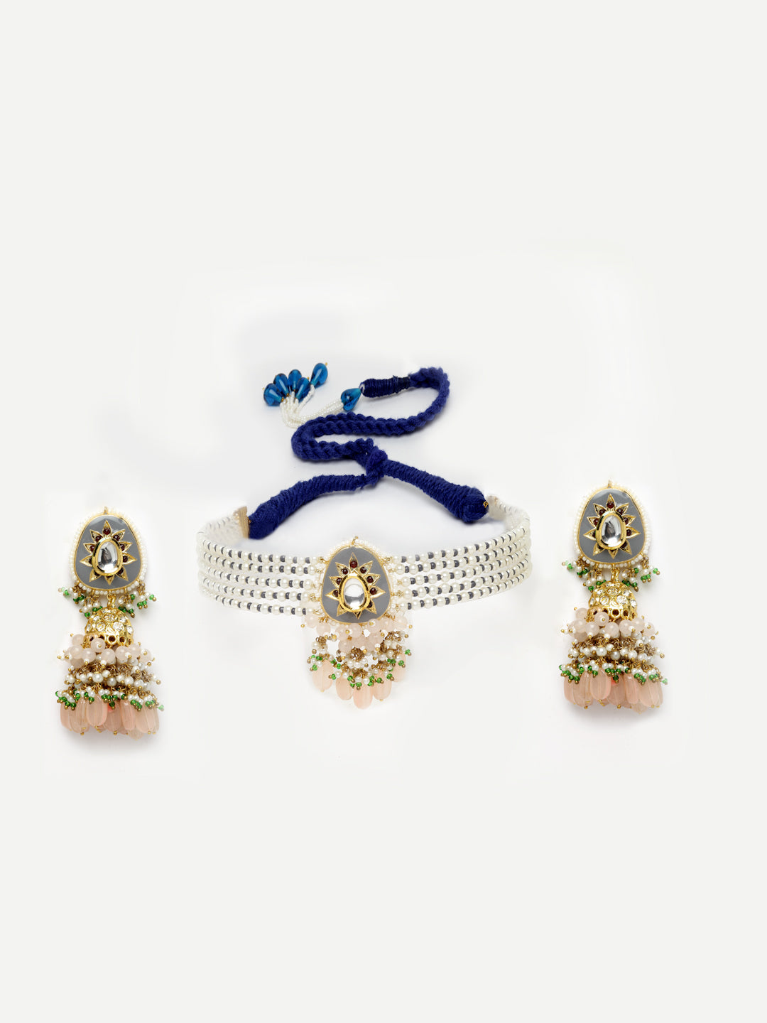 Grey Meenakari Chokar And Jhumki Highlighted With Pearls And Pink Sapphire Is Class Apart.; Category Of Jewellery Is Jewellery Set; Sub Category Is Necklace With Earring; Ideal For Women; Color Is Grey, Pink, Blue, Green, White, Gold; Gemstones Used - Kundan, American Diamonds, Pearls, Natural Stones; Plating Is Gold-Plated; Base Metal Is Alloy; Other Material Used - Adjustable Dori; Size Is Freesize; Adjustable - Yes; Weight Is 115 Gms; Mesaurements - Length Of Earring= 7.9 Cm; Width Of Earring =4 Cm; Length Of Necklace =36 Cm; Width Of Necklace = 2.7 Cm; Adjustable - Yes; Content 1 Necklace And 1 Pair Earring