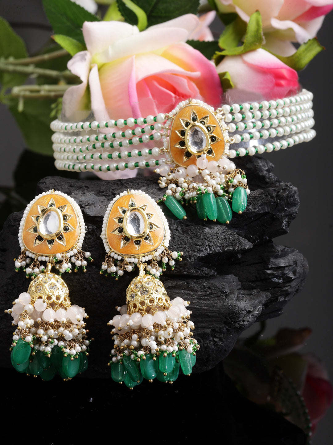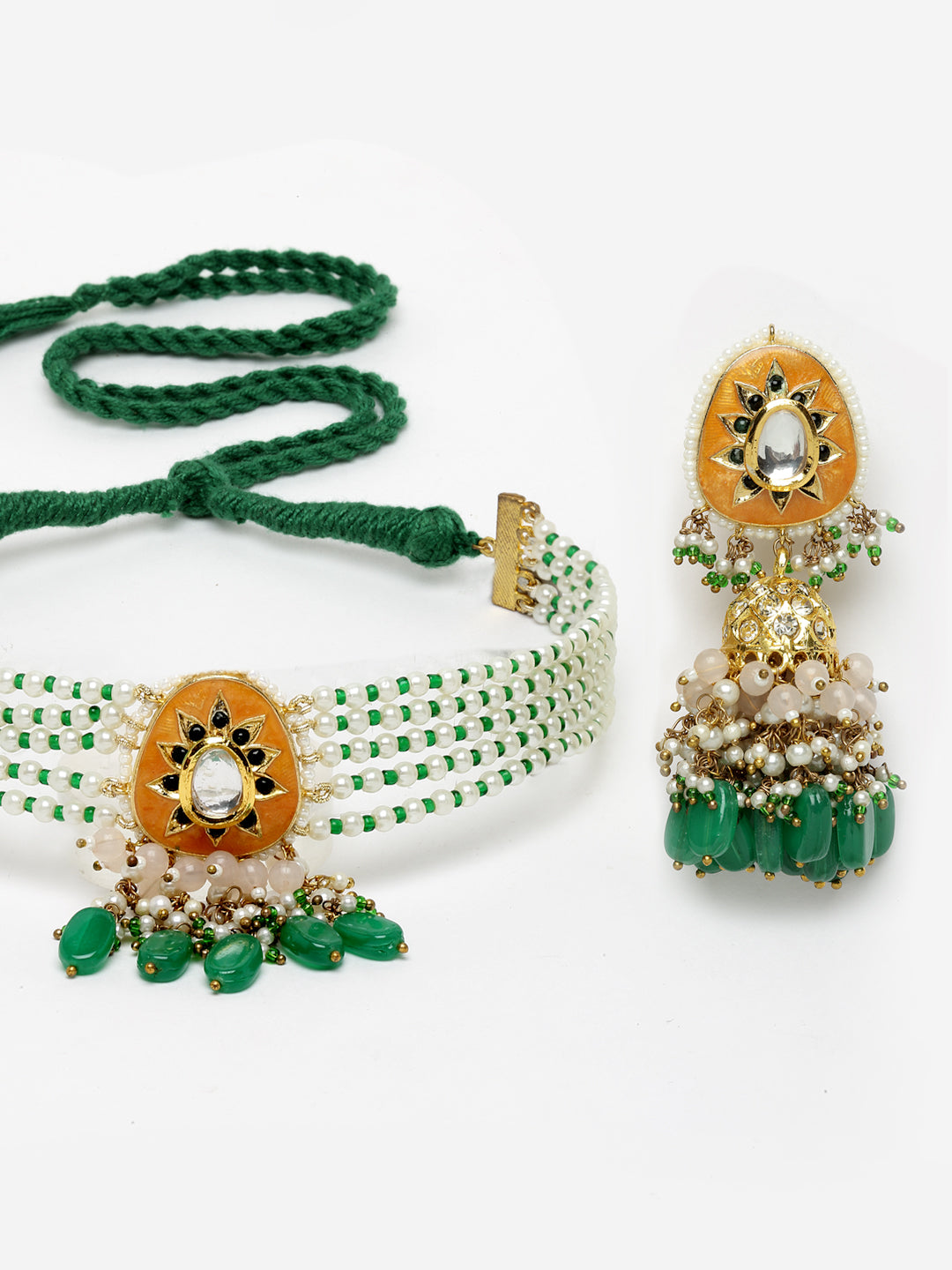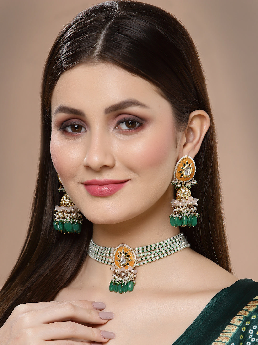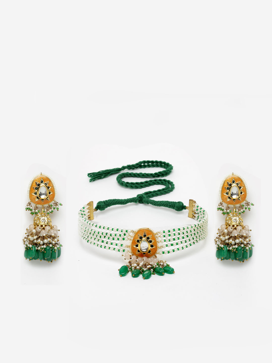 Green Sapphire Pearls And Yellow Meenakari Chokar And Jhumki Set Is The Go Getter For This Wedding Season. ; Category Of Jewellery Is Jewellery Set; Sub Category Is Necklace With Earring; Ideal For Women; Color Is Orange, Green, Pink, Gold, White; Gemstones Used - Kundan, Pearls, American Diamonds, Pearls, Natural Stones; Plating Is Gold-Plated; Base Metal Is Alloy; Other Material Used - Adjustable Dori; Size Is Freesize; Adjustable - Yes; Weight Is 113 Gms; Mesaurements - Length Of Earring= 8 Cm; Width Of Earring =3.8 Cm; Length Of Necklace =36.2 Cm; Width Of Necklace = 3 Cm; Adjustable - Yes; Content 1 Necklace And 1 Pair Earring