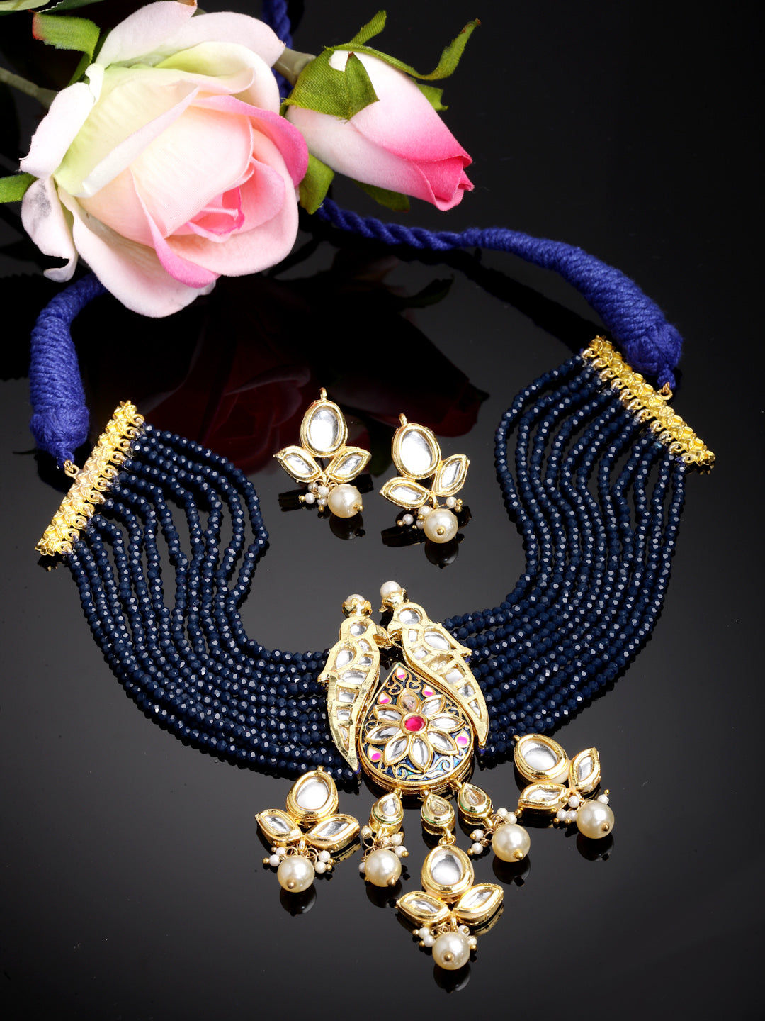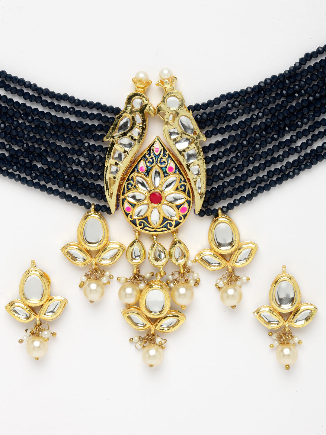 Love Birds And Blue And Highlight Of Multi Color Center Is What Makes This Pc Unique And Stylish; Category Of Jewellery Is Jewellery Set; Sub Category Is Necklace With Earring; Ideal For Women; Color Is Blue, Pink, Gold, White; Gemstones Used - Kundan, Pearls, Natural Stones; Plating Is Gold-Plated; Base Metal Is Alloy; Other Material Used - Adjustable Dori; Size Is Freesize; Adjustable - Yes; Weight Is 75 Gms; Mesaurements - Length Of Earring= 4 Cm; Width Of Earring =2.5 Cm; Length Of Necklace =35.5 Cm; Width Of Necklace = 6.1 Cm; Adjustable - Yes; Content 1 Necklace And 1 Pair Earring