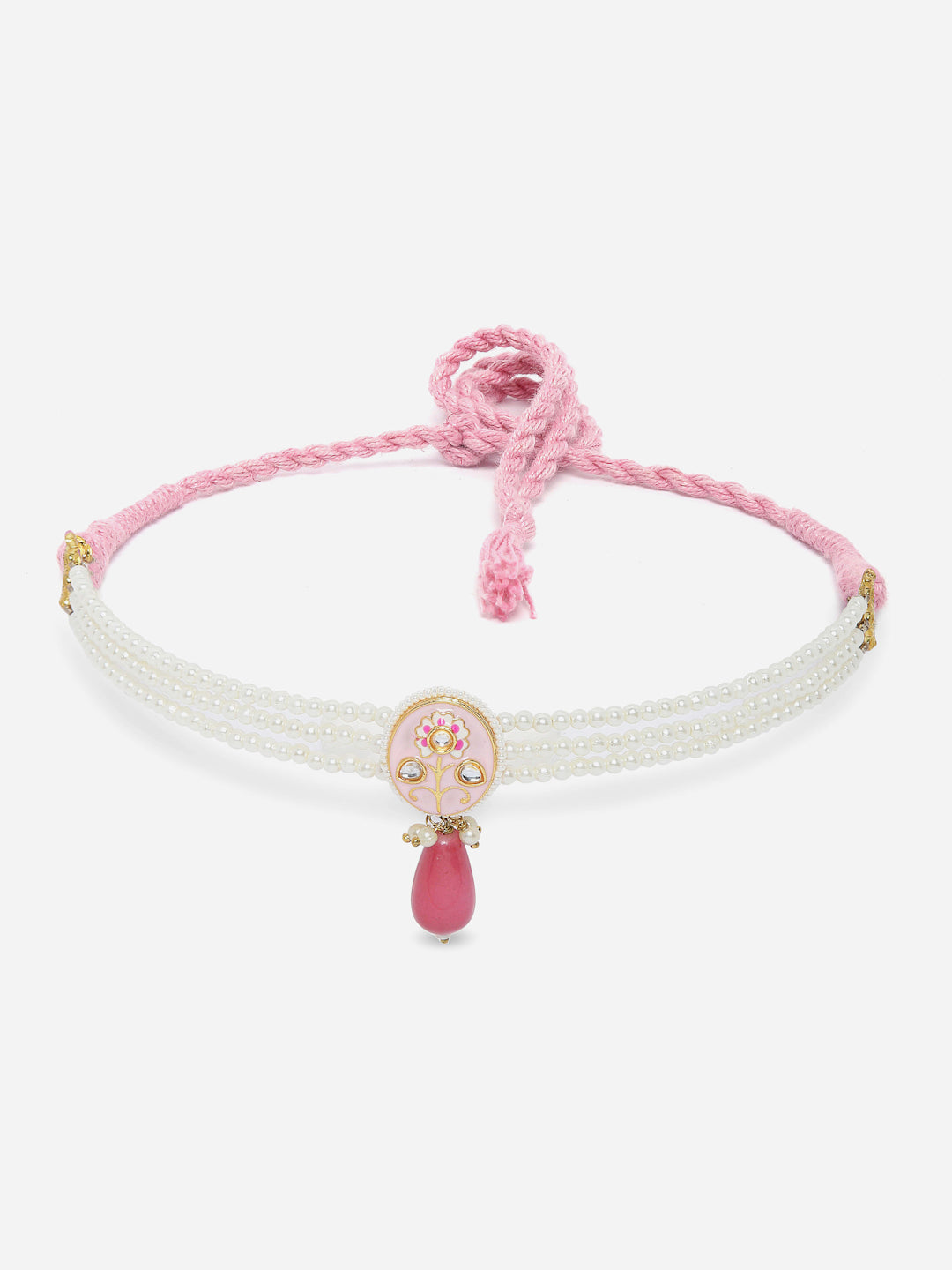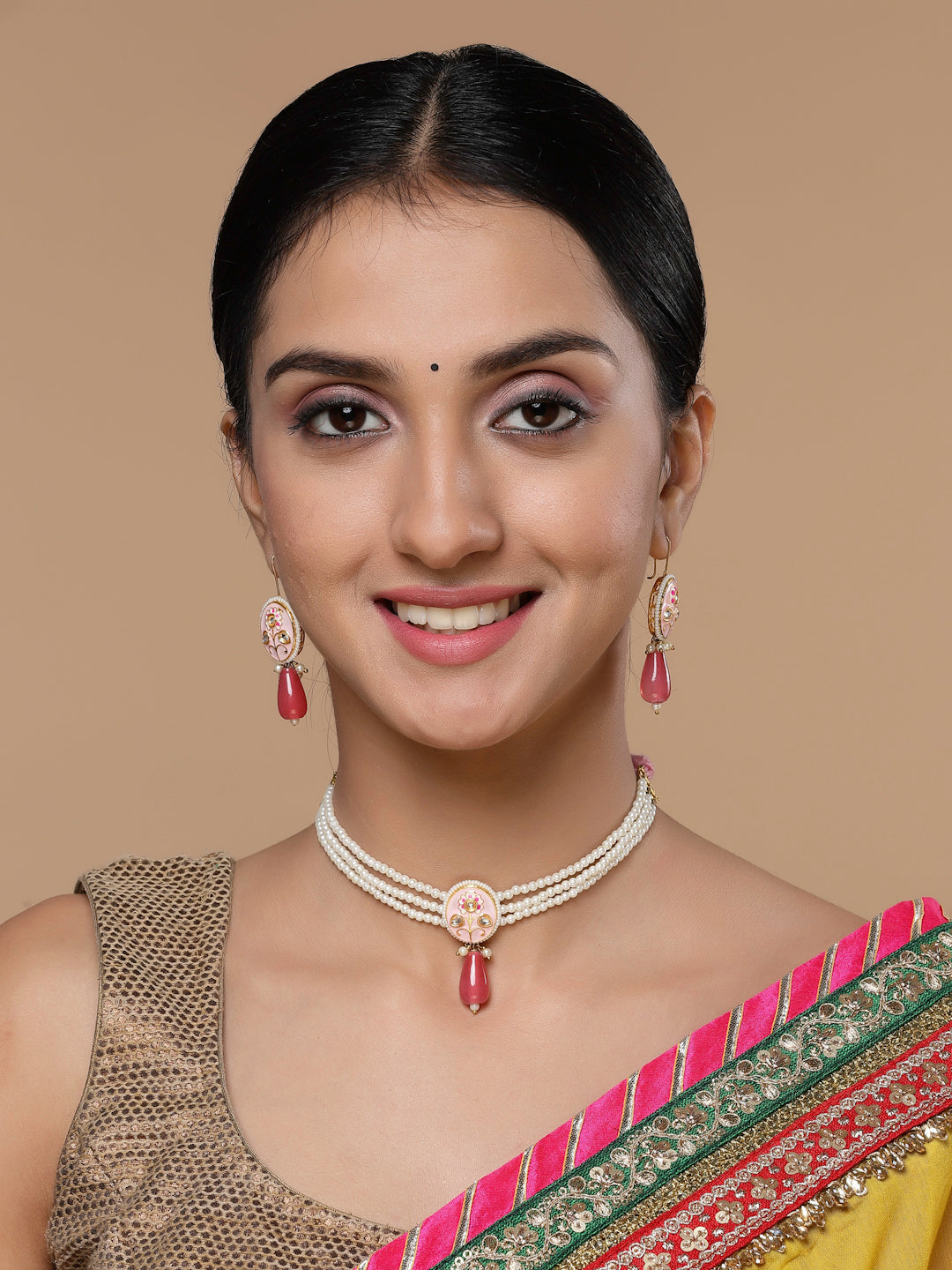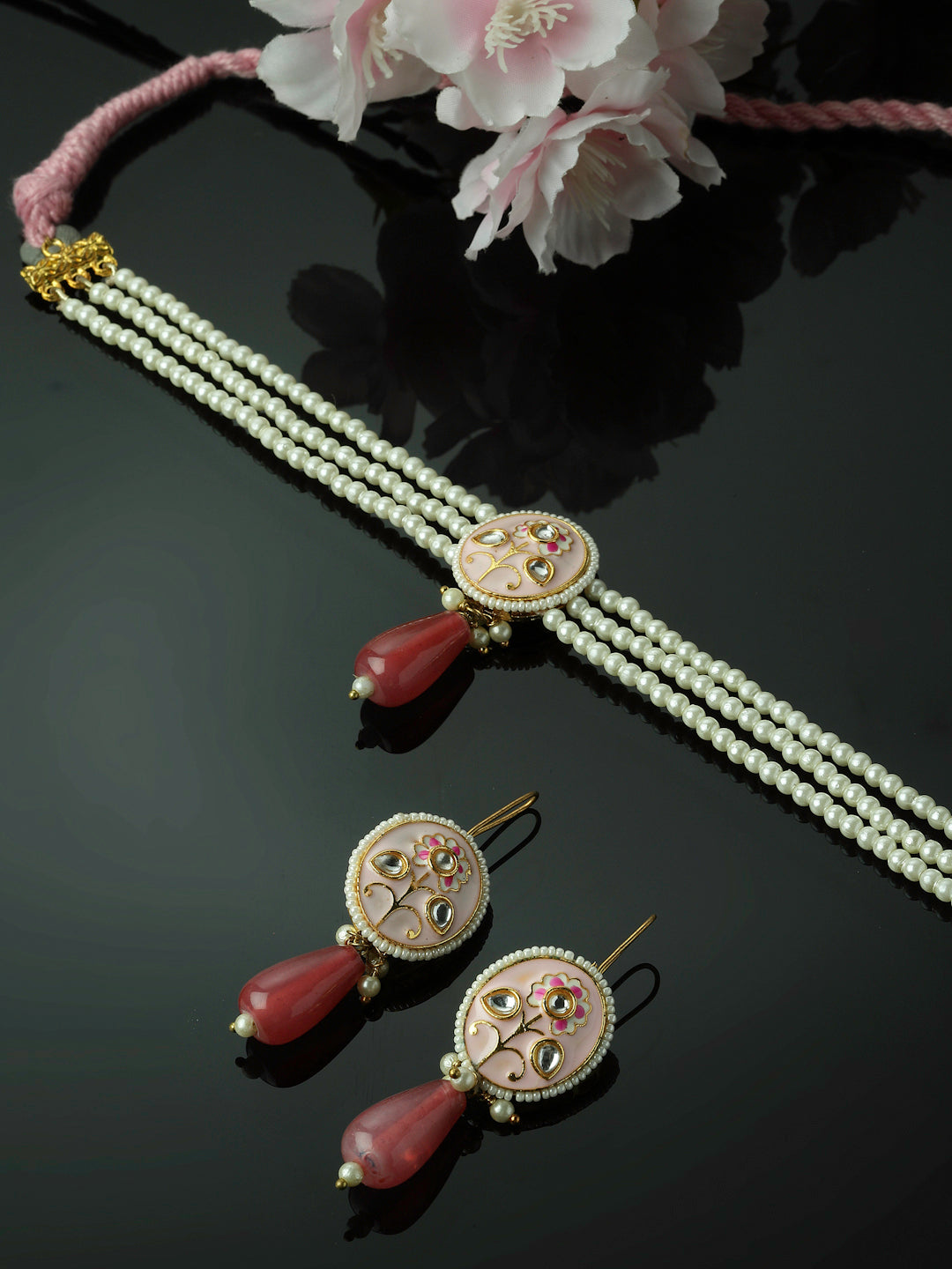 Classic Color Of Pink Meena And Kundan Work In Pearl Wuth Handmade Dori Finish And Super Light Earrings Along Makes This Pc Classy; Category Of Jewellery Is Jewellery Set; Sub Category Is Necklace With Earring; Ideal For Women; Color Is Pink, Gold, White, Cream; Gemstones Used - Kundan, Pearls, Natural Stones; Plating Is Gold-Plated; Base Metal Is Alloy; Other Material Used - Adjustable Dori; Size Is Freesize; Adjustable - Yes; Weight Is 47 Gms; Mesaurements - Length Of Earring= 5 Cm; Width Of Earring =2.1 Cm; Length Of Necklace =42 Cm; Width Of Necklace = 2 Cm; Adjustable - Yes; Content 1 Necklace 1 Pair Earring