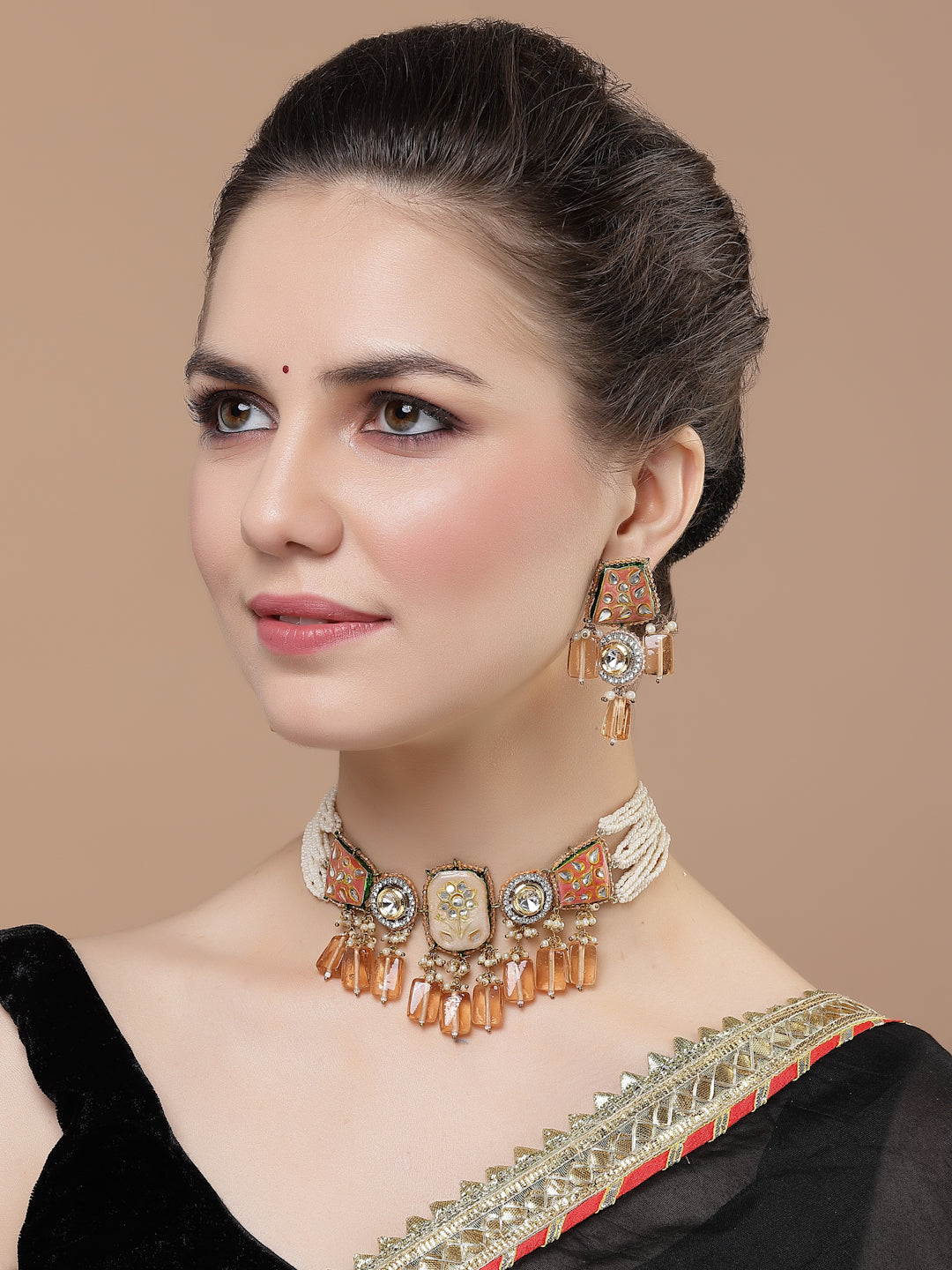 Peach And Ad Styled Kundan With Semi Precious Stone Look; Category Of Jewellery Is Jewellery Set; Sub Category Is Necklace With Earring; Ideal For Women; Color Is Orange, Gold, White, Cream; Gemstones Used - Kundan, American Diamonds, Pearls, Natural Stones; Plating Is Gold-Plated; Base Metal Is Alloy; Other Material Used - Adjustable Dori; Size Is Freesize; Adjustable - Yes; Weight Is 100 Gms; Mesaurements - Length Of Earring= 6.5 Cm; Width Of Earring =5 Cm; Length Of Necklace =45 Cm; Width Of Necklace = 12.5 Cm; Adjustable - Yes; Content 1 Necklace 1 Pair Earring