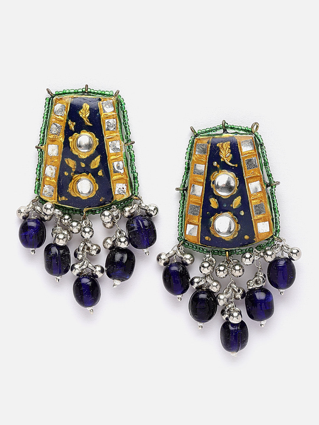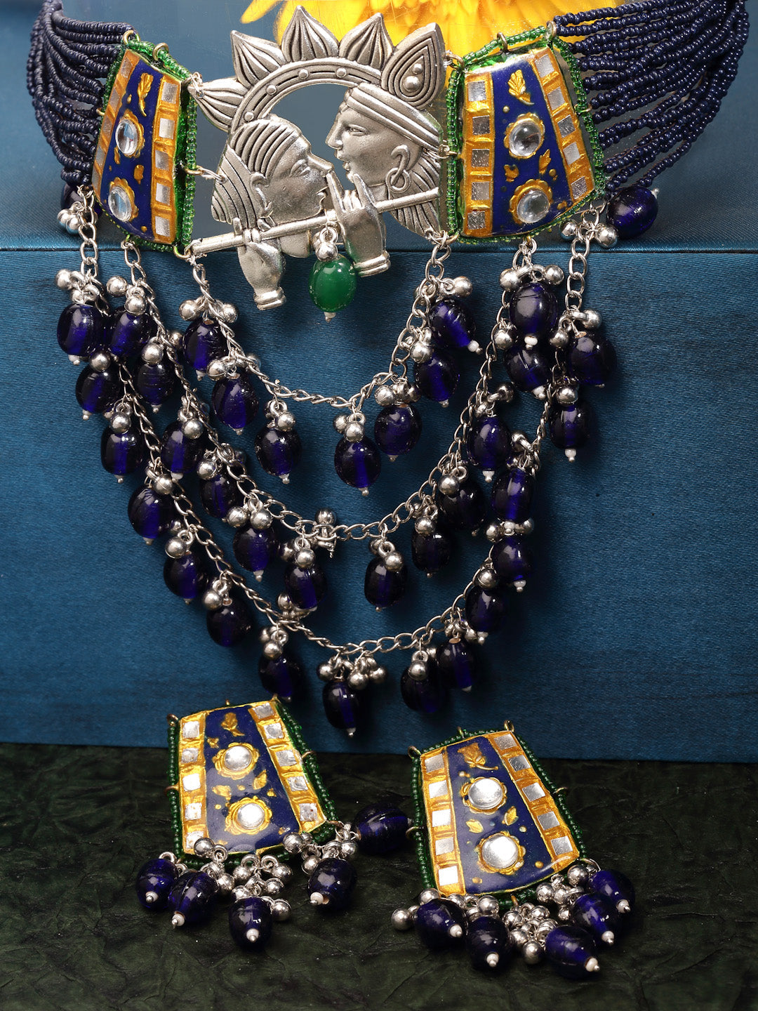 Blue,Kundan With Radha Krishna White Finish Neck Pc And Earring; Category Of Jewellery Is Jewellery Set; Sub Category Is Chokar With Earrings; Ideal For Women; Color Is Blue, Silver, Green, Gold, White; Gemstones Used - Kundan, Pearls, Natural Stones; Plating Is Gold-Plated; Base Metal Is Alloy; Other Material Used - Adjustable Dori; Size Is Freesize; Adjustable - Yes ; Weight Is 121 Gms; Mesaurements - Length Of Earring= 7 Cm; Width Of Earring =4 Cm; Length Of Necklace =47 Cm; Width Of Necklace = 12 Cm; Adjustable - Yes ; Content 1 Necklace 1 Pair Earring