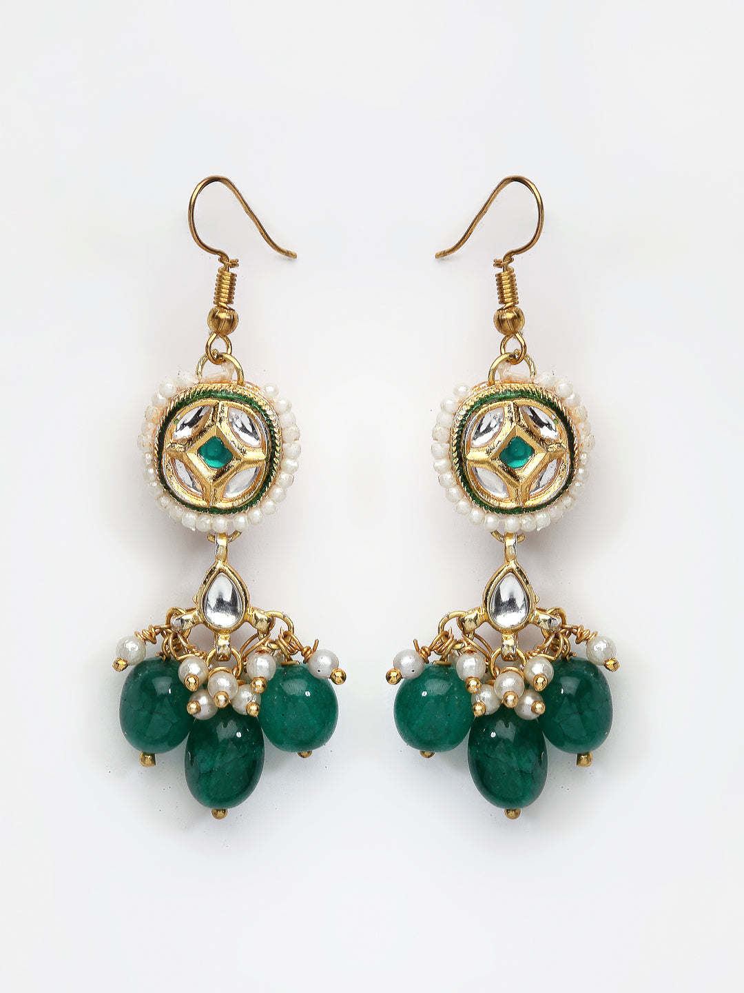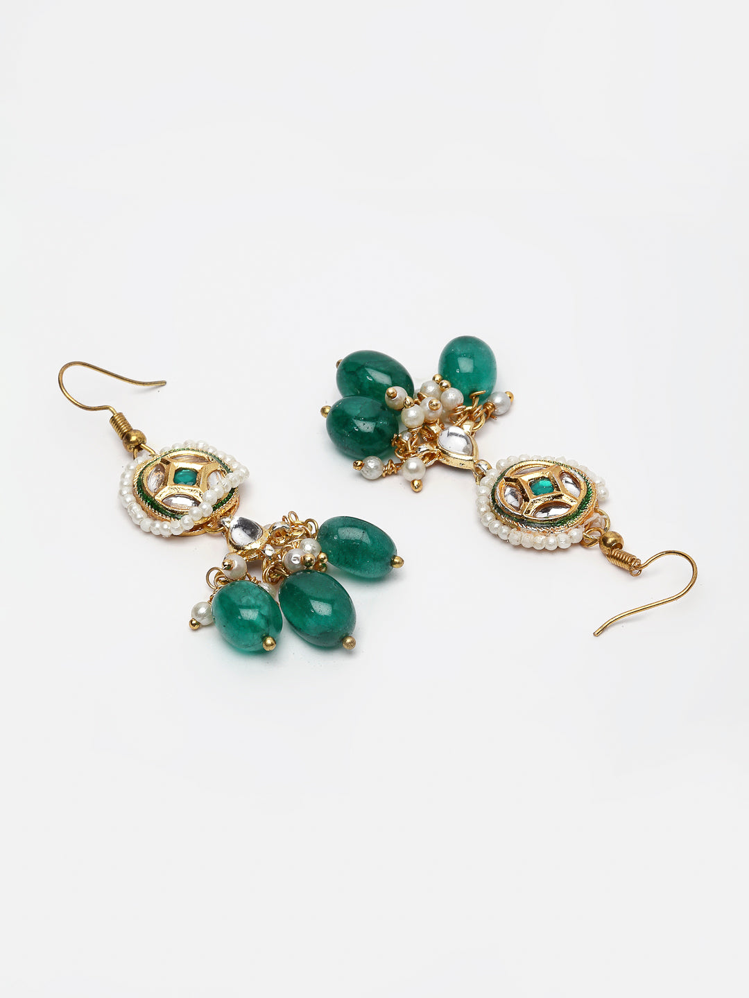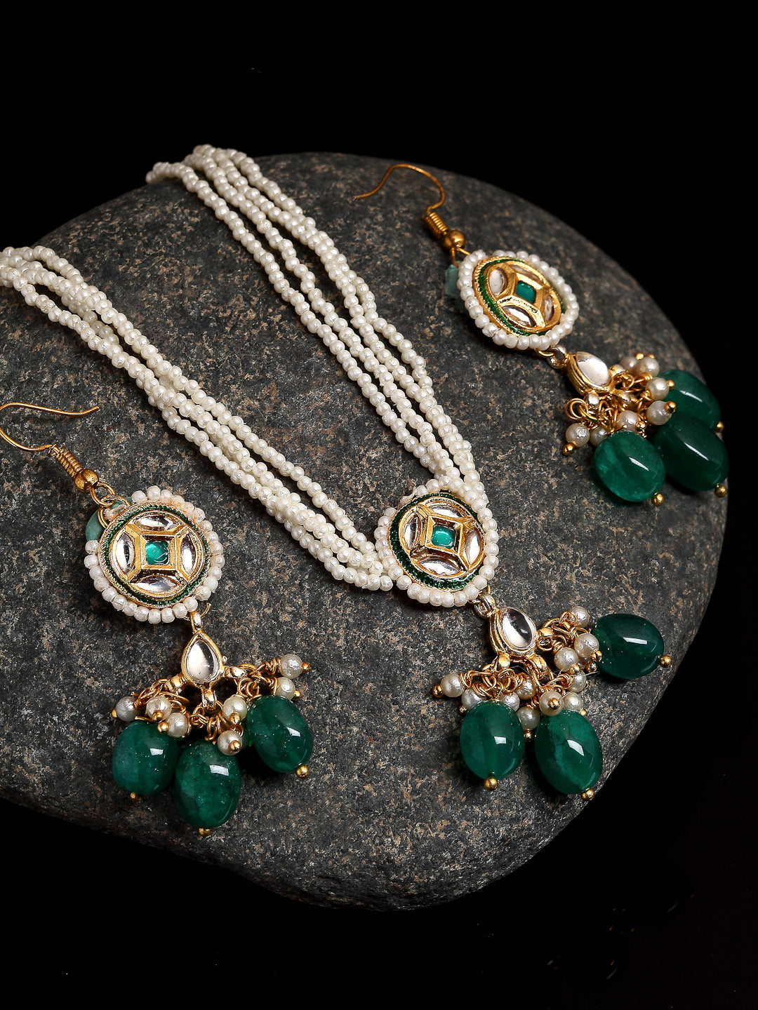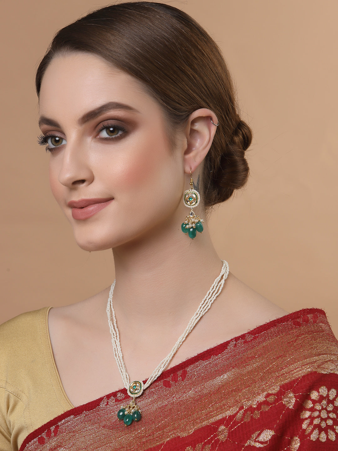 Beauty Lies In The Yes Of Beholder, But When U R Wearing Beautiful Jewellery One Cant Take Eyes Off You. That’S The Magic We Have In Our Handmade Jewellery Pcs. Style Your Smile And Shine Along With This Neckpc And Earring Combo.; Category Of Jewellery Is Jewellery Set; Sub Category Is Necklace With Earring; Ideal For Women; Color Is Green, White, Gold; Gemstones Used - Kundan, Pearls, Natural Stones, Faux Emerald; Plating Is Gold-Plated; Base Metal Is Alloy; Other Material Used - None; Size Is Freesize; Adjustable - No; Weight Is 25 Gms; Mesaurements - Length Of Earring= 6 Cm; Width Of Earring =2.5 Cm; Length Of Necklace =40 Cm; Width Of Necklace = 3.5 Cm; Adjustable - No; Content 1 Necklace And 1 Pair Earring