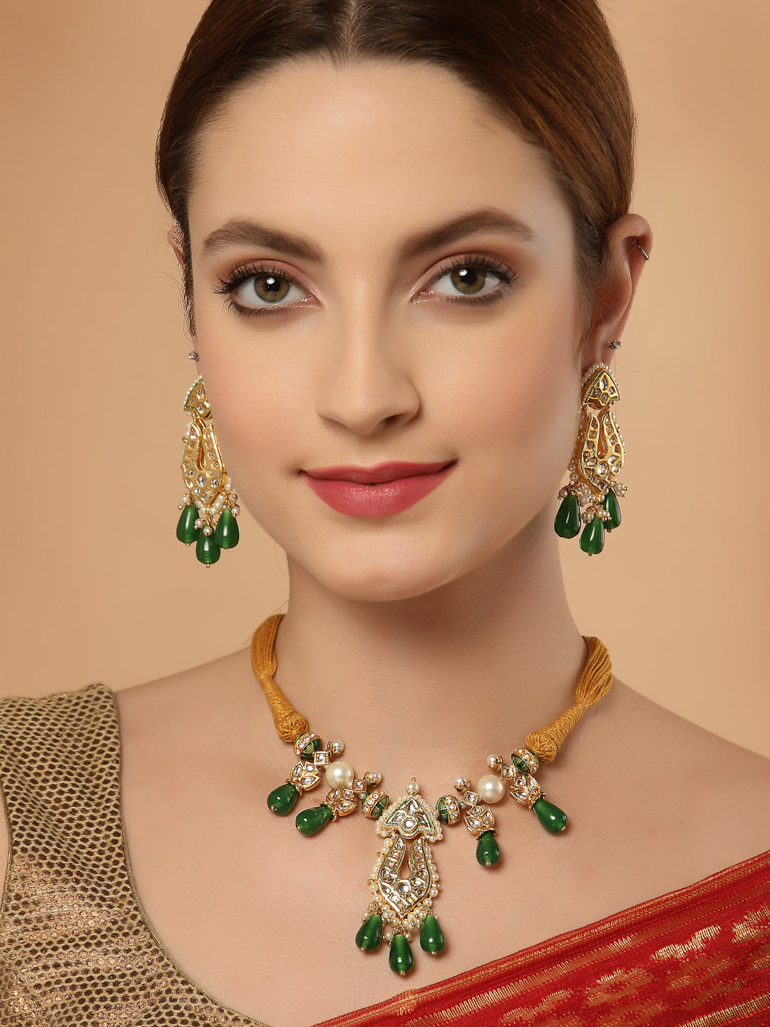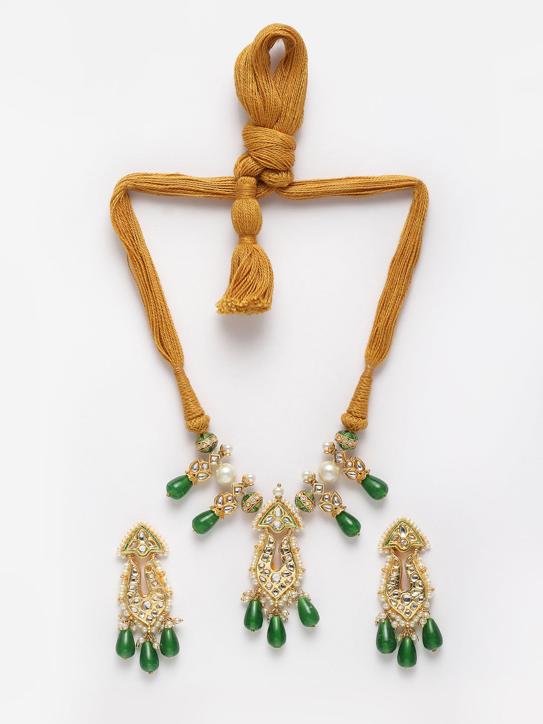 Class Of Kundan Pc With Handmade Dori..This Pc Is Super Classy And Elegance Overloaded.. Have Bold Eyes And Flaunt This To Give Urself A Class Entry Of All Times.; Category Of Jewellery Is Jewellery Set; Sub Category Is Necklace With Earring; Ideal For Women; Color Is Green, Gold, Orange; Gemstones Used - Kundan, Pearls, Natural Stones, Faux Emerald; Plating Is Gold-Plated; Base Metal Is Alloy; Other Material Used - Adjustable Dori; Size Is Freesize; Adjustable - Yes; Weight Is 58 Gms; Mesaurements - Length Of Earring= 7.5 Cm; Width Of Earring =2.7 Cm; Length Of Necklace =55 Cm; Width Of Necklace = 8 Cm; Adjustable - Yes; Content 1 Necklace And 1 Pair Earring