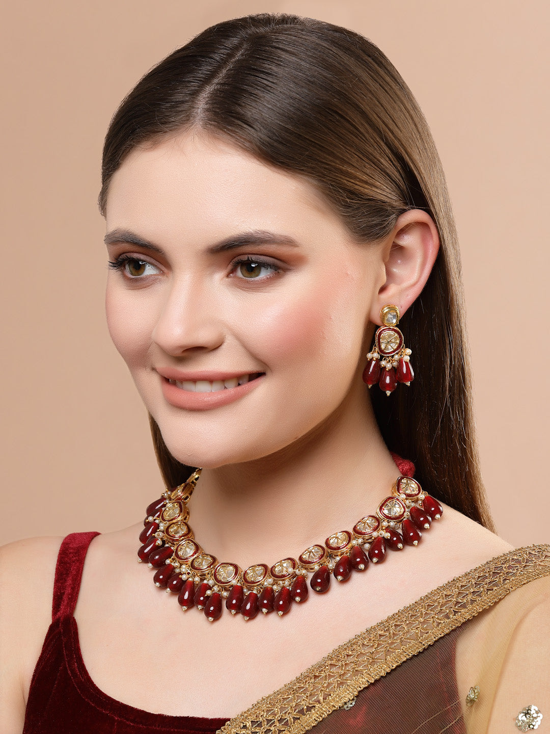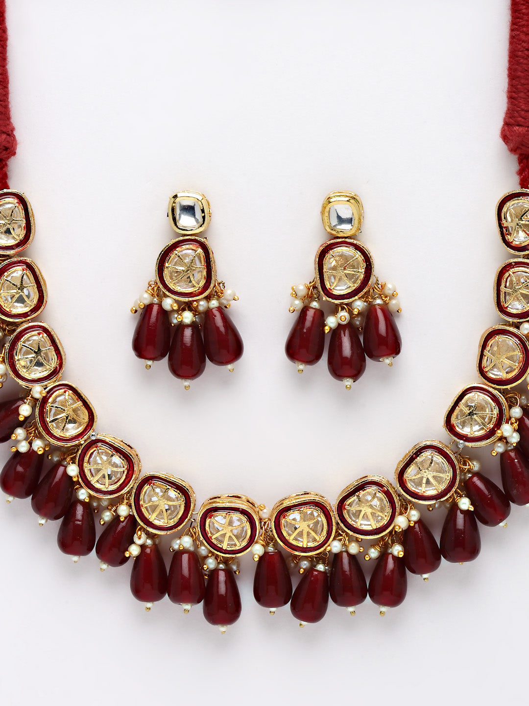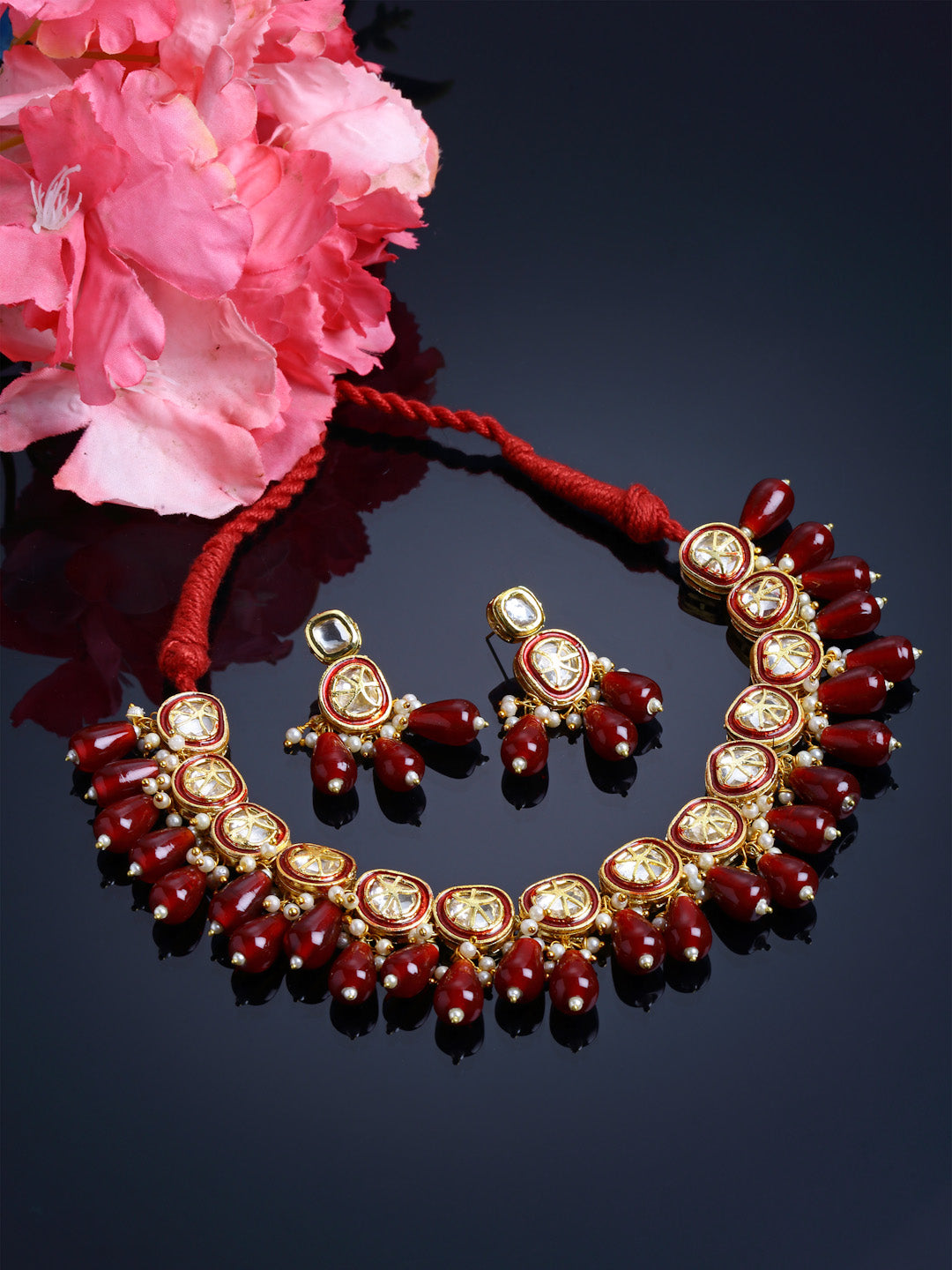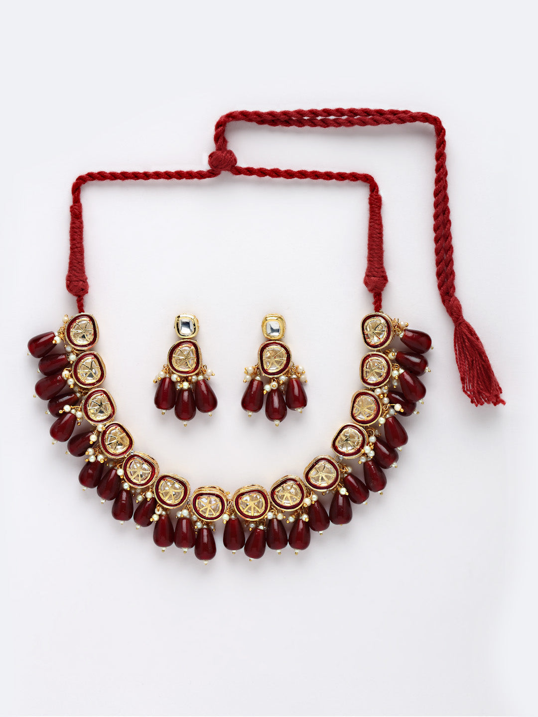 Red And Kundan In Handmade Dori Neckline Makes This Pc Unique; Category Of Jewellery Is Jewellery Set; Sub Category Is Necklace With Earring; Ideal For Women; Color Is Red, Gold, White, Cream; Gemstones Used - Kundan, Pearls, Natural Stones; Plating Is Gold-Plated; Base Metal Is Alloy; Other Material Used - Adjustable Dori; Size Is Freesize; Adjustable - Yes; Weight Is 117 Gms; Mesaurements - Length Of Earring= 3.6 Cm; Width Of Earring =1.9 Cm; Length Of Necklace =65 Cm; Width Of Necklace = 4 Cm; Adjustable - Yes; Content 1 Necklace And 1 Pair Earring