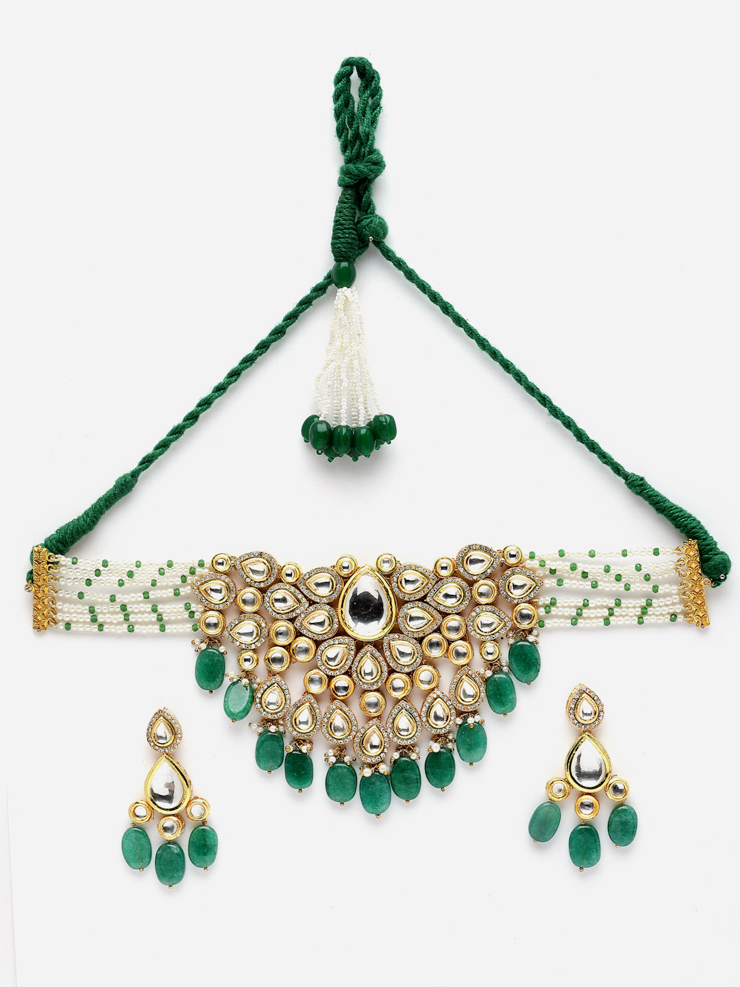 Kundan Neck Pc With Highlight Of Green Stone Drops And Pearls With Sabya Inspired Neck Pc; Category Of Jewellery Is Jewellery Set; Sub Category Is Necklace With Earring; Ideal For Women; Color Is Green, Gold, White; Gemstones Used - Kundan, Pearls, Natural Stones; Plating Is Gold-Plated; Base Metal Is Alloy; Other Material Used - Adjustable Dori; Size Is Freesize; Adjustable - Yes; Weight Is 200 Gms; Mesaurements - Length Of Earring= 7 Cm; Width Of Earring =2.9 Cm; Length Of Necklace =40 Cm; Width Of Necklace = 10 Cm; Adjustable - Yes; Content 1 Necklace And 1 Pair Earring