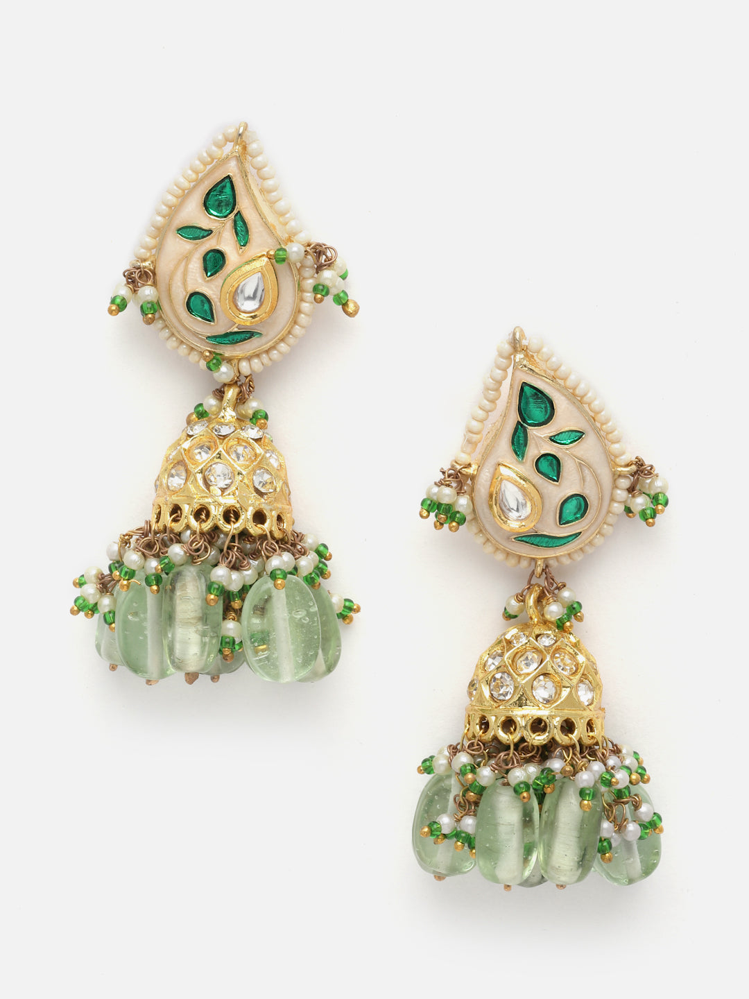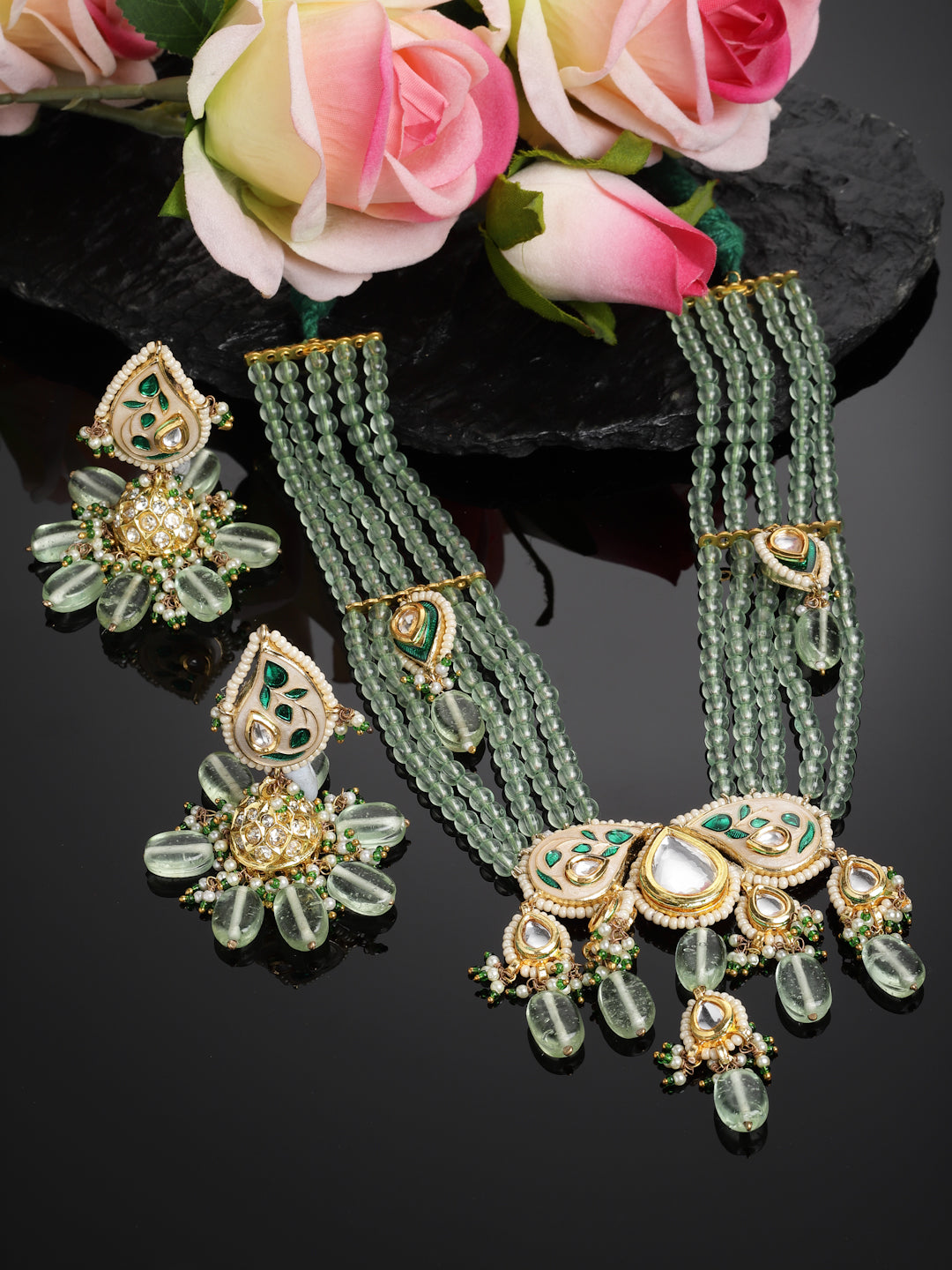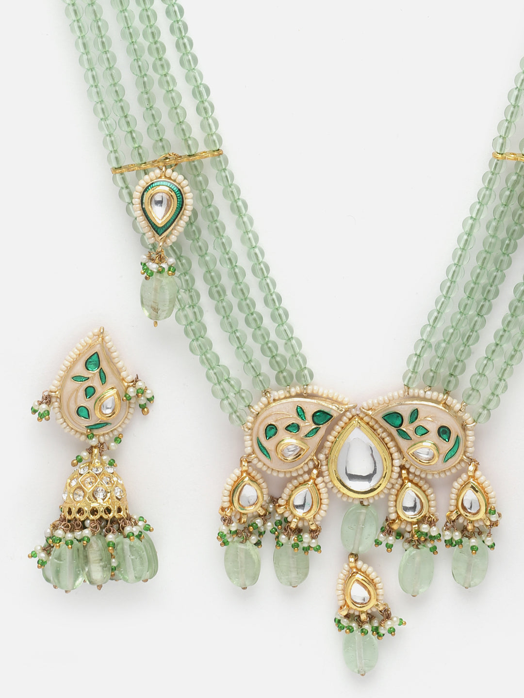 Peacock Meena And Highlighted With Kundan Work; Category Of Jewellery Is Jewellery Set; Sub Category Is Necklace With Earring; Ideal For Women; Color Is Green, Peach, Cream, Gold, White; Gemstones Used - Kundan, Pearls, Natural Stones; Plating Is Gold-Plated; Base Metal Is Alloy; Other Material Used - Adjustable Dori; Size Is Freesize; Adjustable - Yes; Weight Is 125 Gms; Mesaurements - Length Of Earring= 6.1 Cm; Width Of Earring =2.3 Cm; Length Of Necklace =60 Cm; Width Of Necklace = 8.9 Cm; Adjustable - Yes; Content 1 Necklace 1 Pair Earring