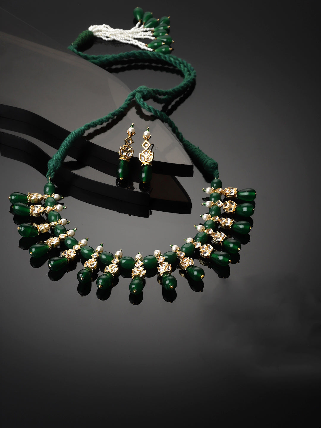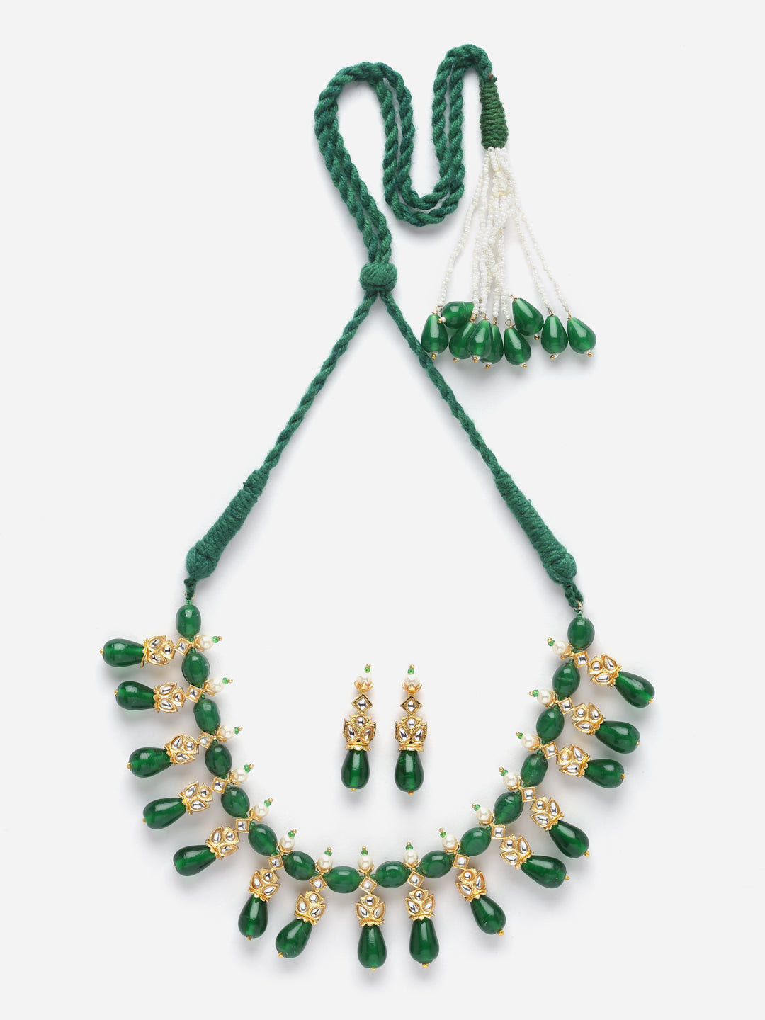Haski Emerlad And Kundan Work Neck Pc; Category Of Jewellery Is Jewellery Set; Sub Category Is Necklace With Earring; Ideal For Women; Color Is Green, Gold, Cream, White; Gemstones Used - Kundan, Pearls, Natural Stones, Faux Emerald; Plating Is Gold-Plated; Base Metal Is Alloy; Other Material Used - Adjustable Dori; Size Is Freesize; Adjustable - Yes; Weight Is 110 Gms; Mesaurements - Length Of Earring= 4.5 Cm; Width Of Earring =1 Cm; Length Of Necklace =51 Cm; Width Of Necklace = 3.5 Cm; Adjustable - Yes; Content 1 Necklace 1 Pair Earring