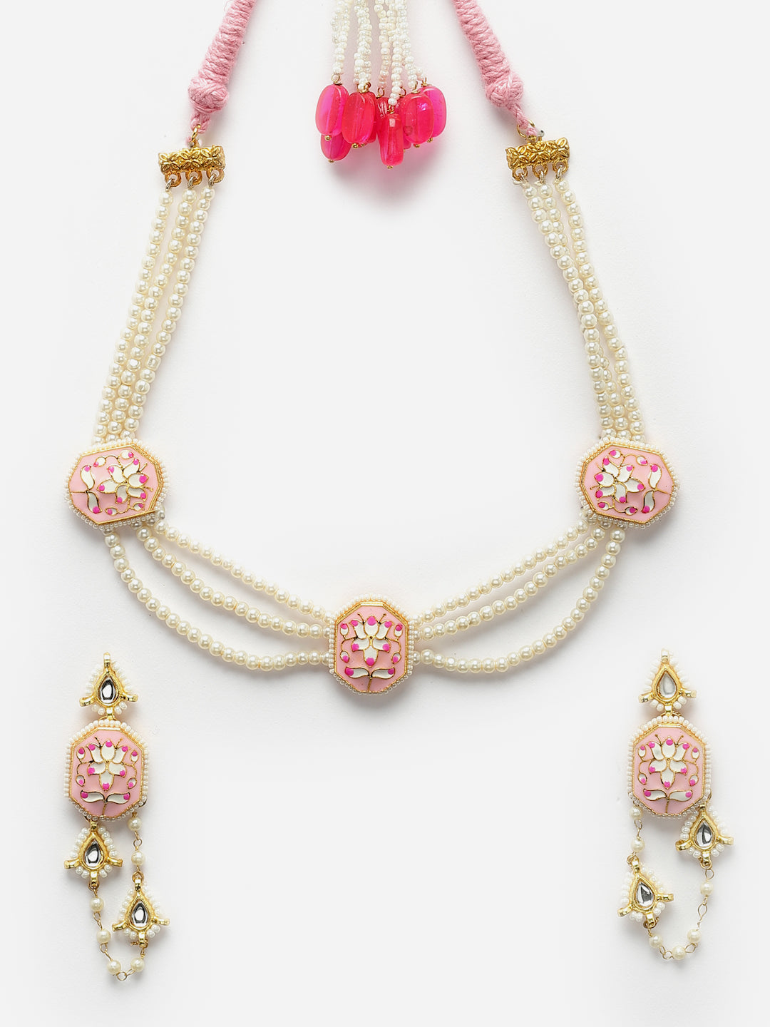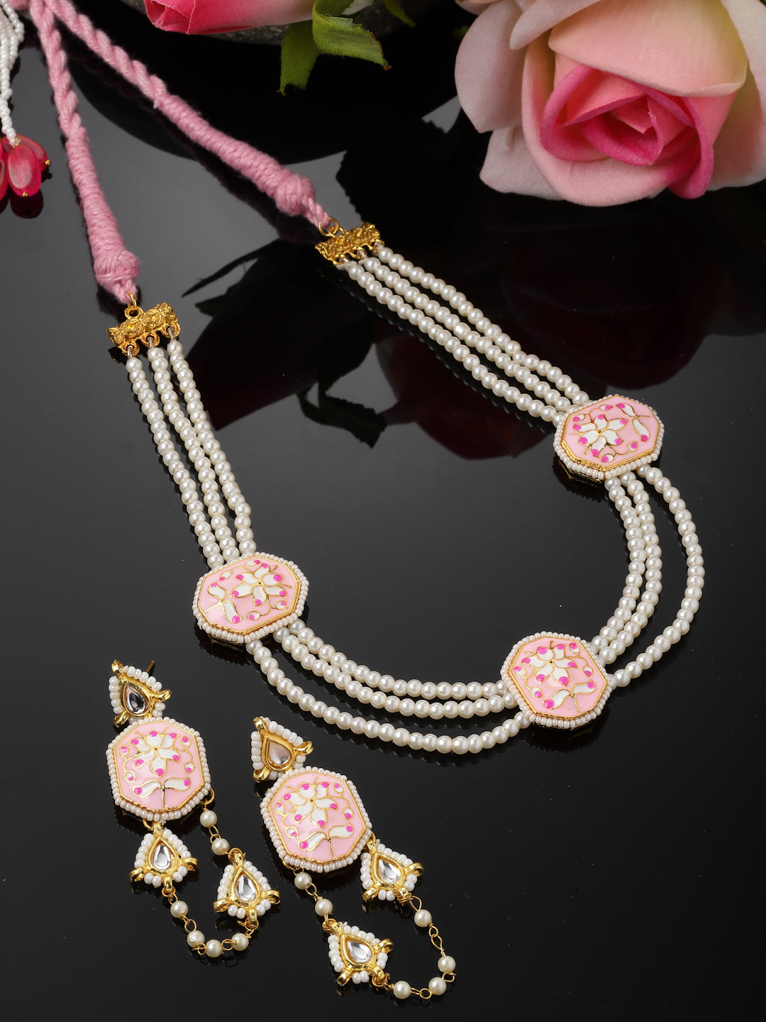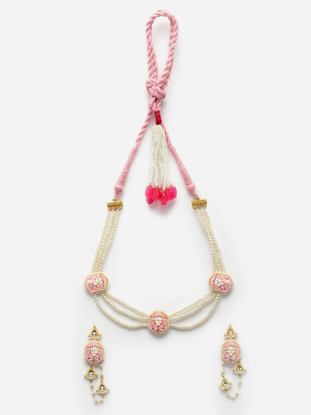 Pink Meenakari Kanthi Along With Earring Is A Class Pc To Go For It; Category Of Jewellery Is Jewellery Set; Sub Category Is Necklace With Earring; Ideal For Women; Color Is Pink, Gold, White, Cream; Gemstones Used - Kundan, Pearls, Natural Stones; Plating Is Gold-Plated; Base Metal Is Alloy; Other Material Used - Adjustable Dori; Size Is Freesize; Adjustable - Yes; Weight Is 50 Gms; Mesaurements - Length Of Earring= 6.5 Cm; Width Of Earring =2 Cm; Length Of Necklace =54 Cm; Width Of Necklace = 2.5 Cm; Adjustable - Yes; Content 1 Necklace 1 Pair Earring