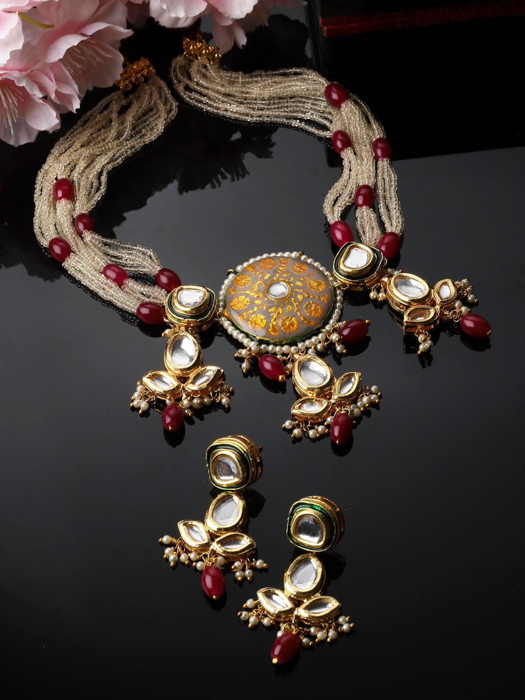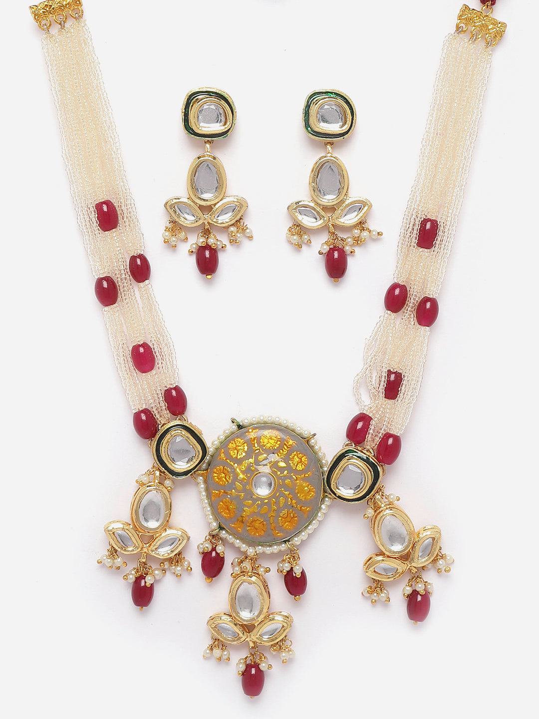 Simple Kundan And Tinch Of Ruby Highlights In The Neck Pc Gives This Pc An Elegant And Classic Look Of All Times; Category Of Jewellery Is Jewellery Set; Sub Category Is Necklace With Earring; Ideal For Women; Color Is Grey, Red, Gold, White, Green, Cream; Gemstones Used - Kundan, Pearls, Natural Stones; Plating Is Gold-Plated; Base Metal Is Alloy; Other Material Used - Adjustable Dori; Size Is Freesize; Adjustable - Yes; Weight Is 150 Gms; Mesaurements - Length Of Earring= 5 Cm; Width Of Earring =2 Cm; Length Of Necklace =70 Cm; Width Of Necklace = 4 Cm; Adjustable - Yes; Content 1 Necklace 1 Pair Earring